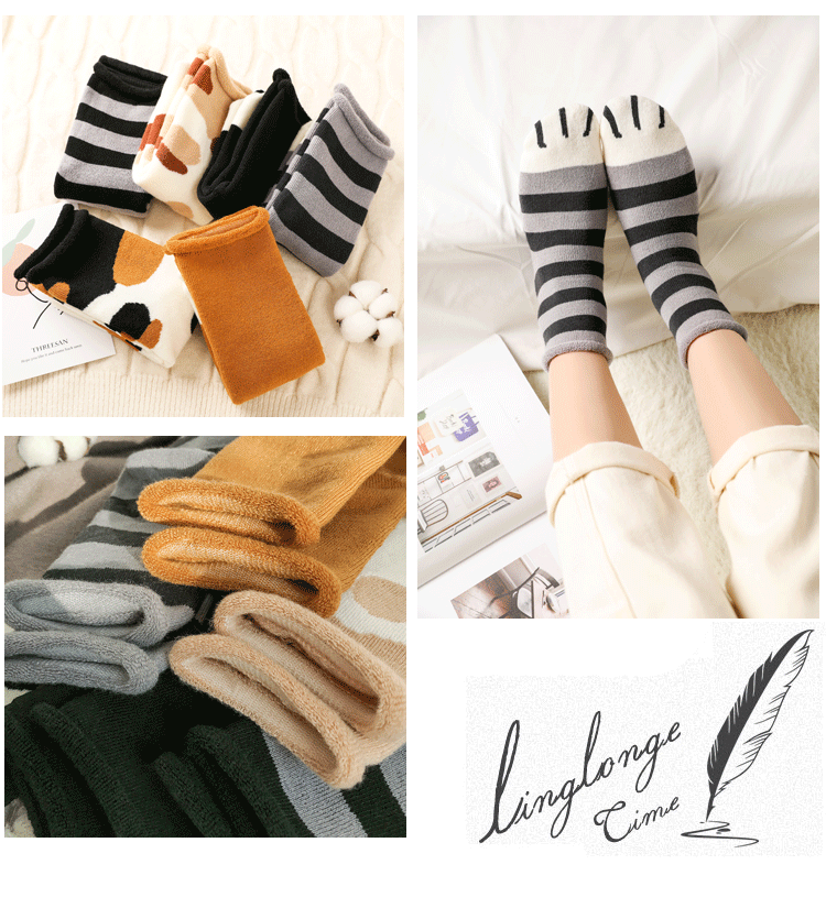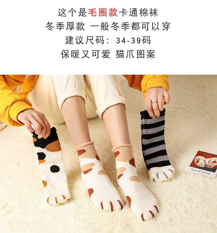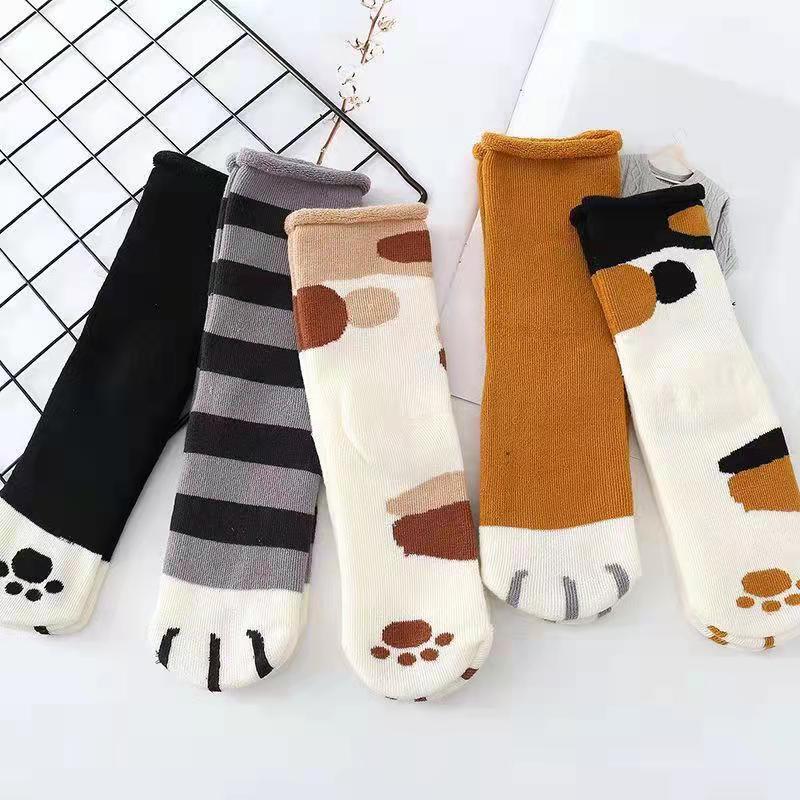 冬天厚款猫爪袜子可爱脚印毛圈加绒棉袜秋冬季保暖日系卡通中筒袜