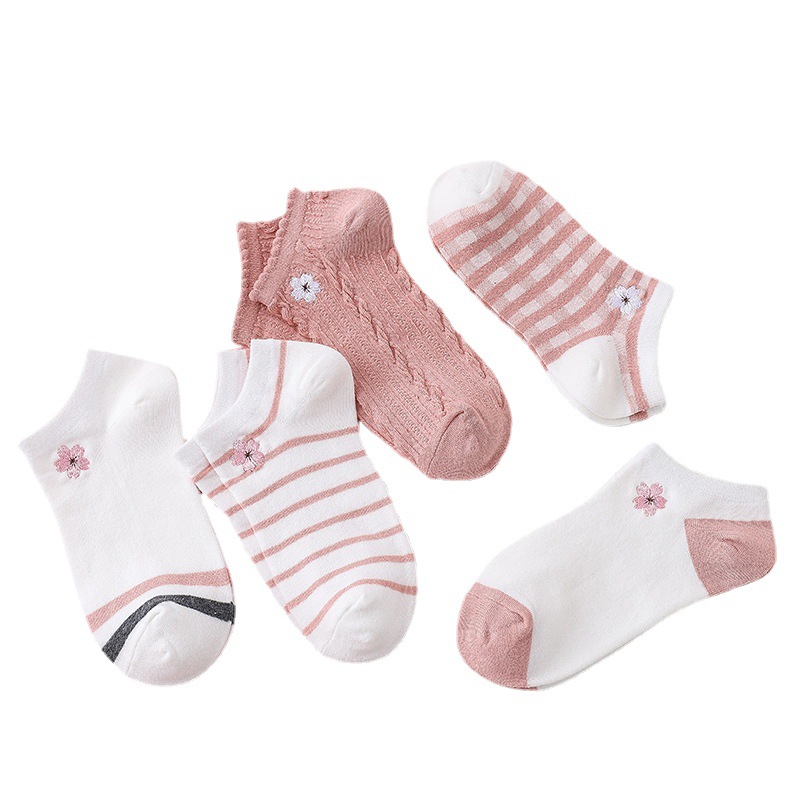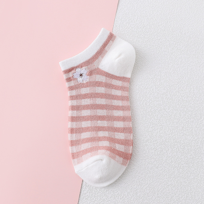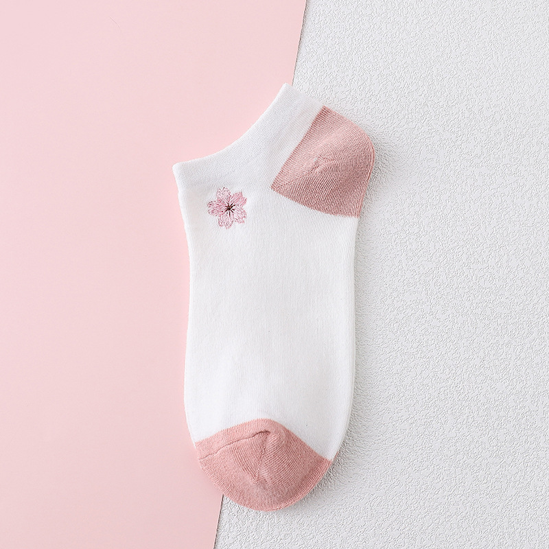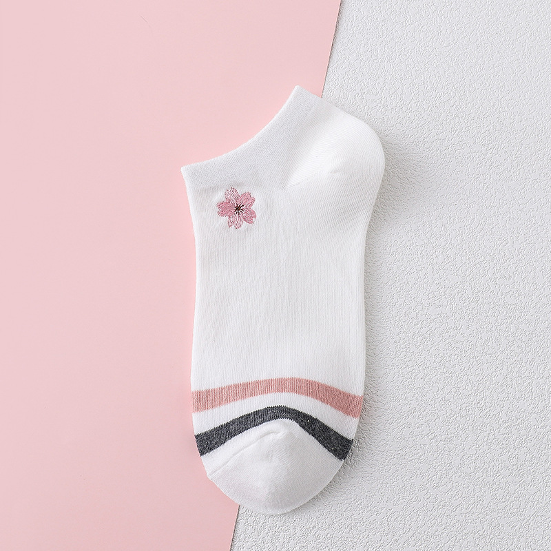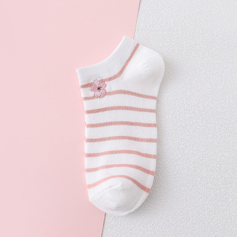 樱花刺绣女船袜夏季薄款护跟刺绣可爱潮夏天浅口短袜条纹棉船袜