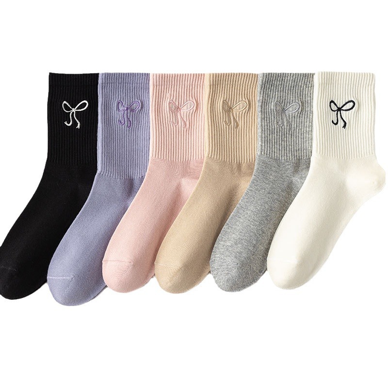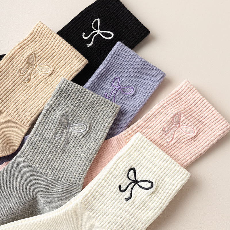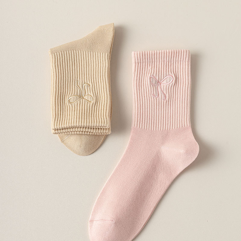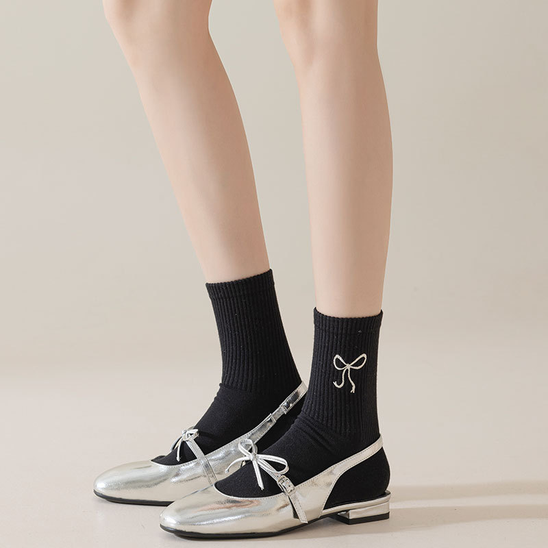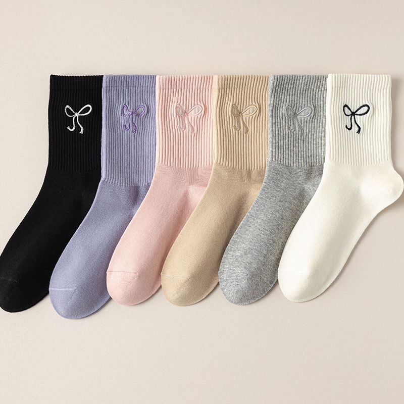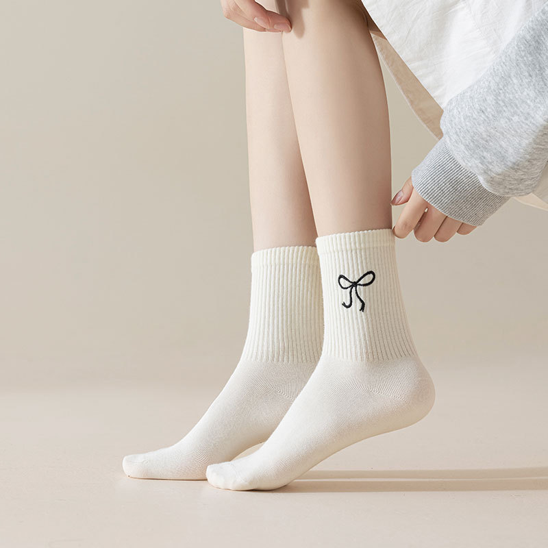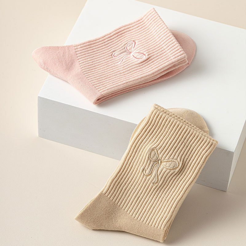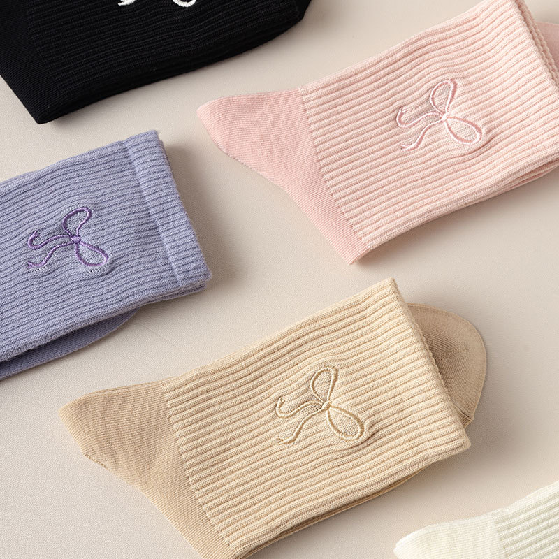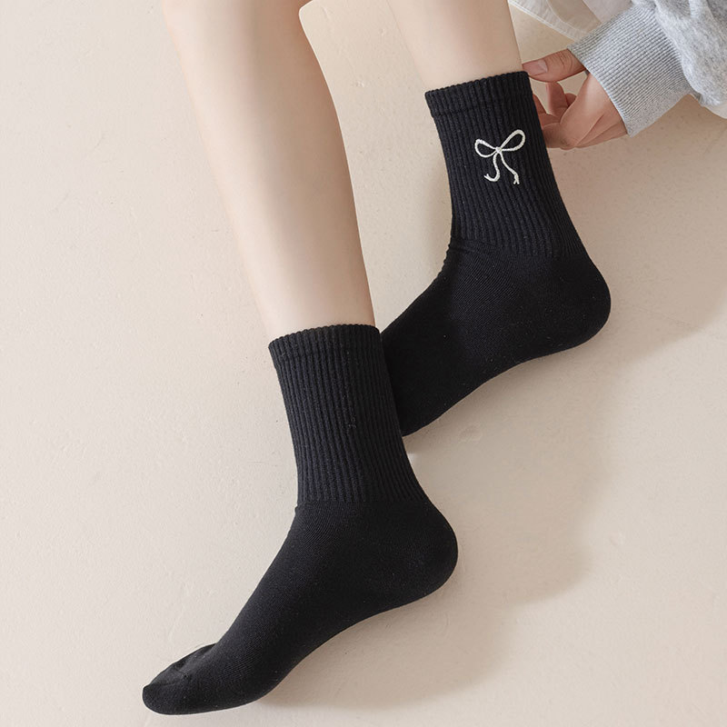 秋冬新款袜子女抗起球中筒袜刺绣蝴蝶结堆堆袜棉袜女士袜子厂家