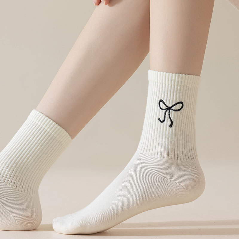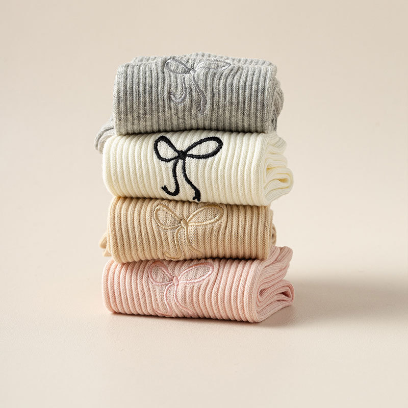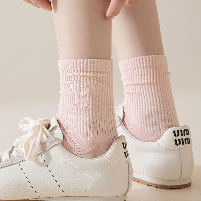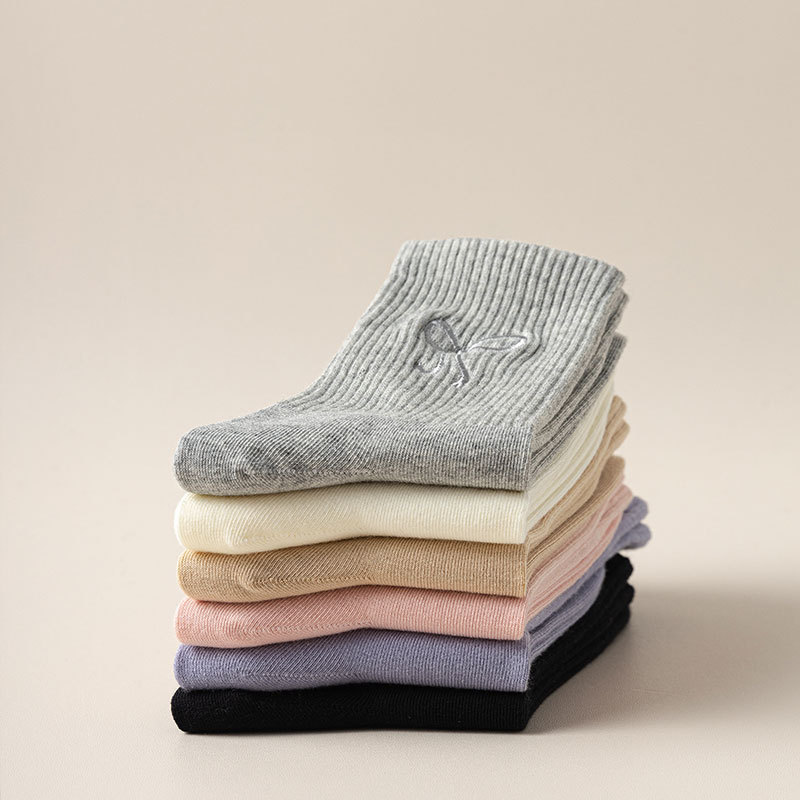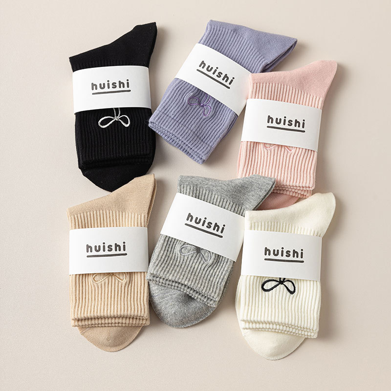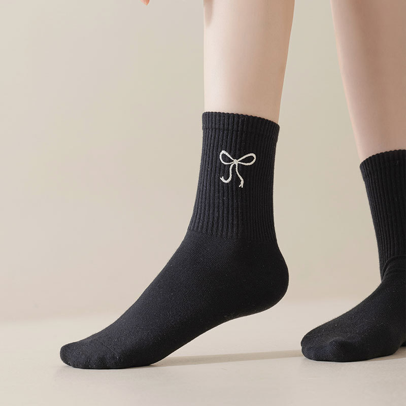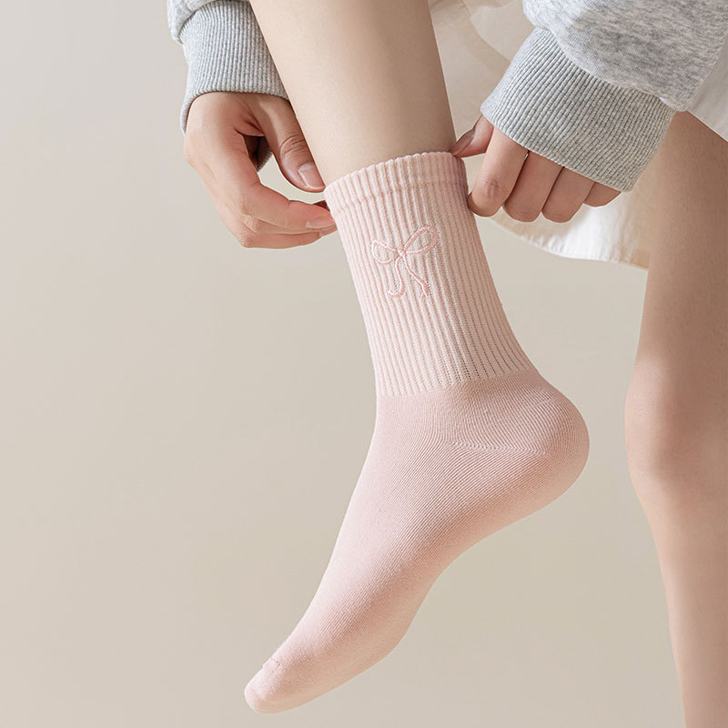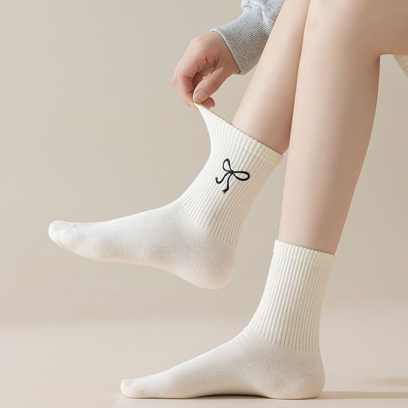 秋冬新款袜子女抗起球中筒袜刺绣蝴蝶结堆堆袜棉袜女士袜子厂家