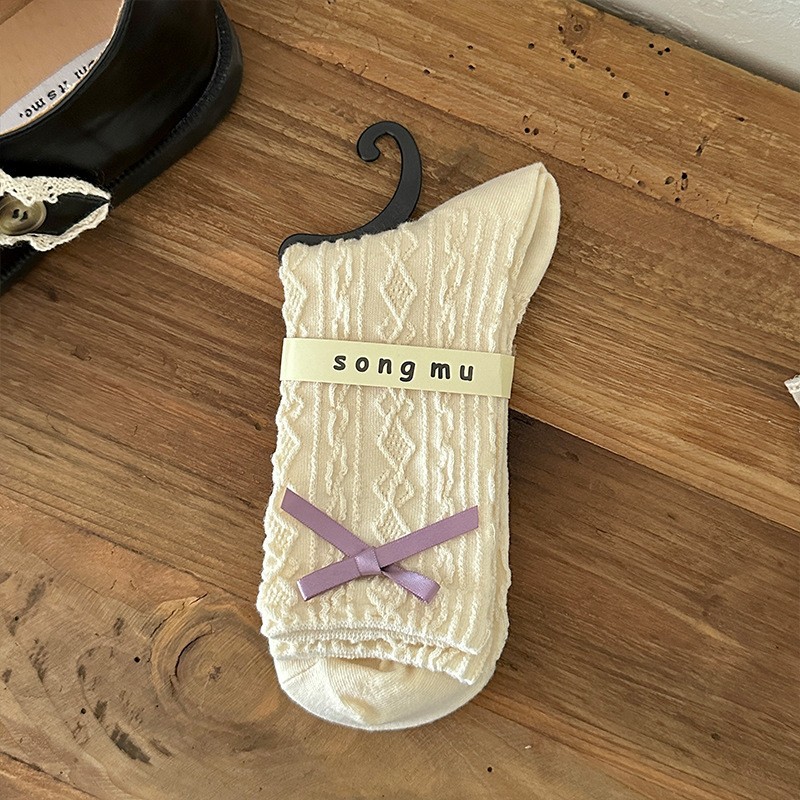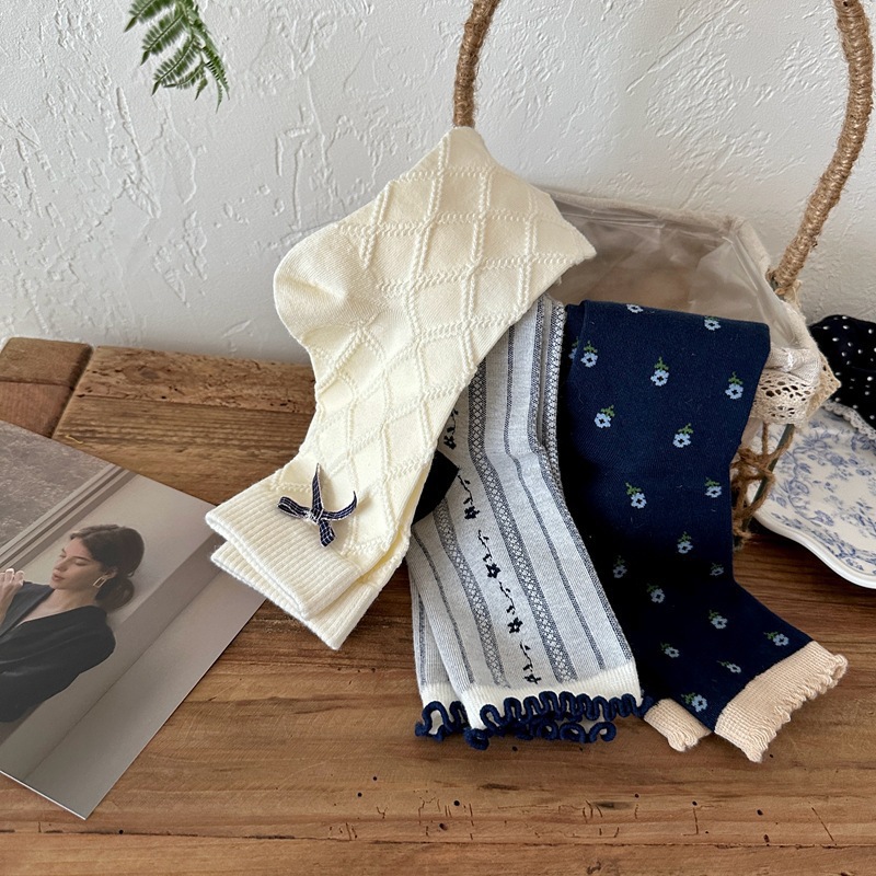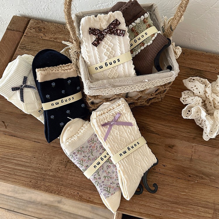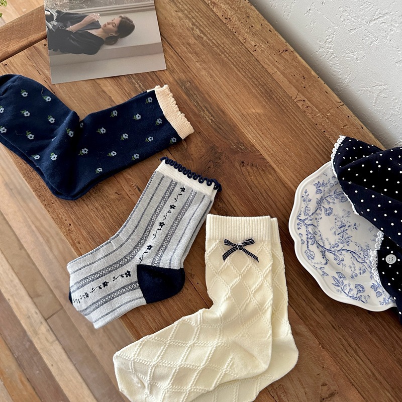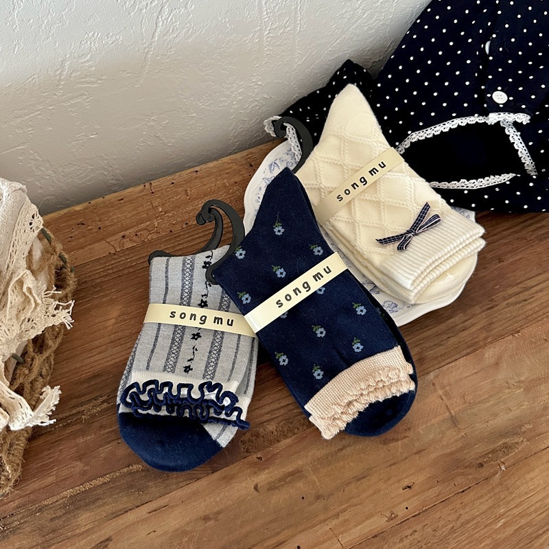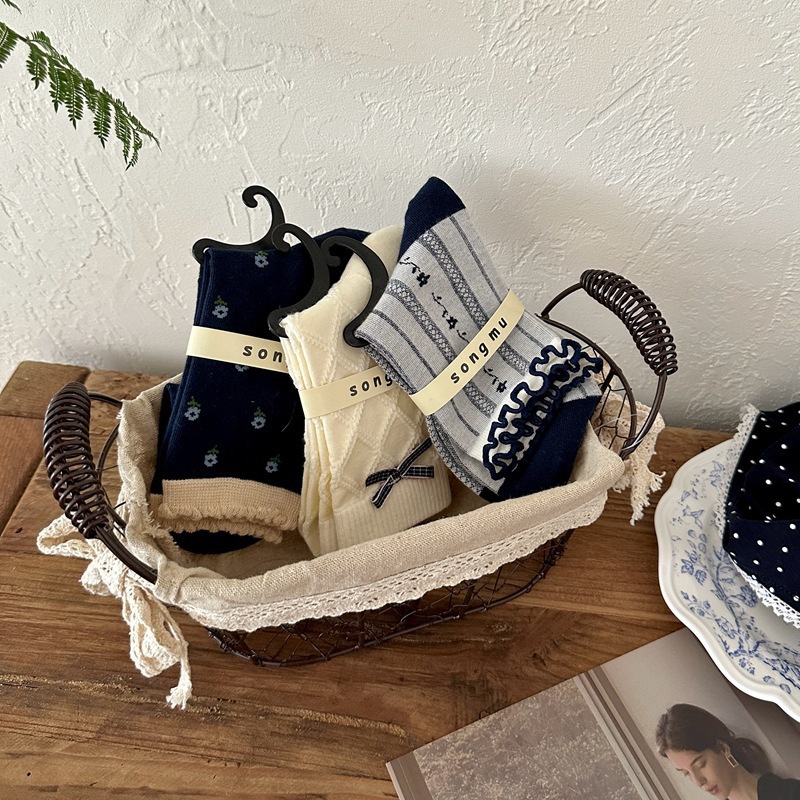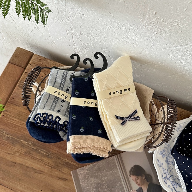 songmu轻复古藏青色系女袜纯棉蝴蝶结韩系袜子女中筒袜韩版堆堆袜