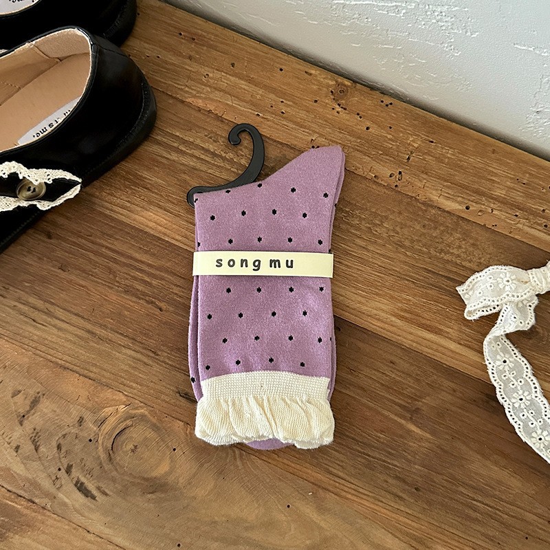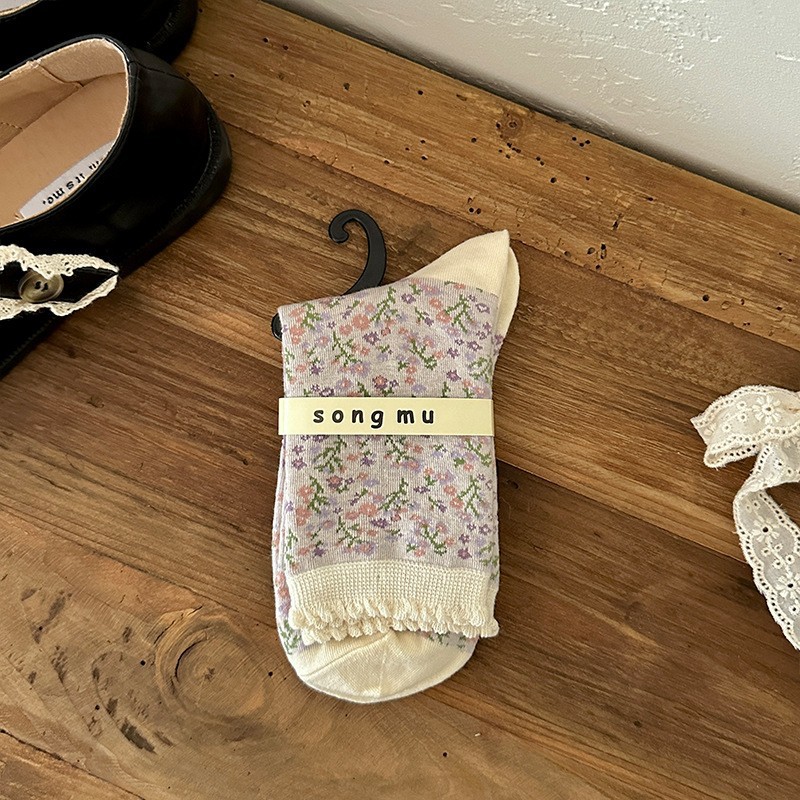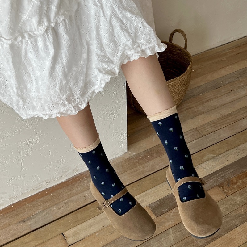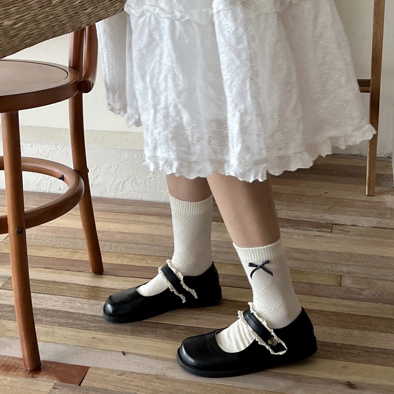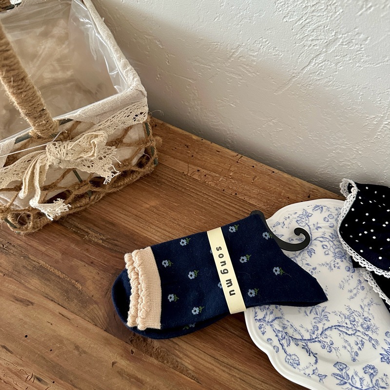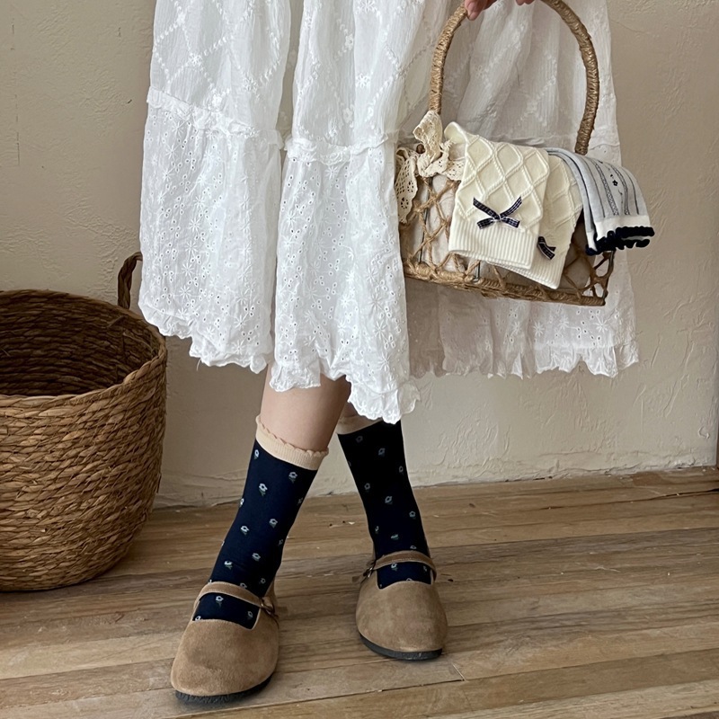 songmu轻复古藏青色系女袜纯棉蝴蝶结韩系袜子女中筒袜韩版堆堆袜