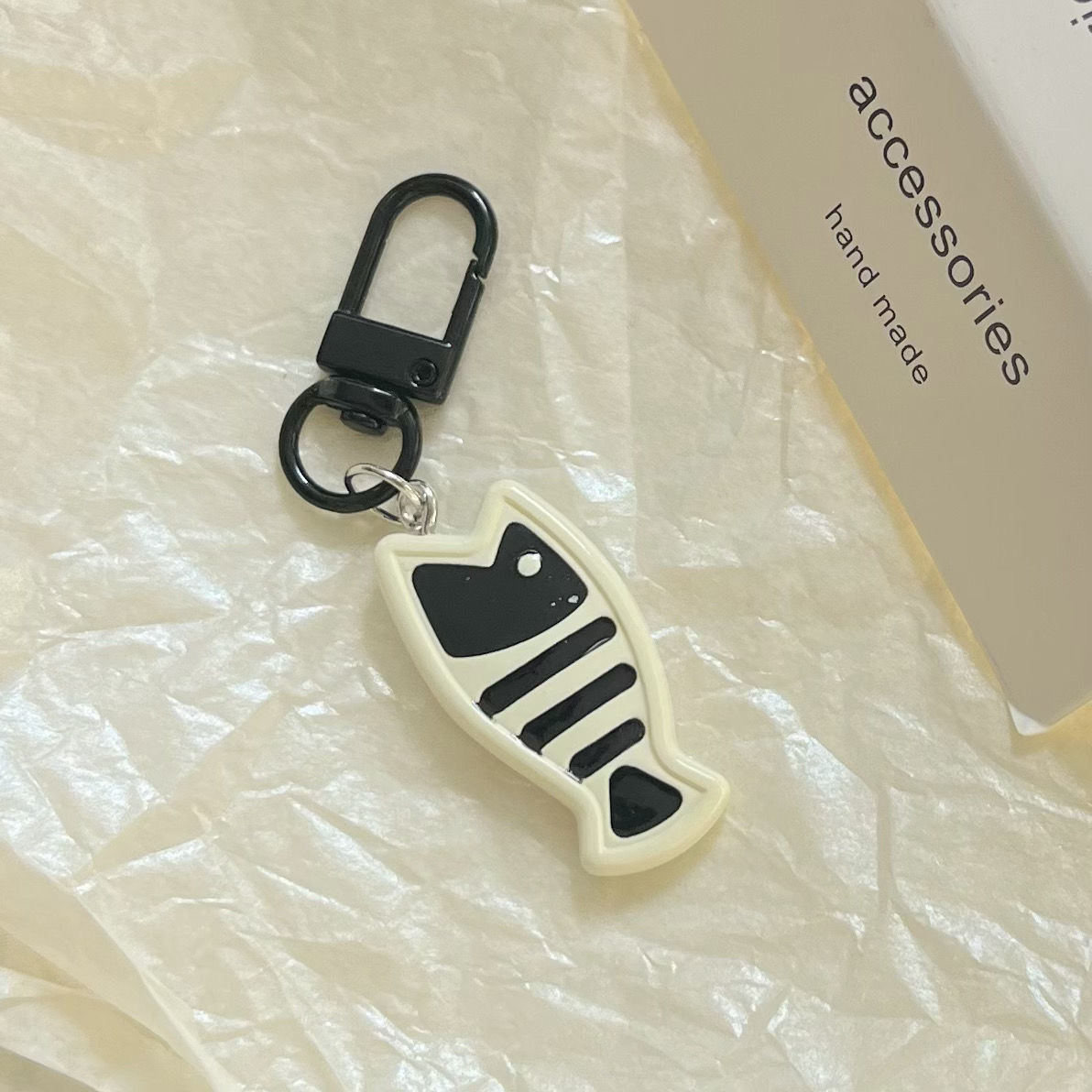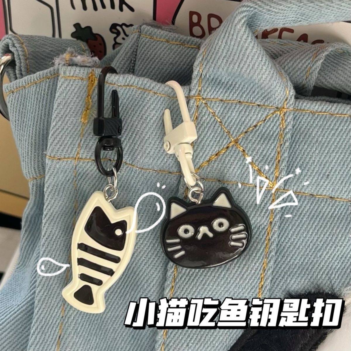 门扣E60黑白小猫吃鱼钥匙扣小众精致挂件书包闺蜜情侣挂饰饰品