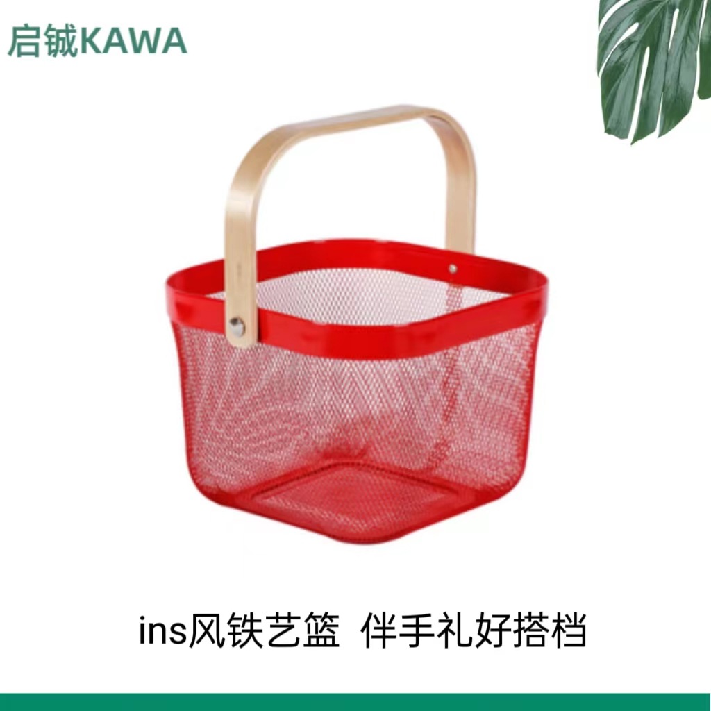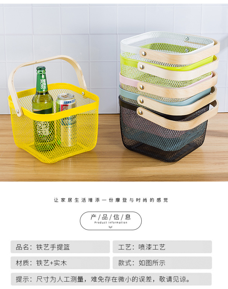 厂家直供镂空木柄铁艺篮多功能手提篮家用置物篮收纳篮铁篮子