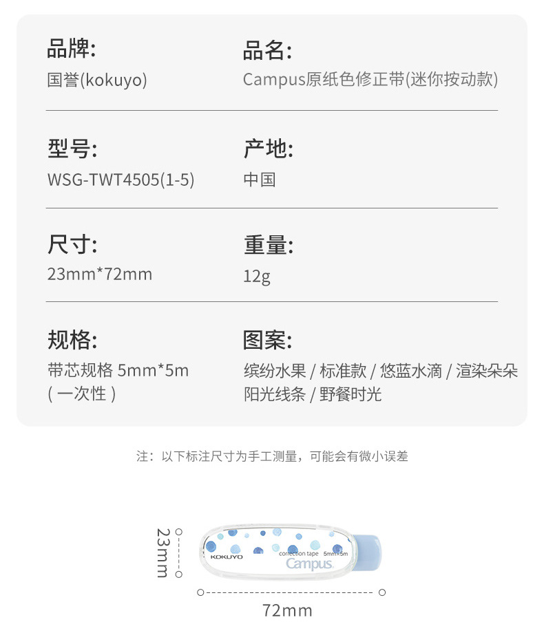 日本kokuyo国誉修正带迷你便携按动款学生用campus原纸色涂改带