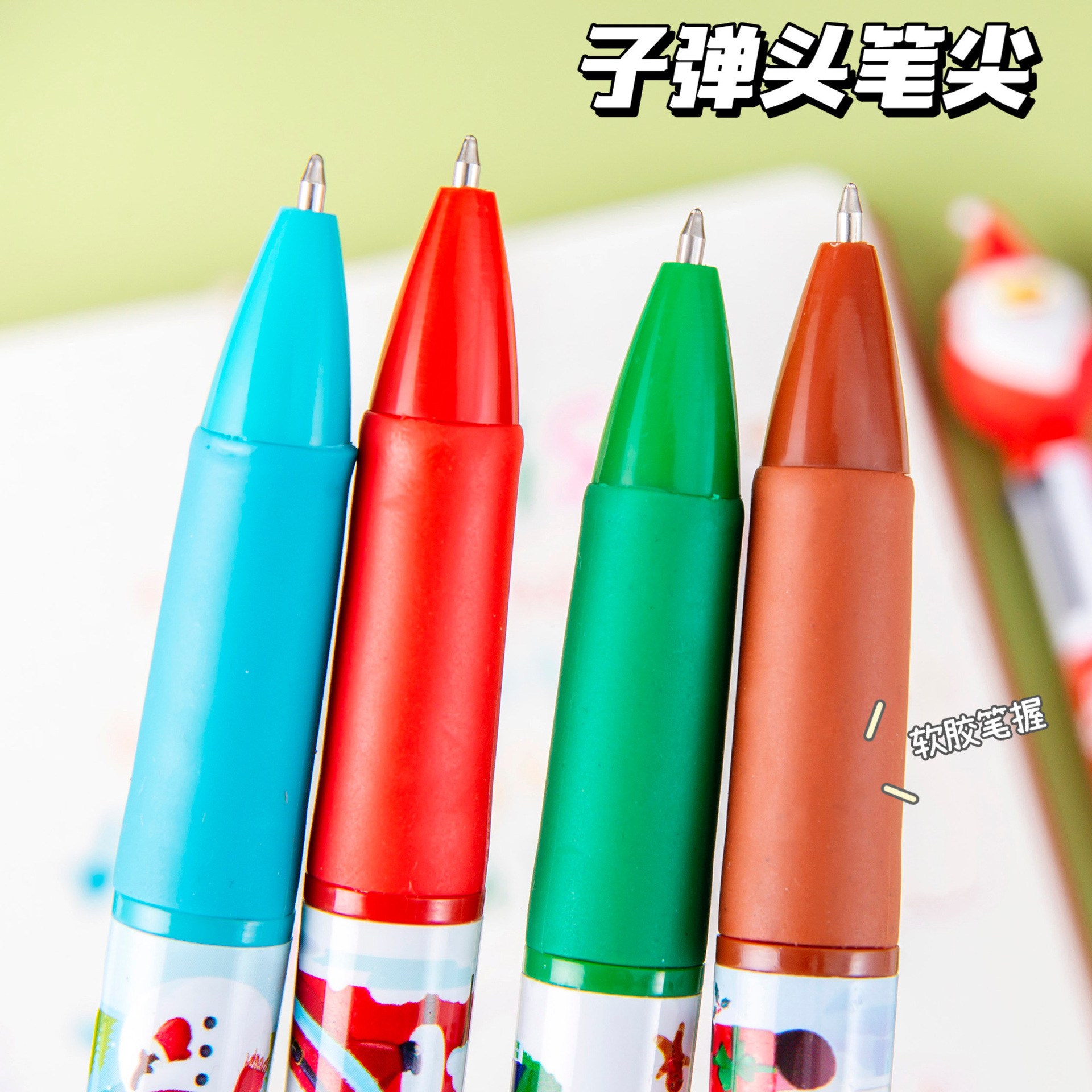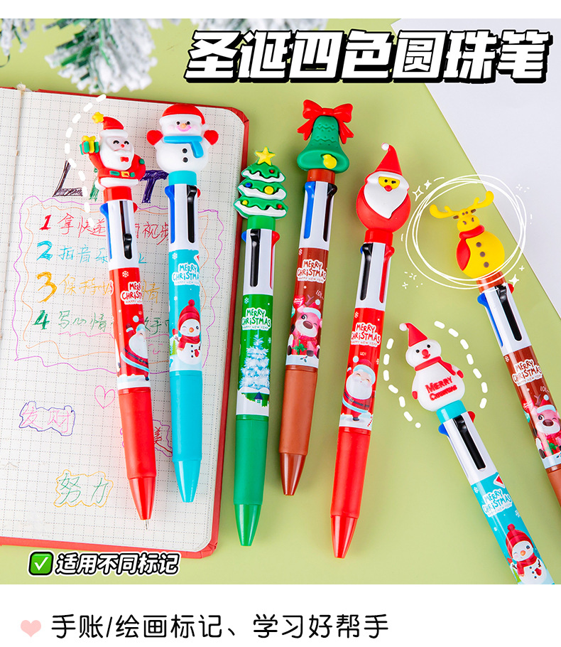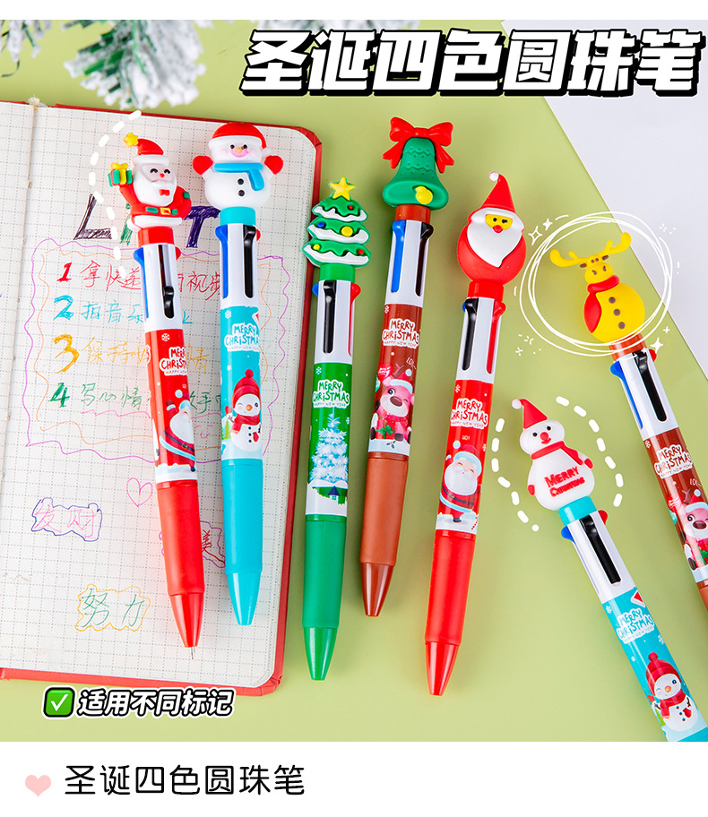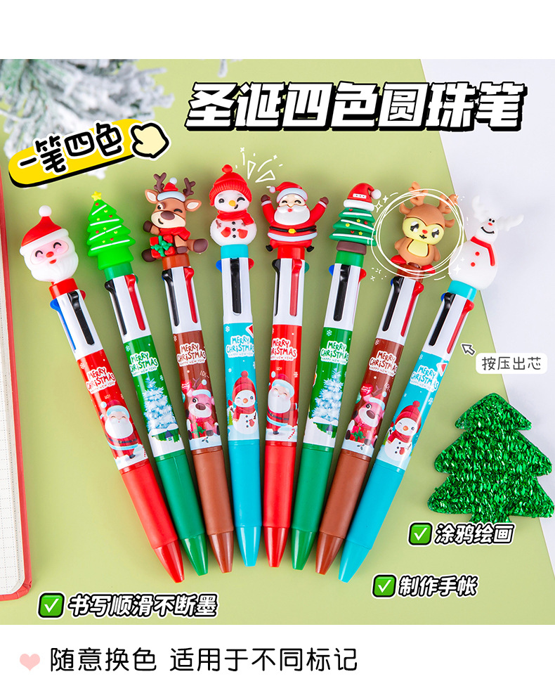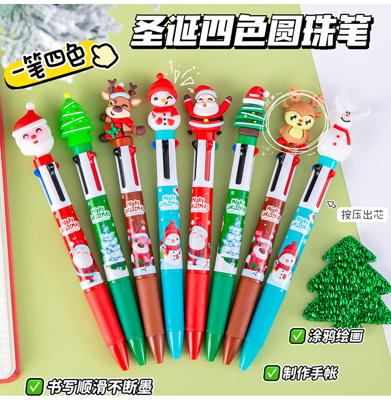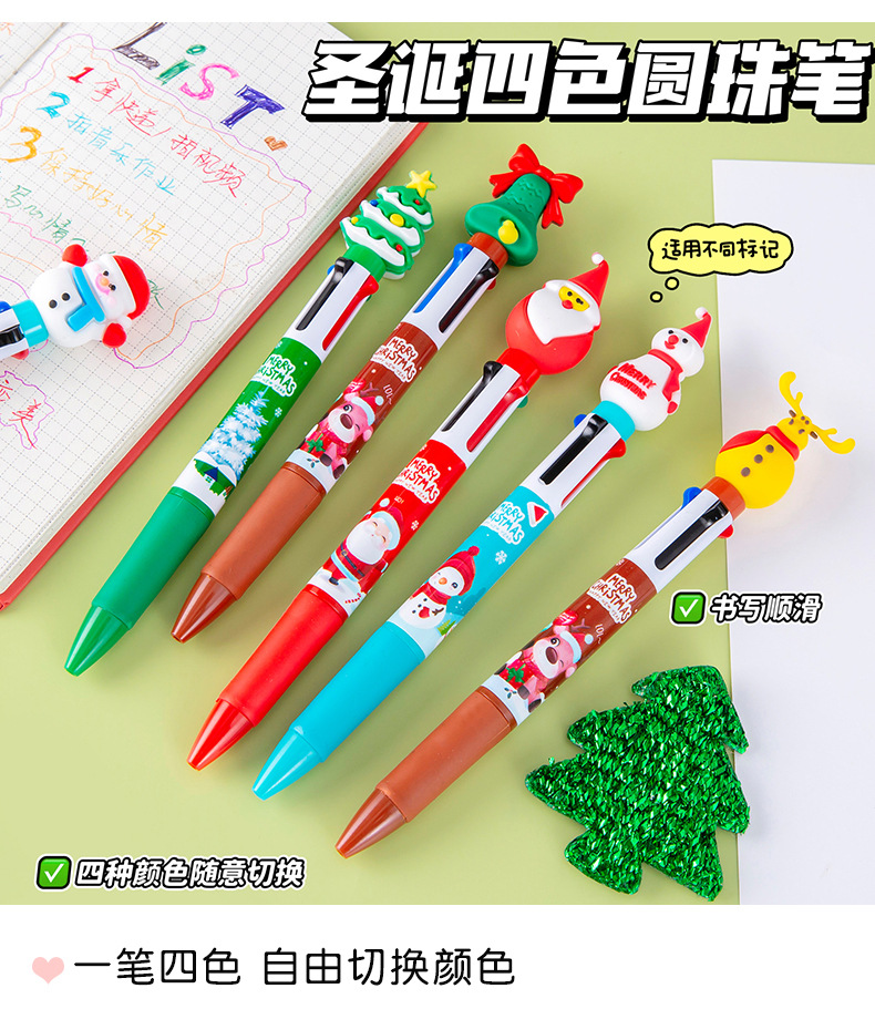 卡通圣诞四色圆珠笔圣诞节学生奖品礼物多色笔手账笔按动彩色笔