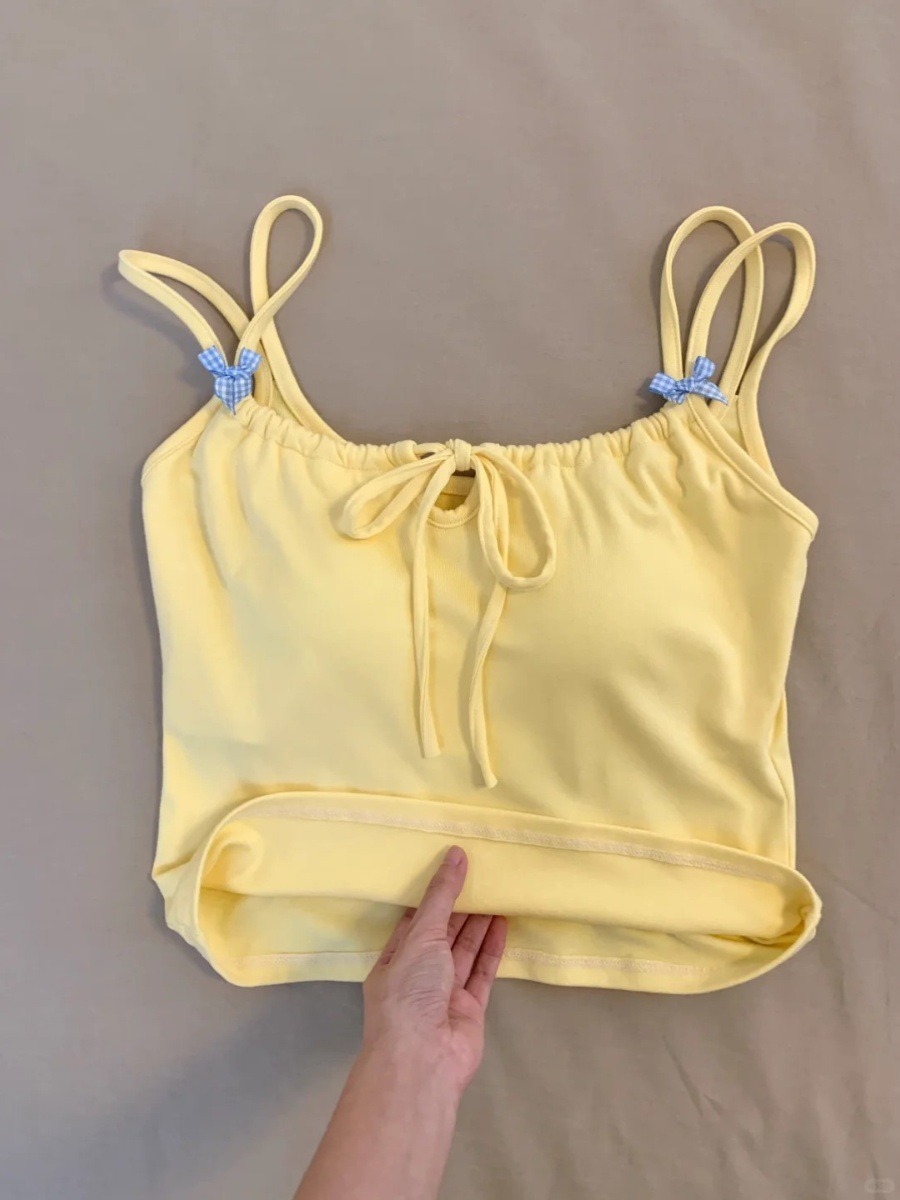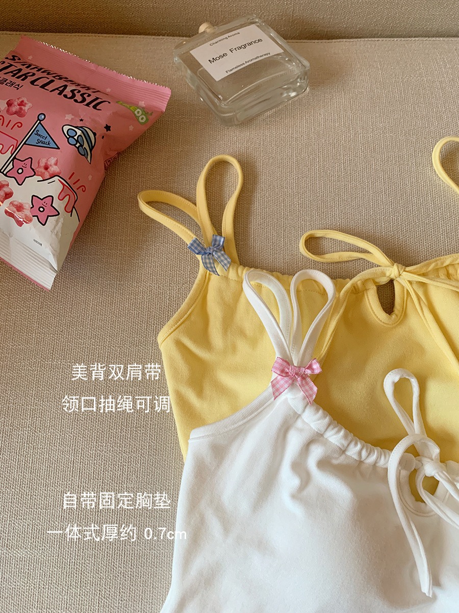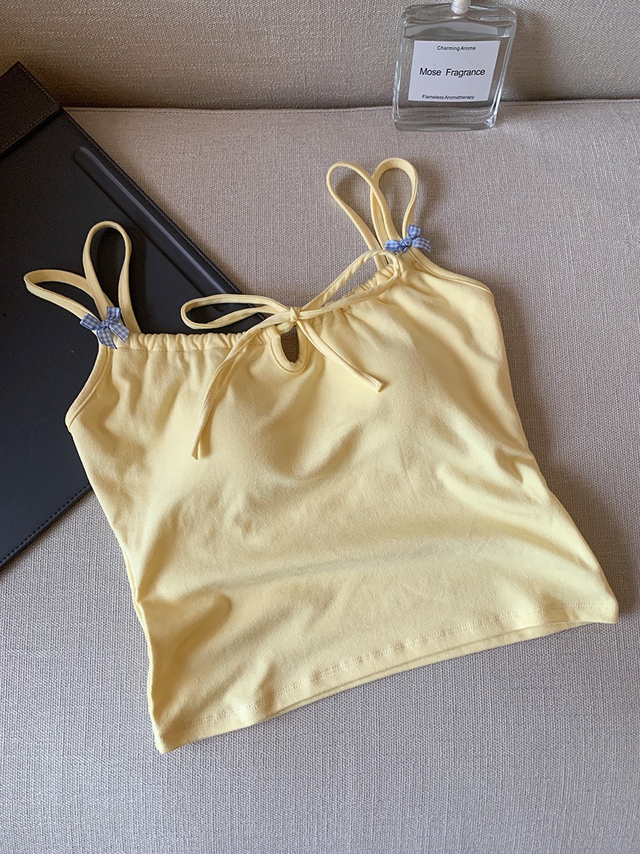 6809带胸垫辣妹双肩带纯欲bm风黄色背心女吊带内搭蝴蝶结无袖美背