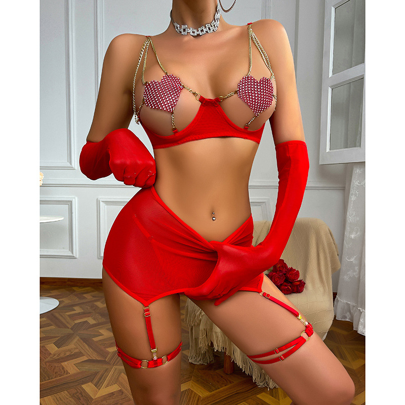 外贸货源跨境欧美新款性感爱心文胸镂空分体情趣内衣套装