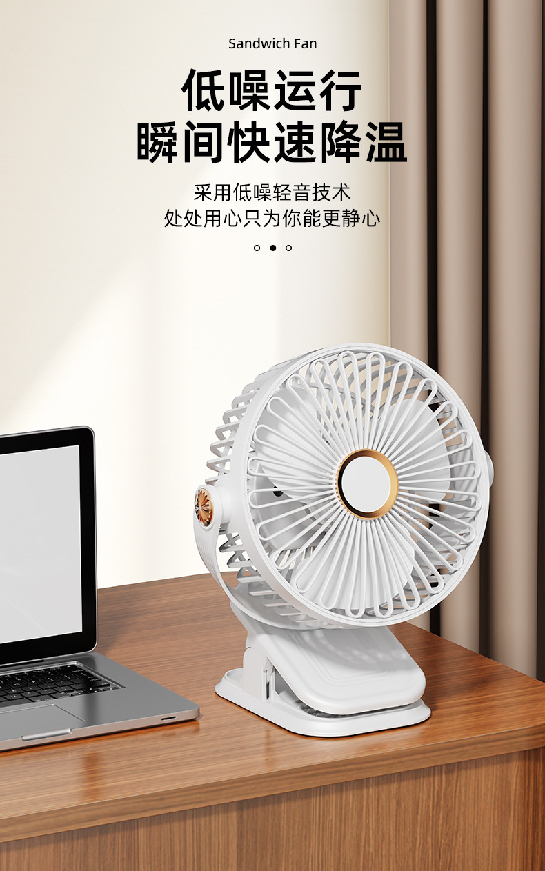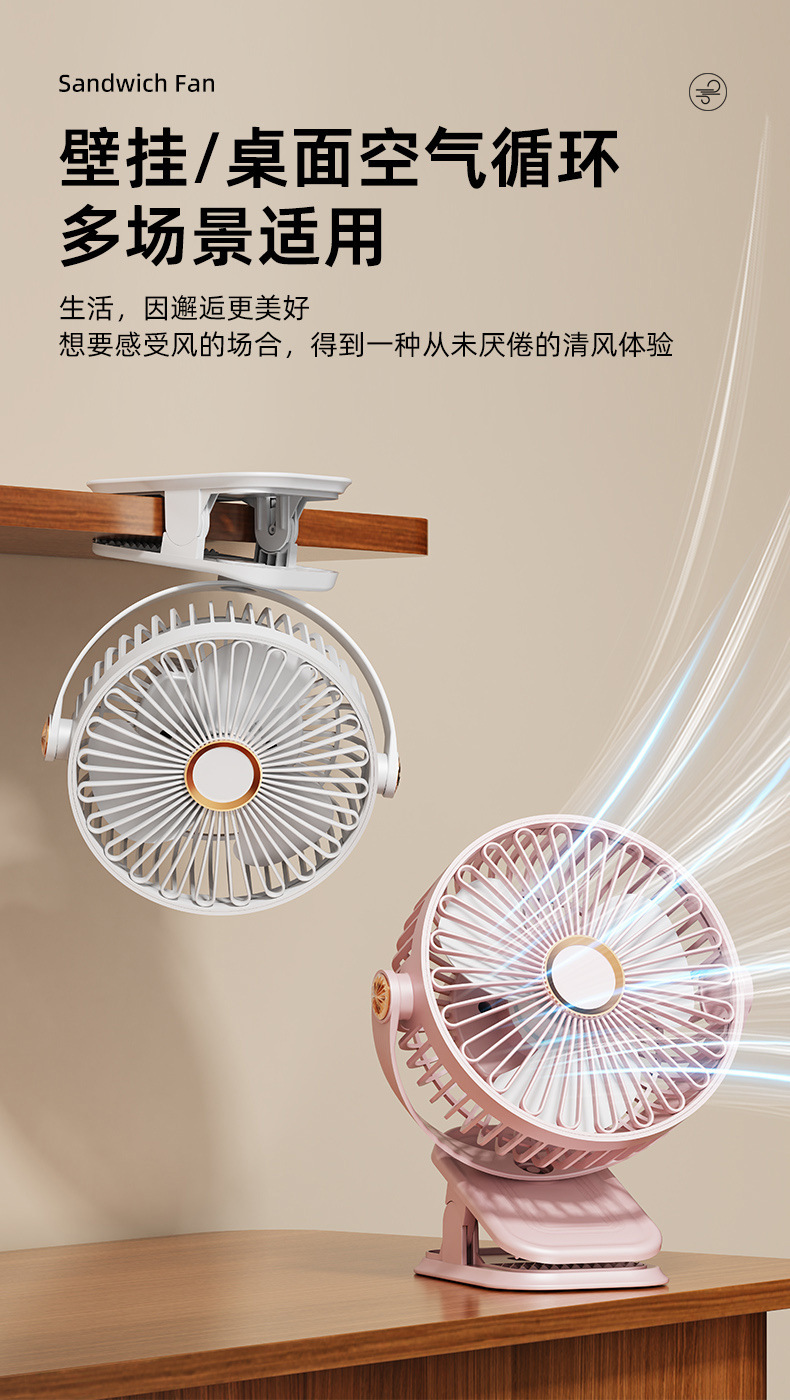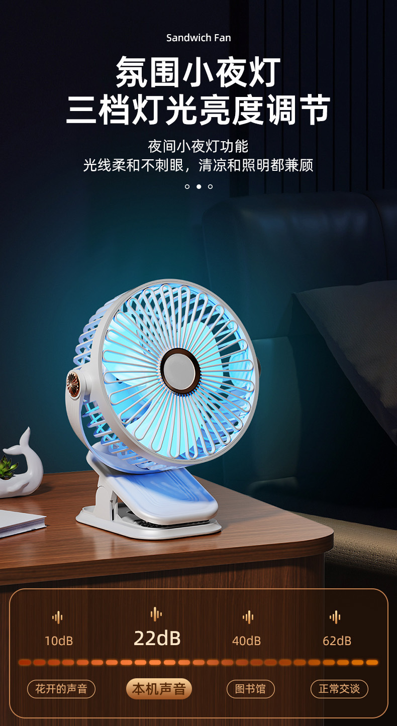 跨境USB充电夹式小风扇五档灯光充电宿舍桌面床头a类电池批发
