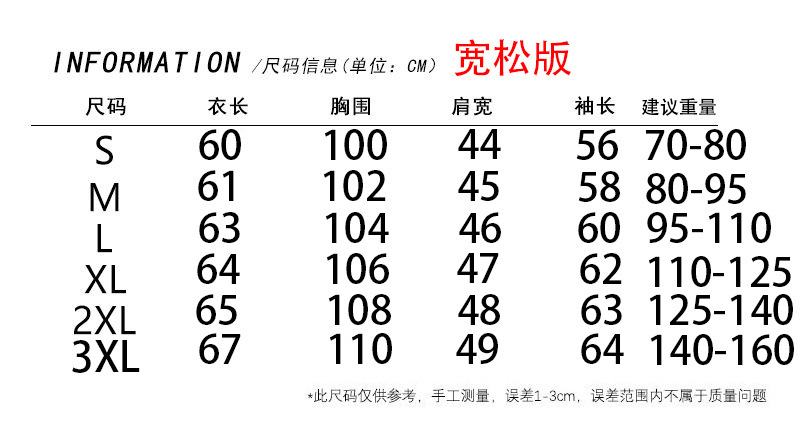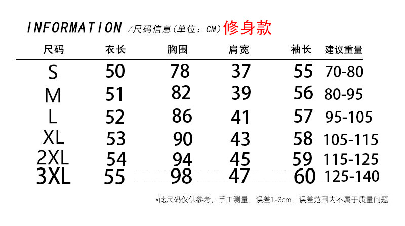 | 3xl recommended 63.00 kg-70.00 kg(3XL 建议126-140斤) | USD $12.82 | 1000 piece available |