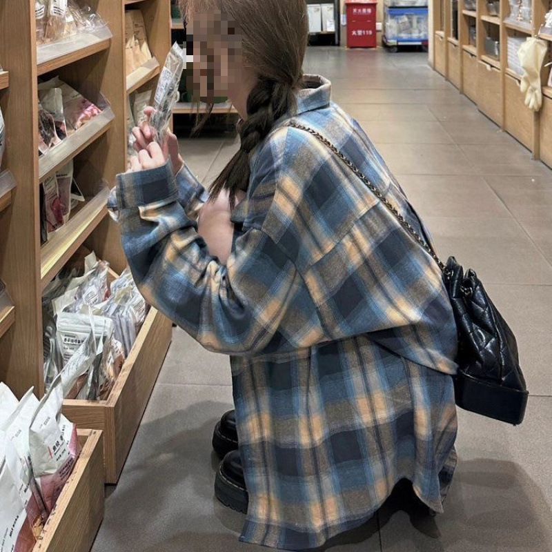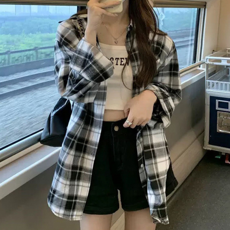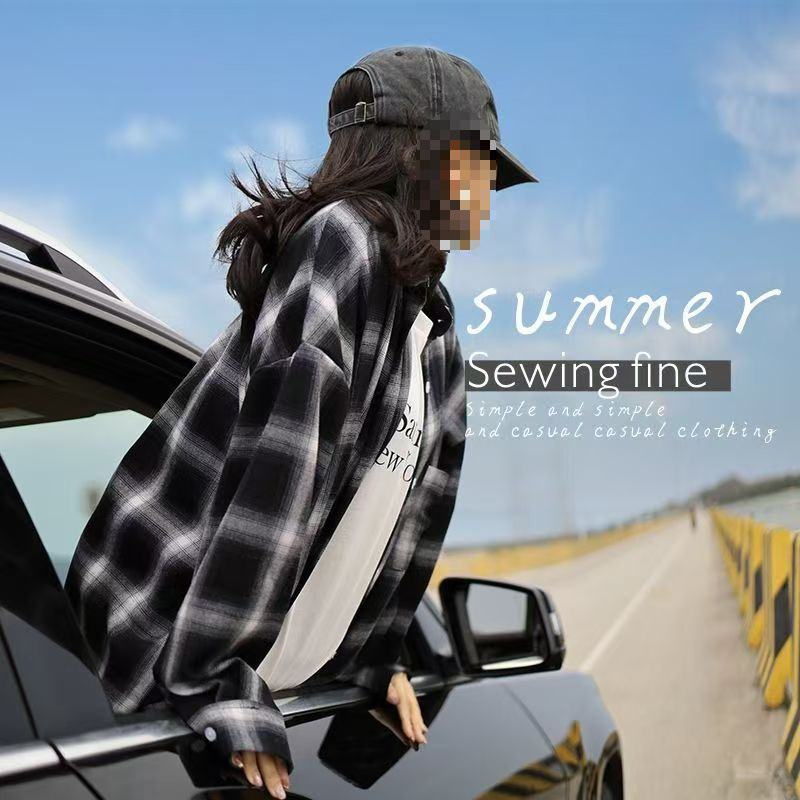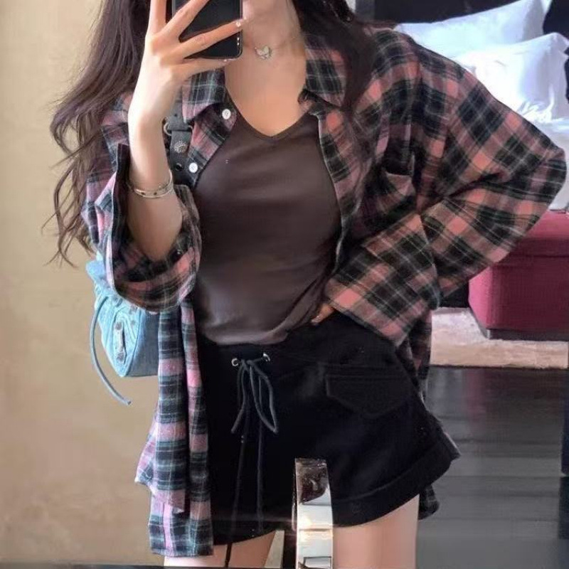 美式复古长袖格子衬衫外套女早秋新款宽松防晒衣外套