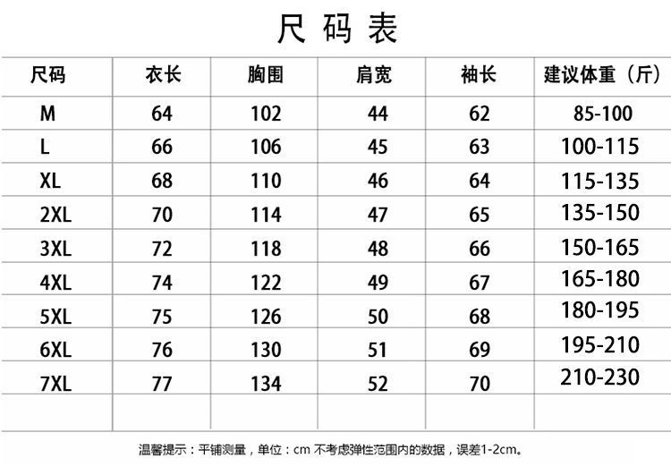 | 6xl 97.50 kg-105.00 kg(6XL195-210斤) | USD $8.63 | 908 piece available |
