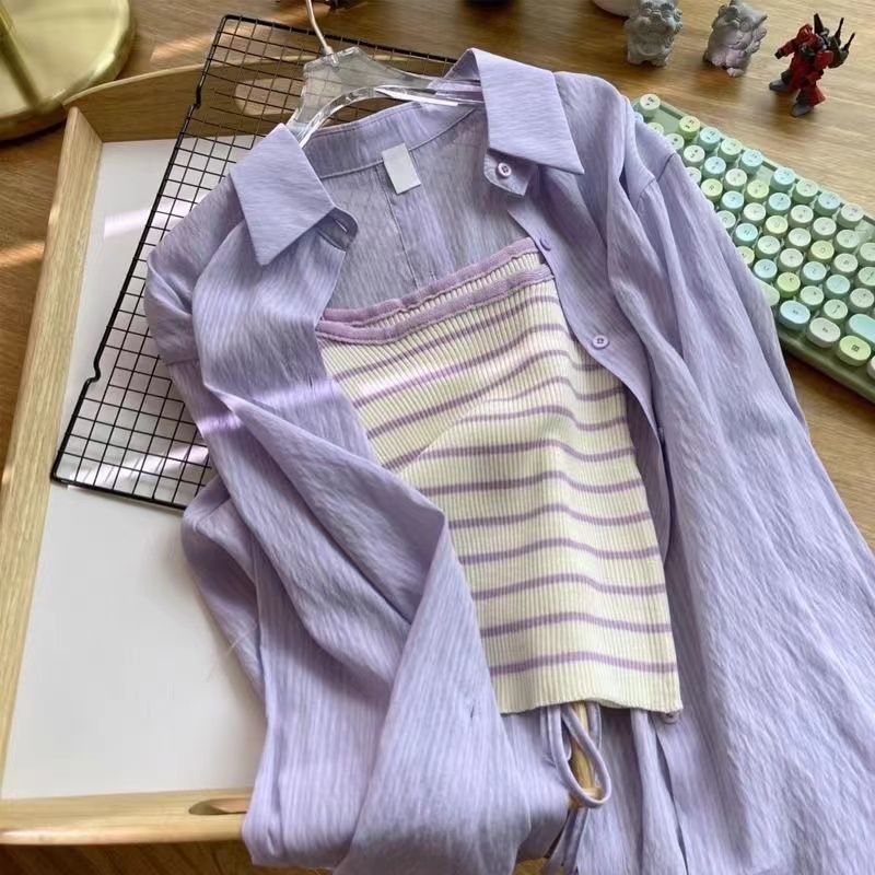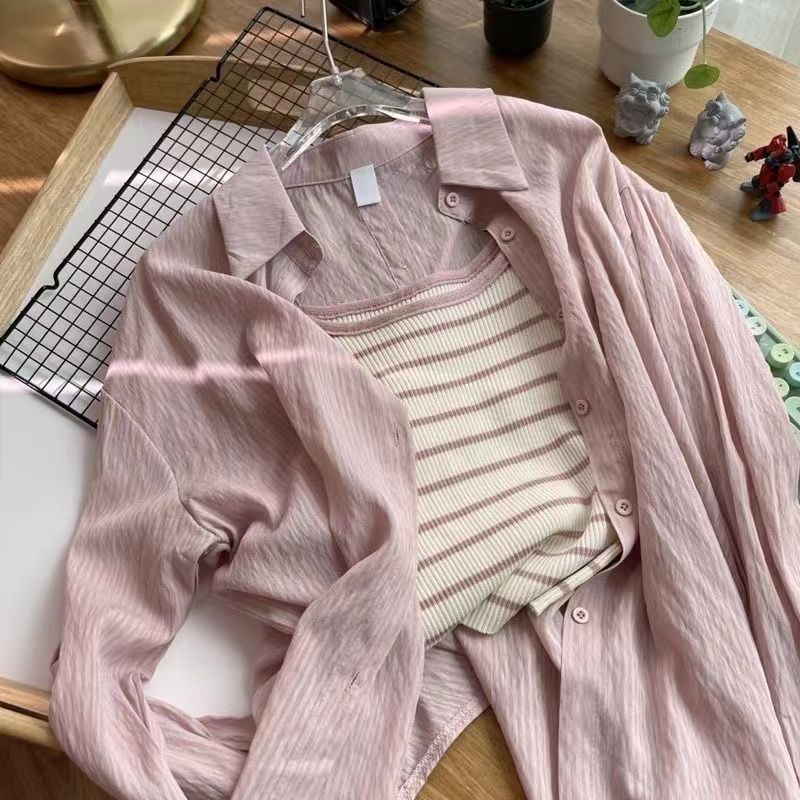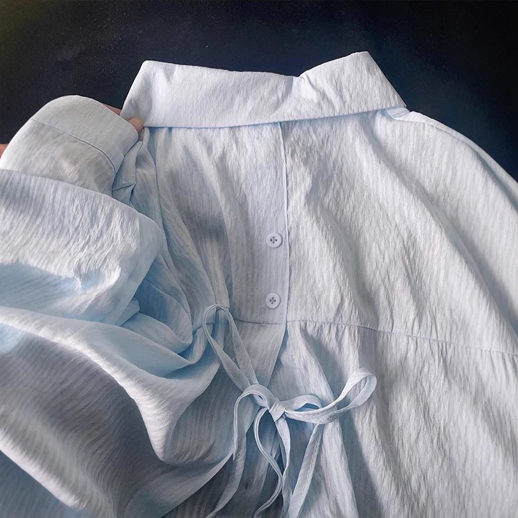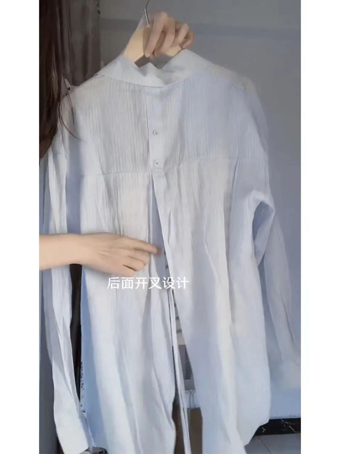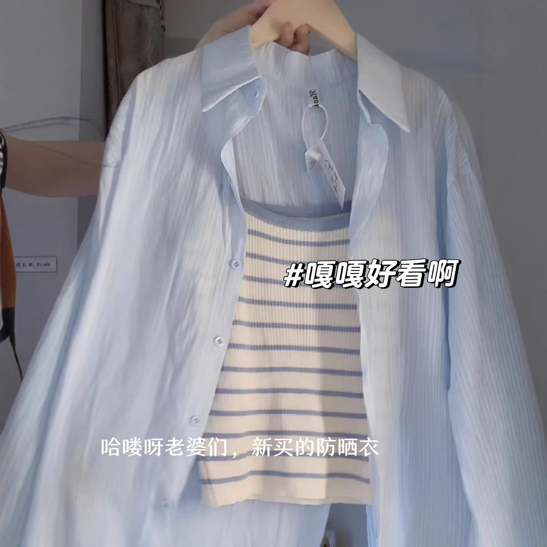 法式长袖开衫配吊带外搭薄防晒衣女外穿2024夏季薄款蓝色衬衫外套