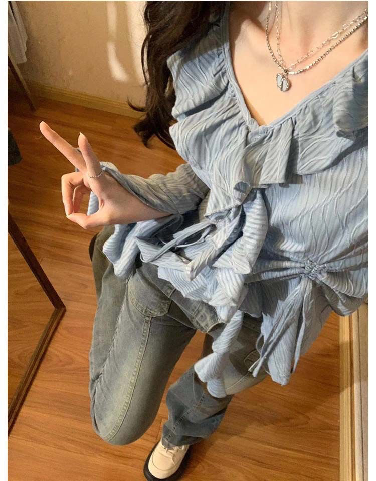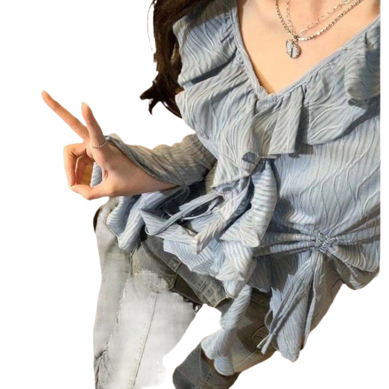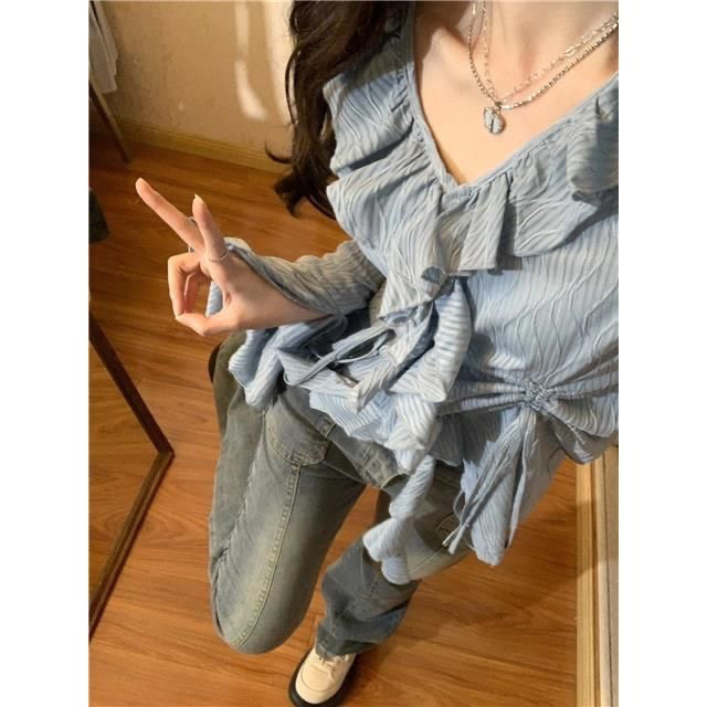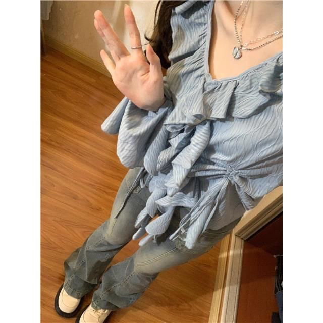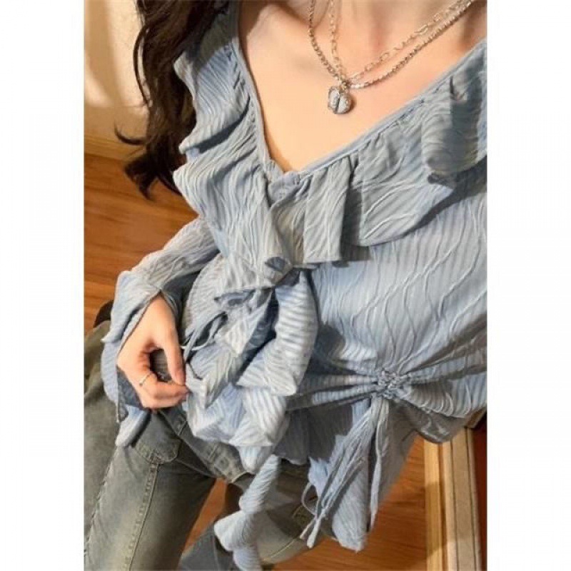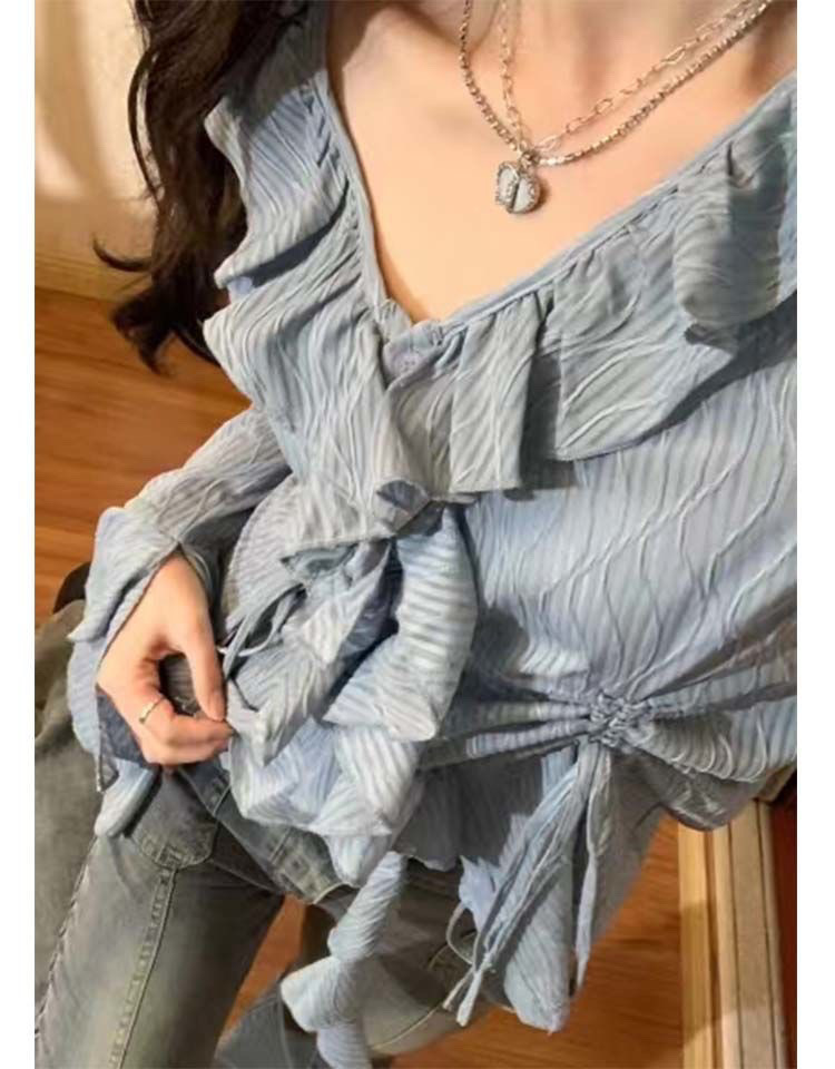 法式蓝色波浪纹抽绳衬衫女防晒衣新款设计感小众喇叭袖长袖上衣潮