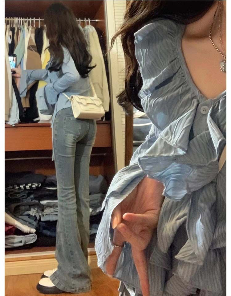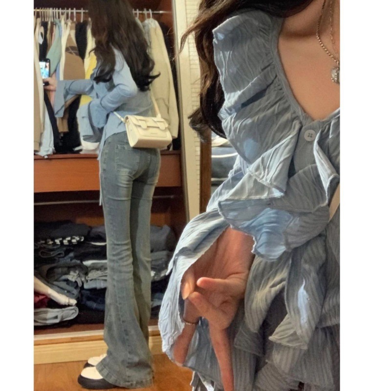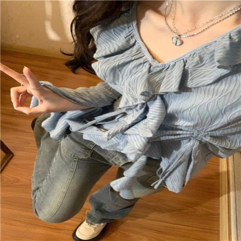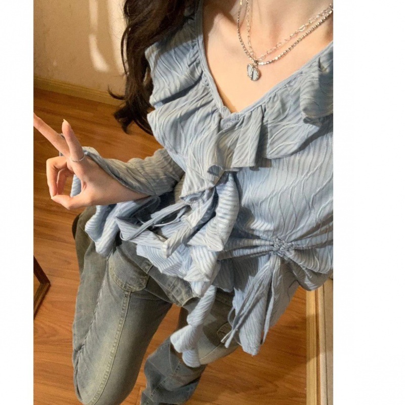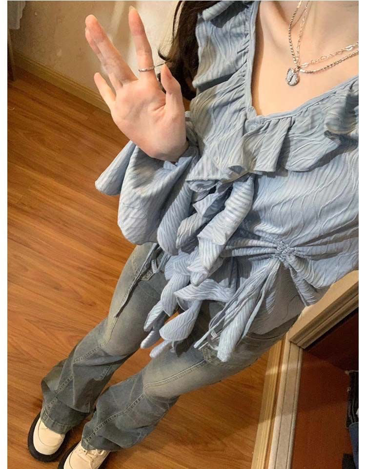 法式蓝色波浪纹抽绳衬衫女防晒衣新款设计感小众喇叭袖长袖上衣潮