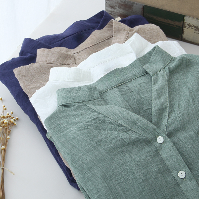 2023夏装新款防晒衣日系小清新宽松棉麻七分袖立领衬衫女亚麻衬衣