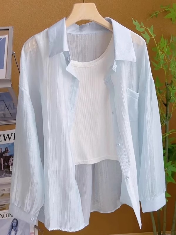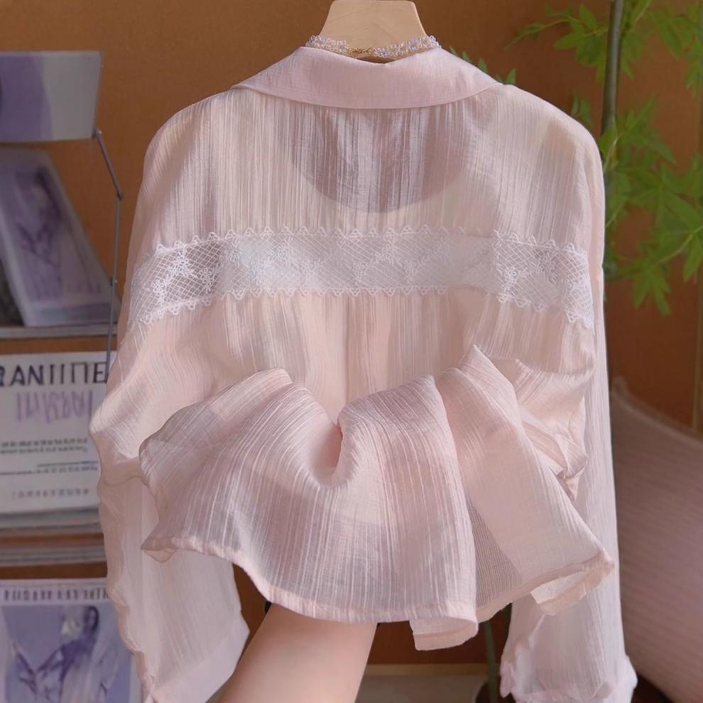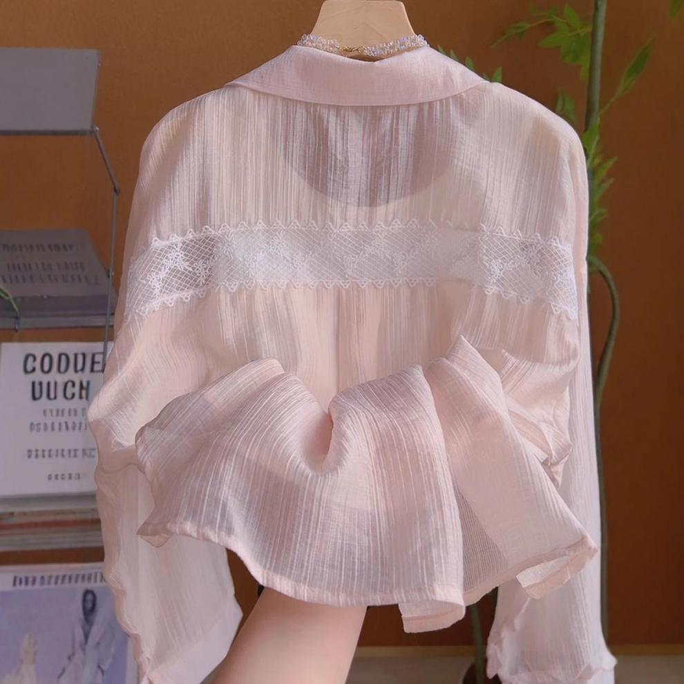 法式新款复古粉色蕾丝镂空衬衫女夏季轻薄百搭防晒衣开衫上衣女