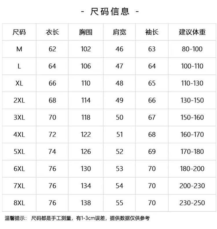 | 8xl recommended 115.00 kg-130.00 kg(8XL建议230-260斤) | USD $7.77 | 200 piece available |
