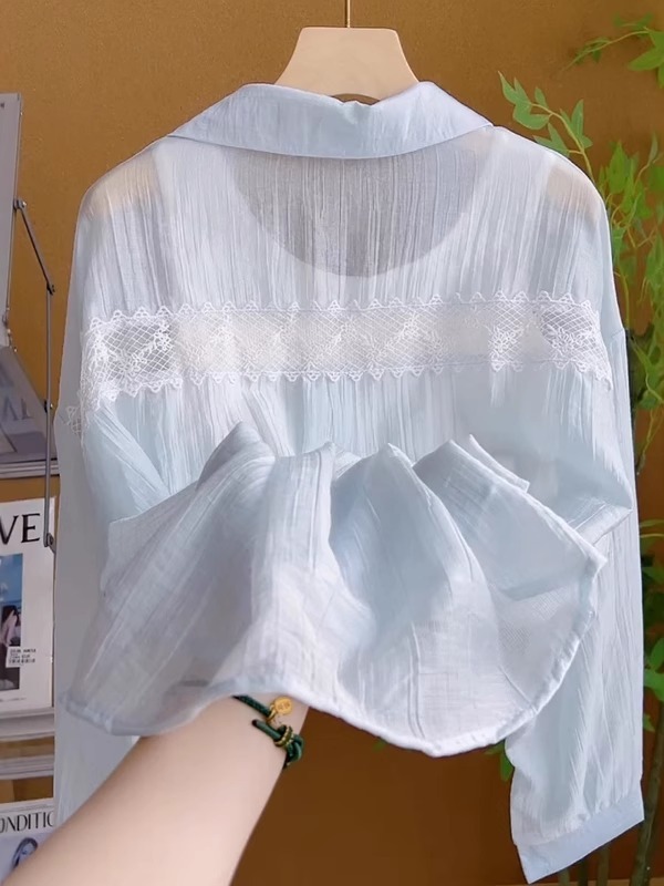 法式新款复古粉色蕾丝镂空衬衫女夏季轻薄百搭防晒衣开衫上衣直销