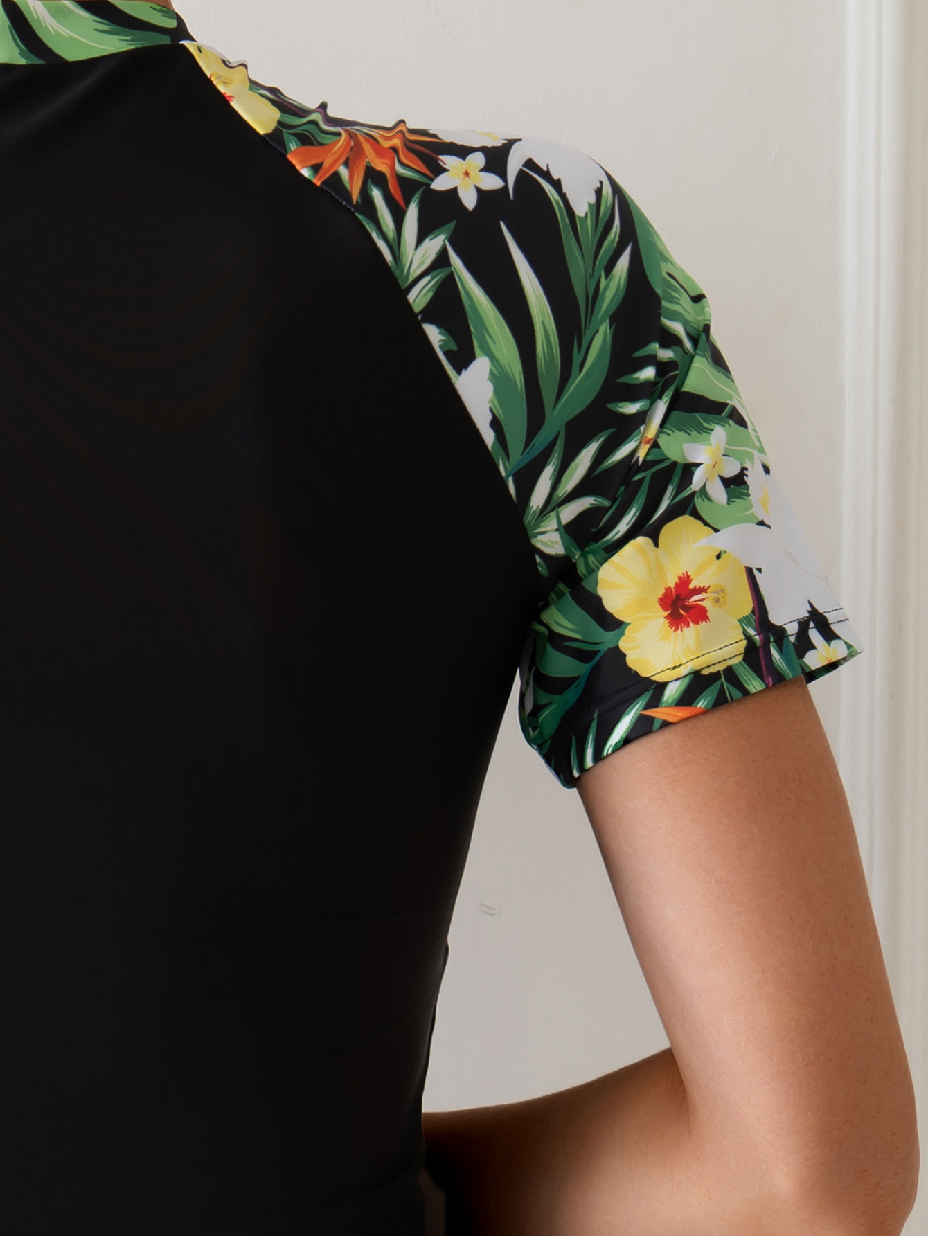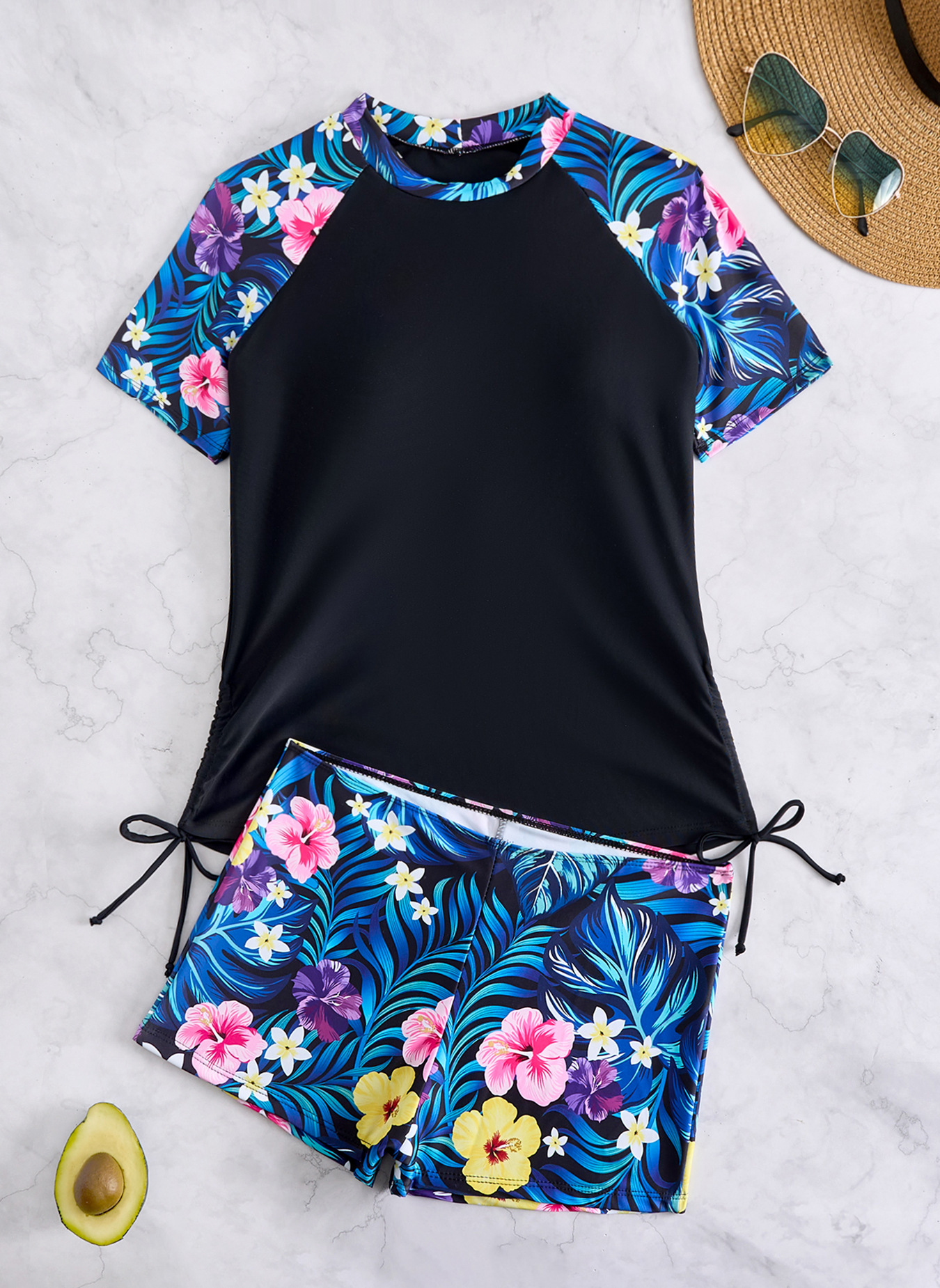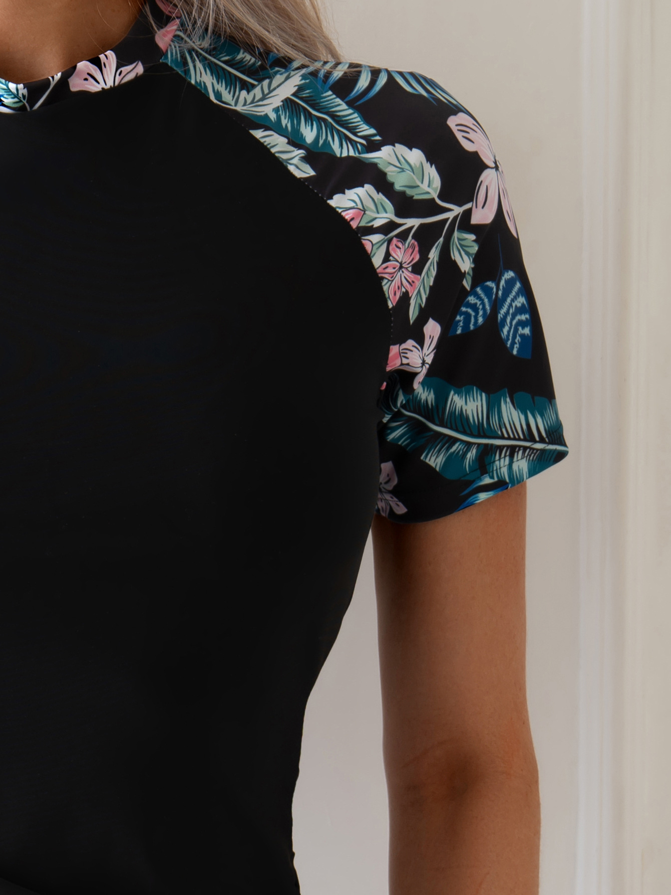 欧美外单性感保守休闲泳装印花拼色显瘦防晒短袖潜水服分体泳衣女