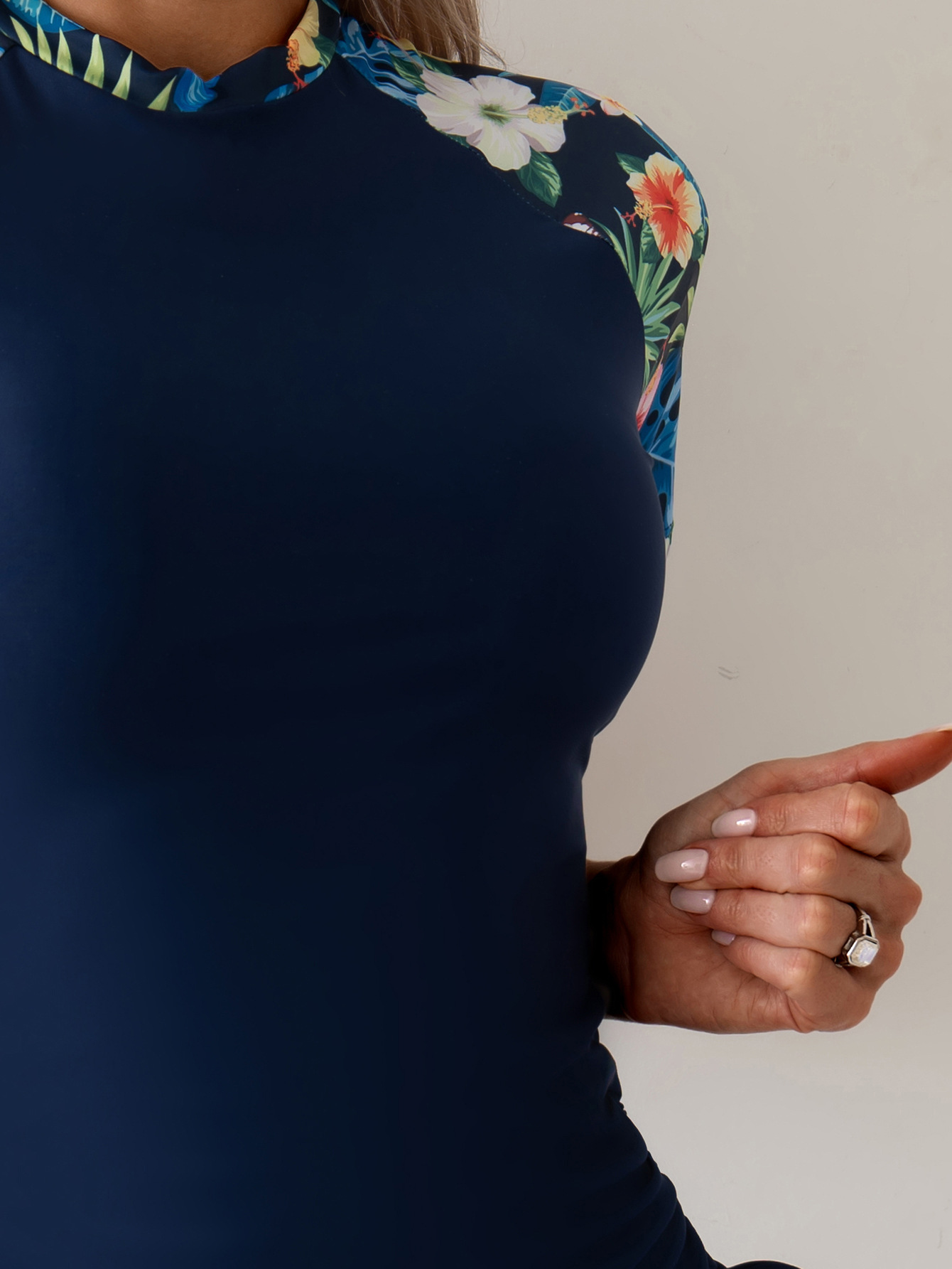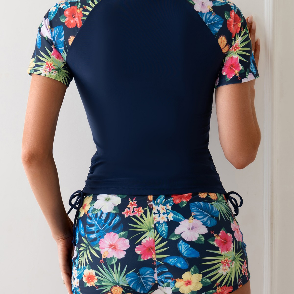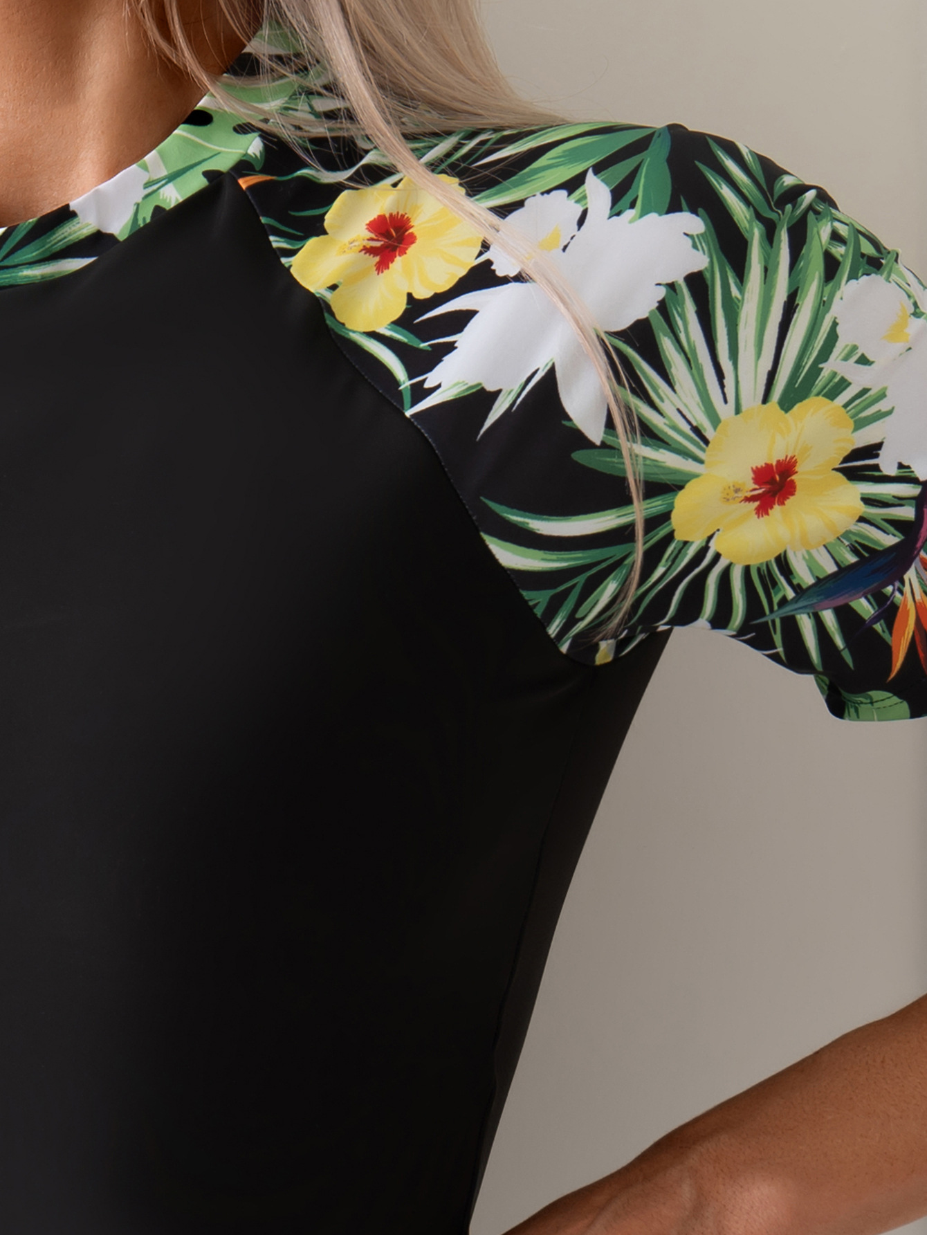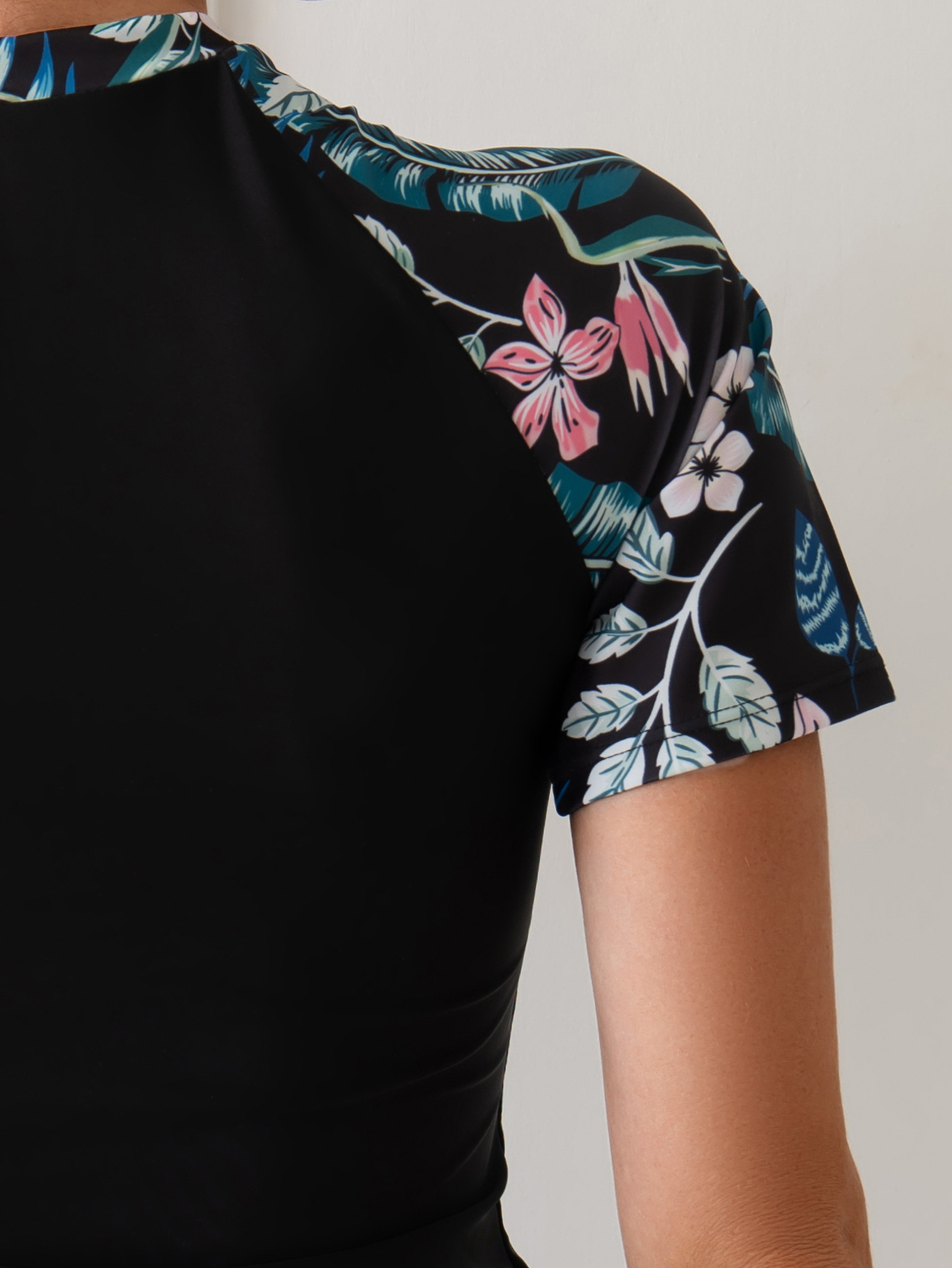欧美外单性感保守休闲泳装印花拼色显瘦防晒短袖潜水服分体泳衣女