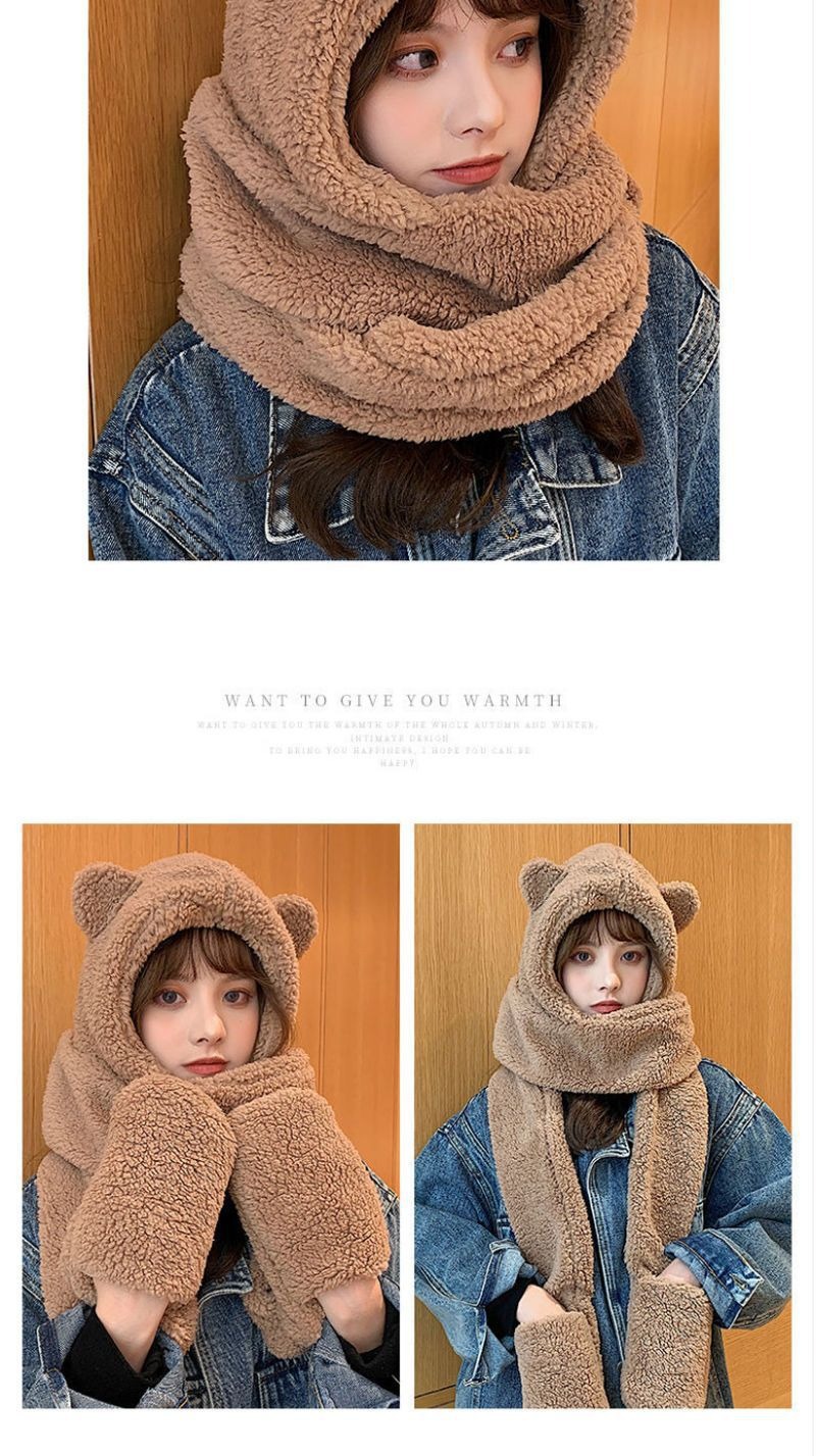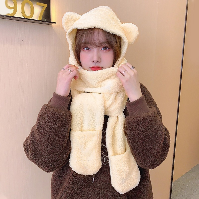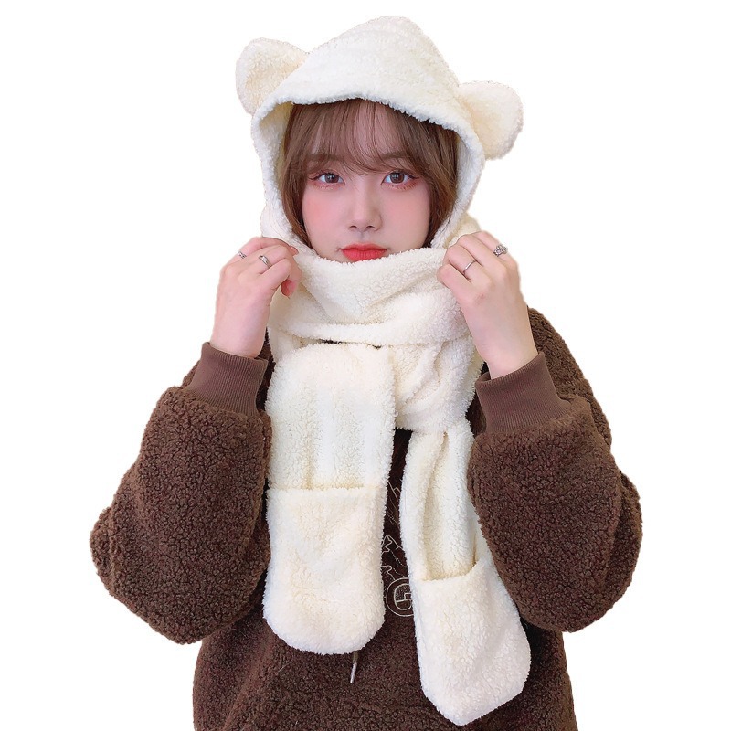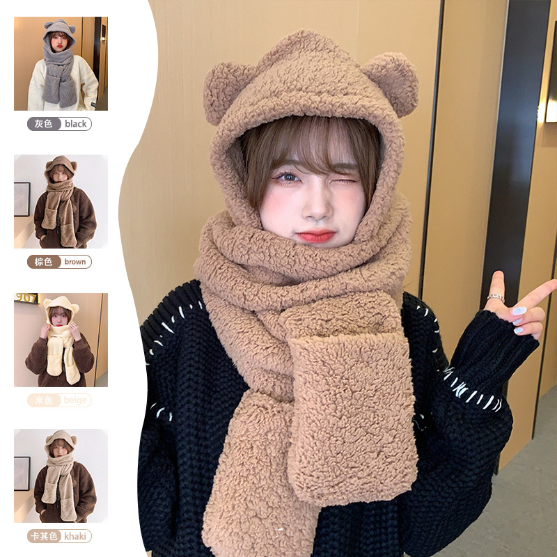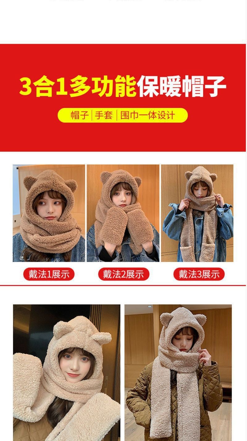 小熊帽子女冬围巾手套三件套棉花绒一体连帽可爱加厚保暖护耳棉帽