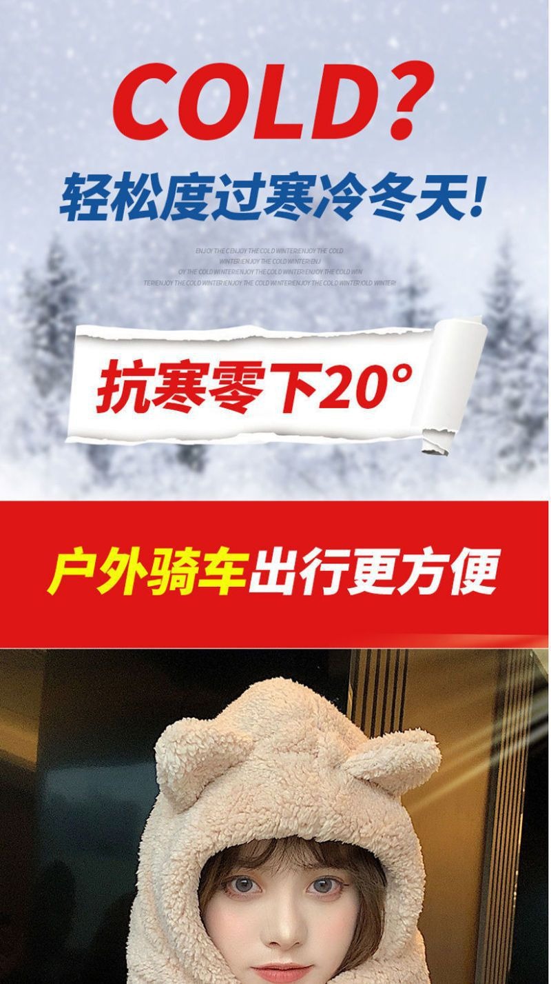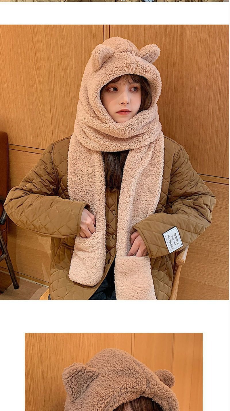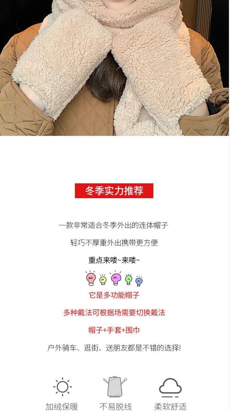 小熊帽子女冬围巾手套三件套棉花绒一体连帽可爱加厚保暖护耳棉帽