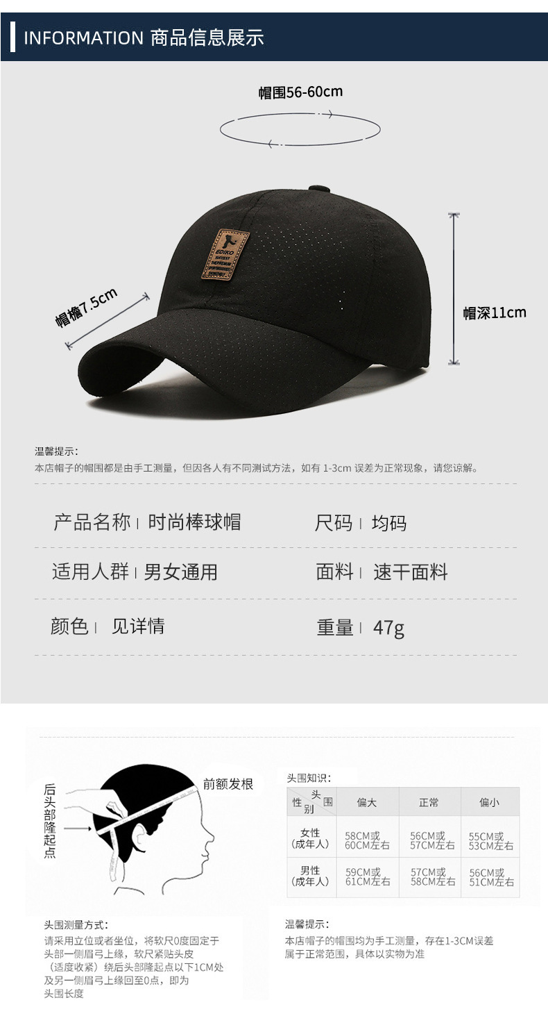 棒球帽速干春夏薄款网眼鸭舌帽男户外运动遮阳帽韩版透气帽子潮女