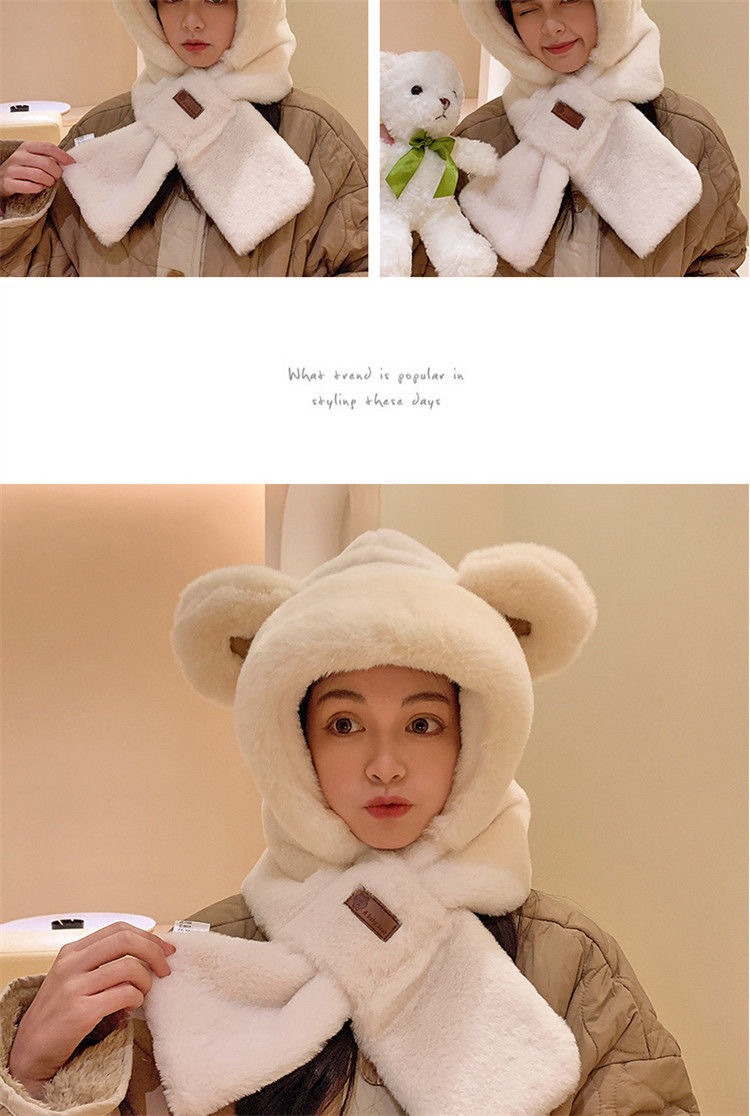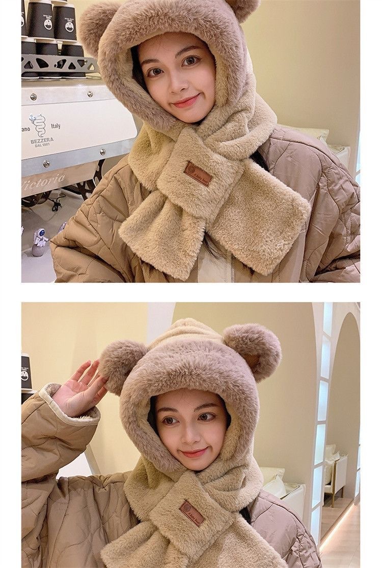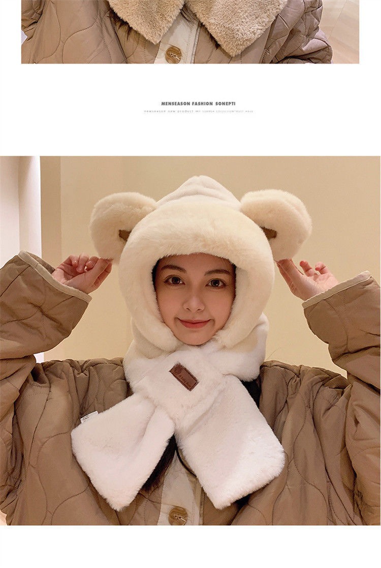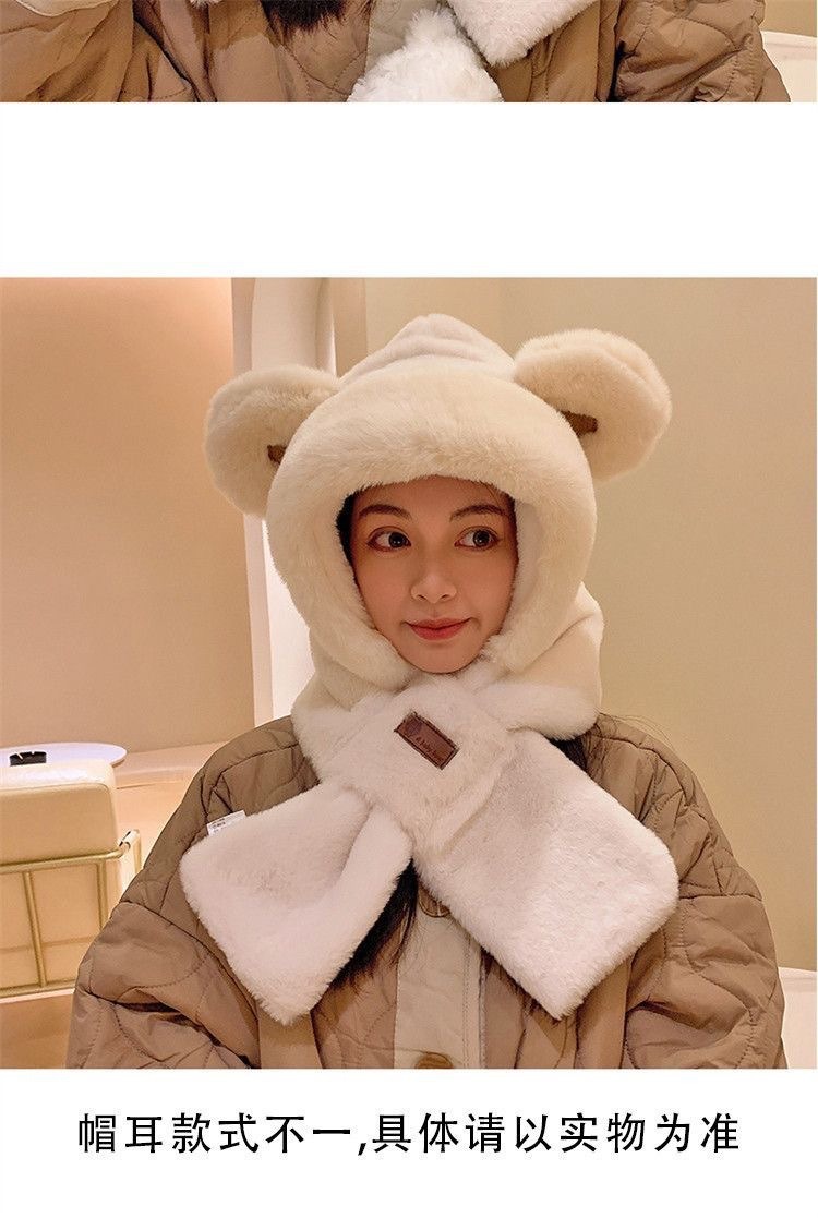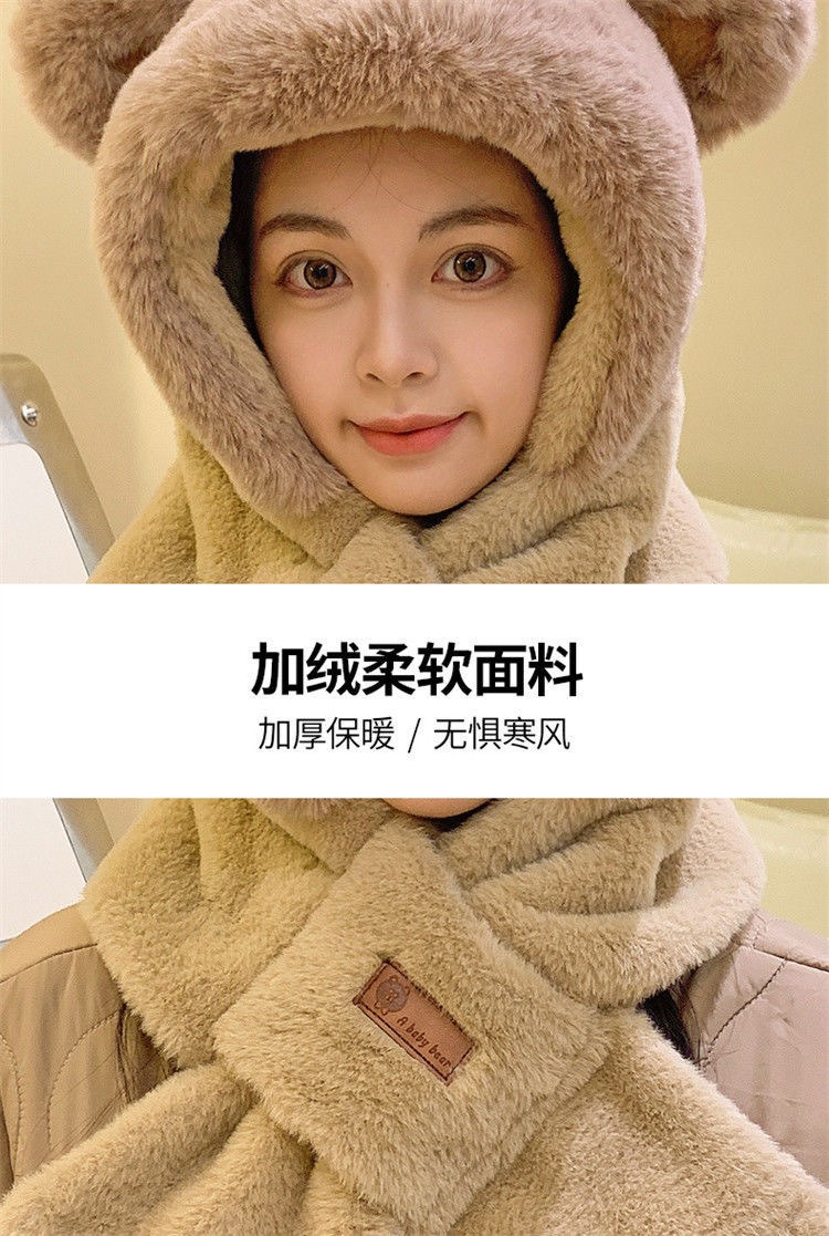 毛绒小熊帽子围巾一体加厚围脖可爱冬季百搭骑车保暖加绒护耳连帽