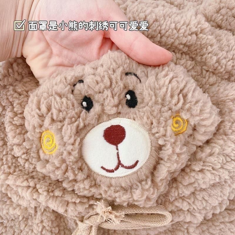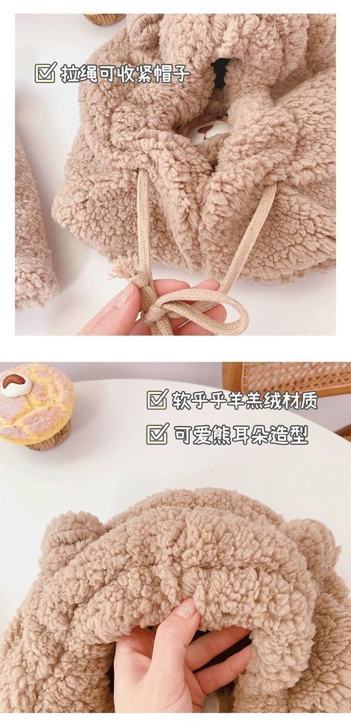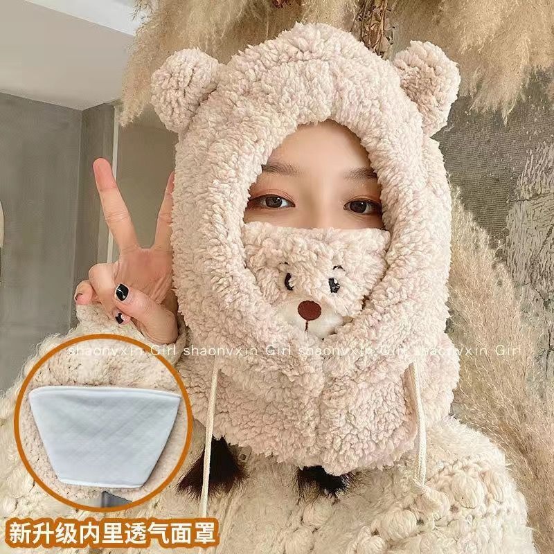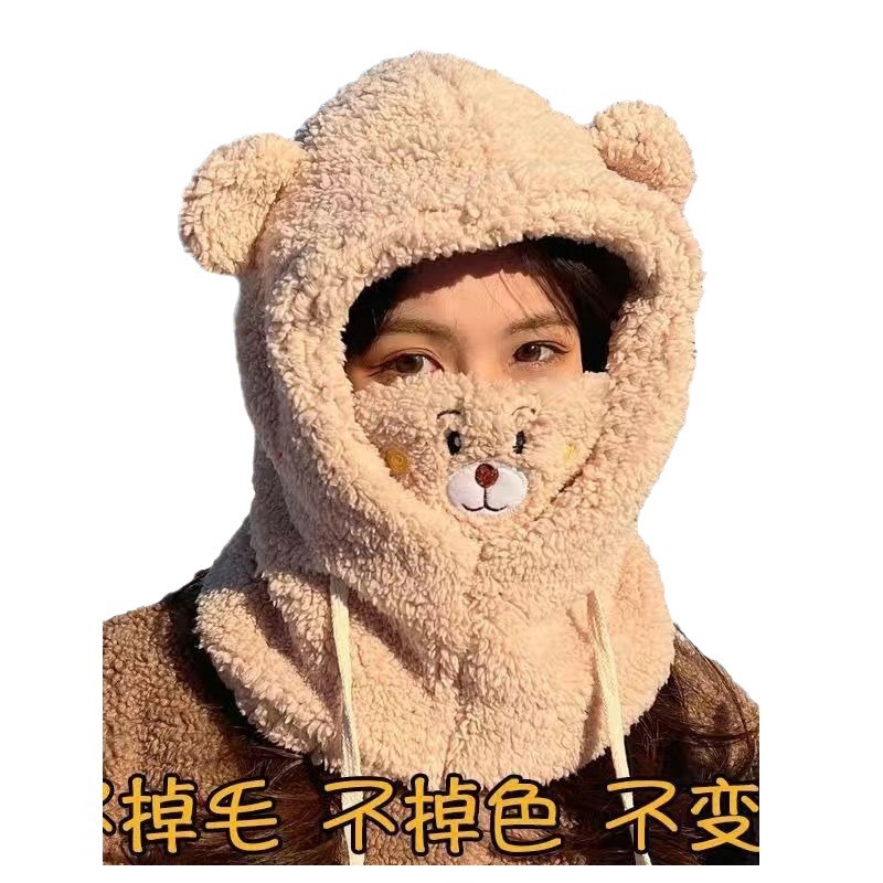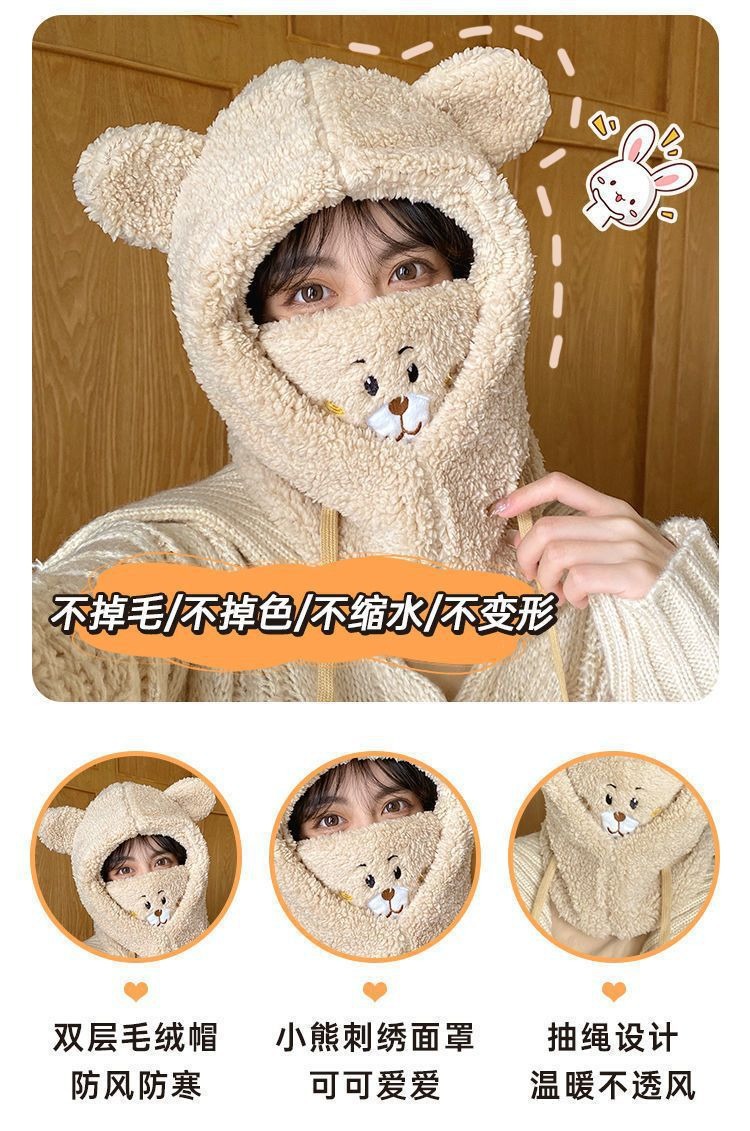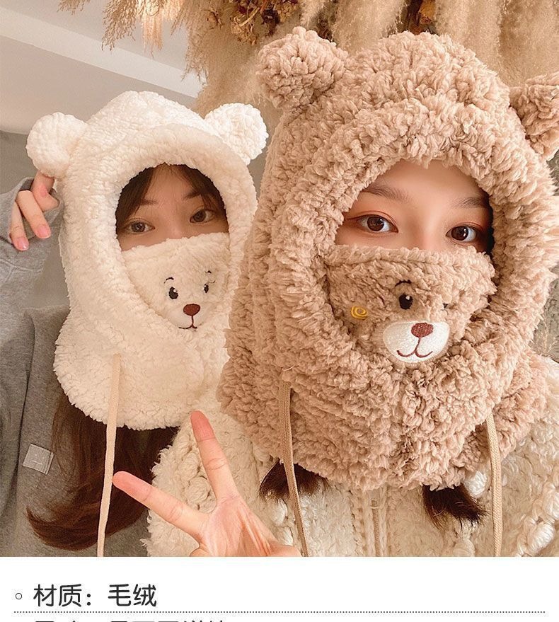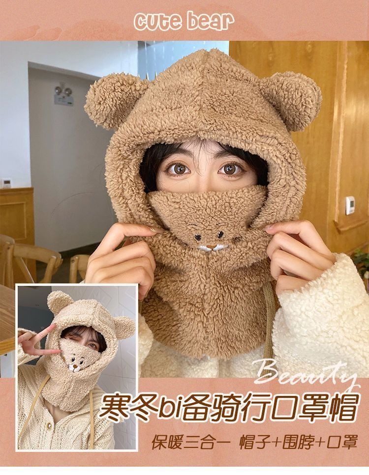 冬季可爱小熊围巾帽子保暖一体帽学生羊羔毛韩版女帽口罩毛绒帽