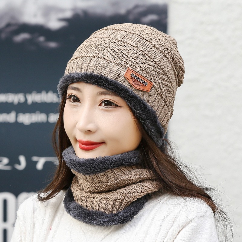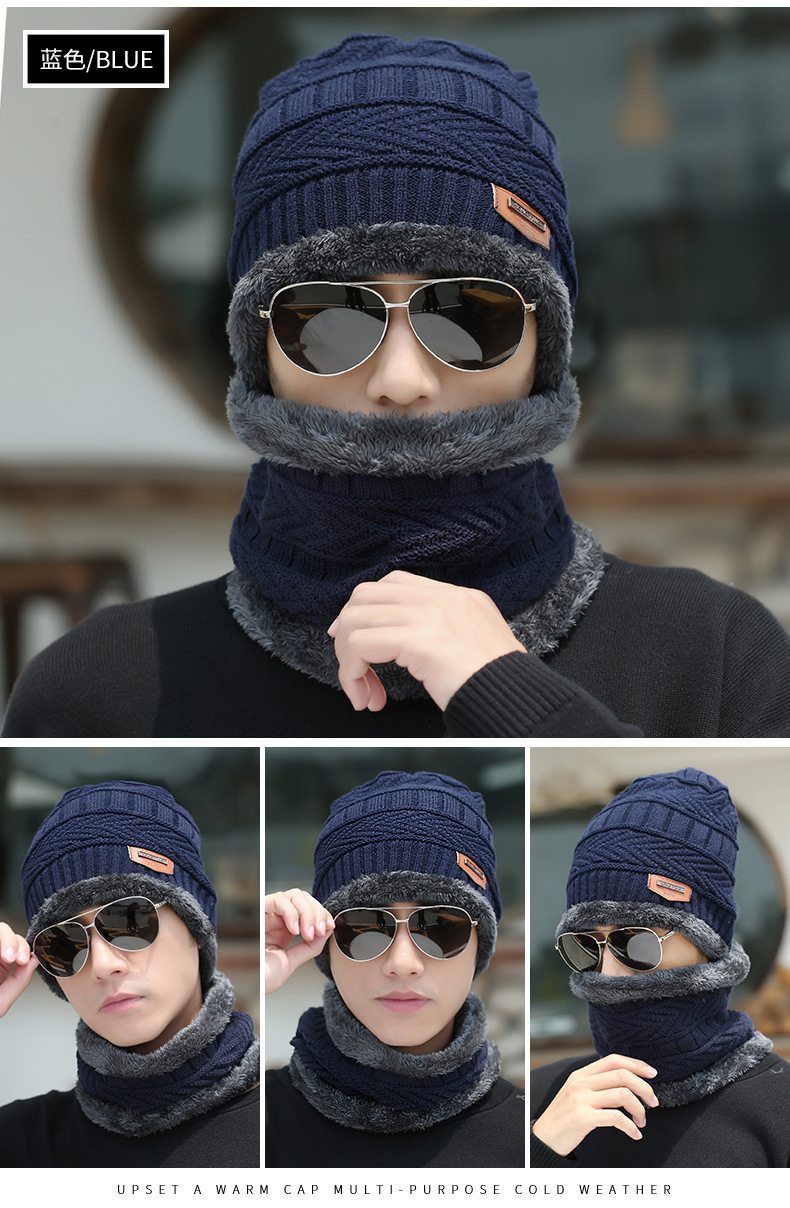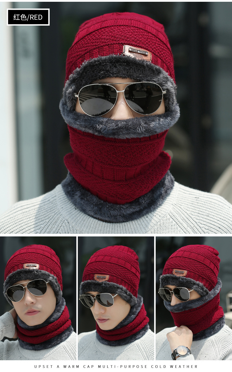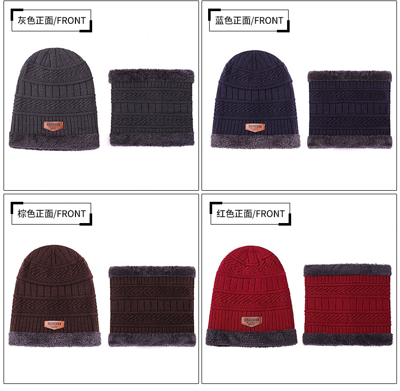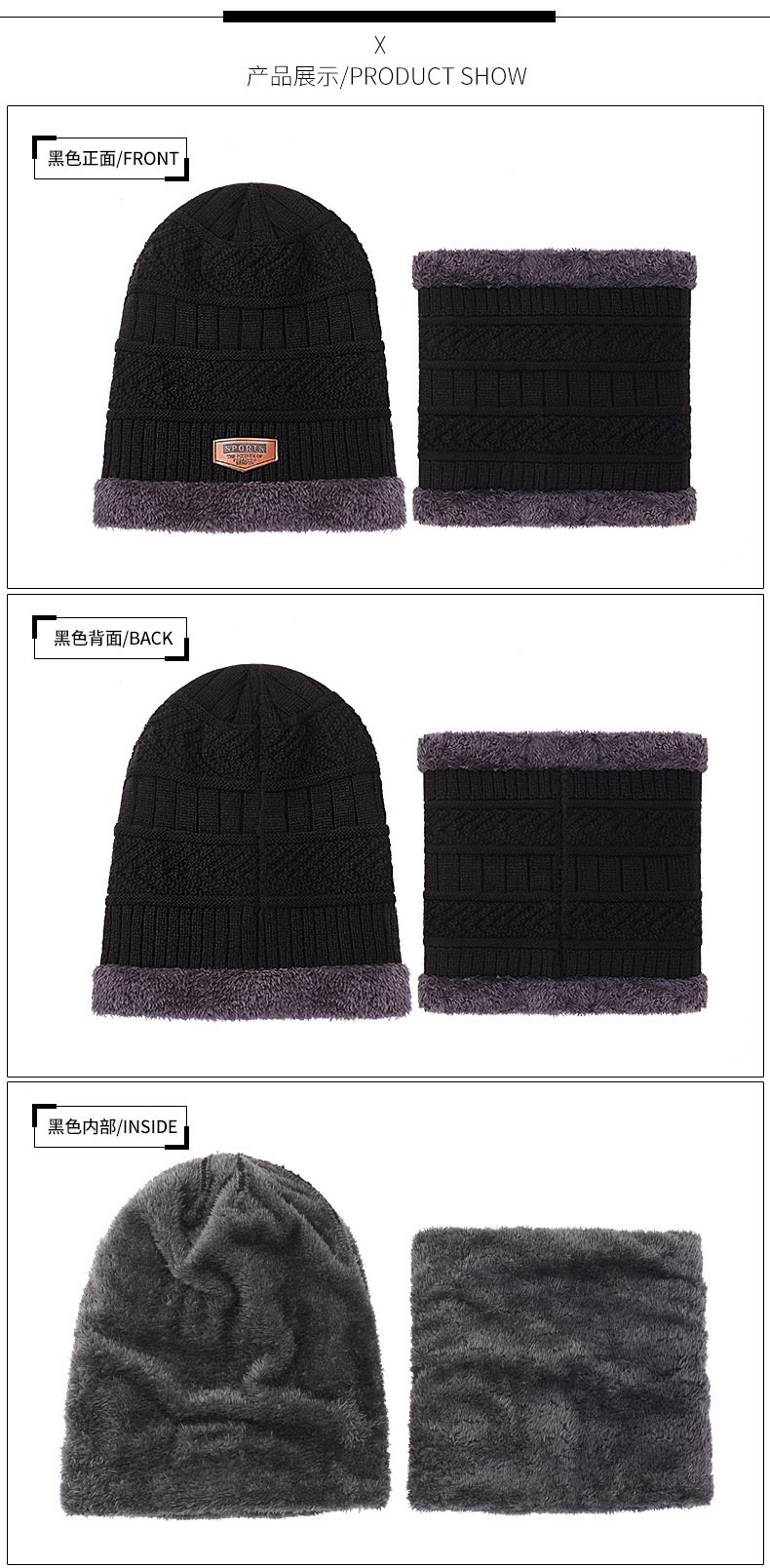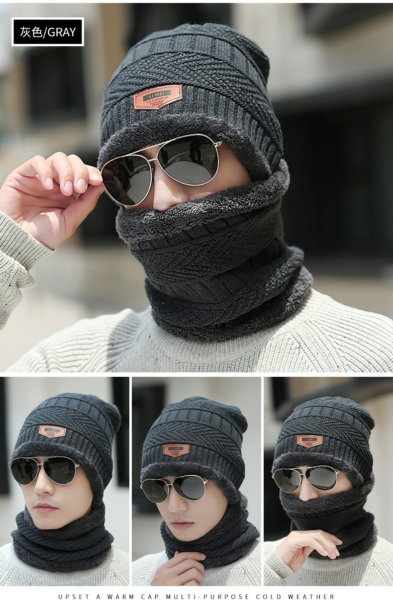 秋冬季保暖护脖毛线套帽男士加绒加厚针织帽子套头围脖两件套批发