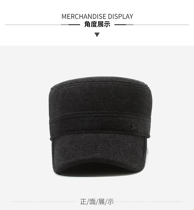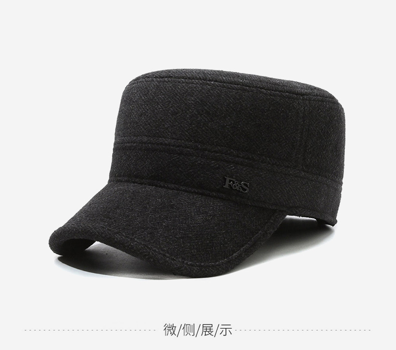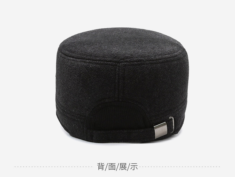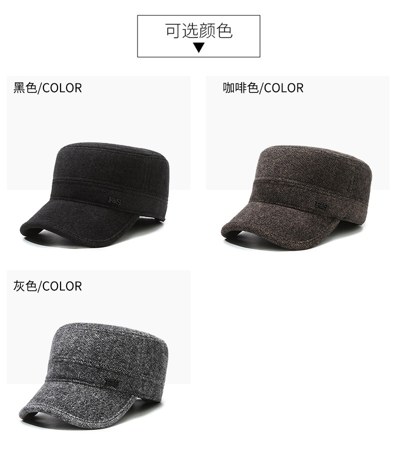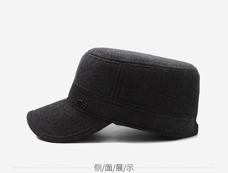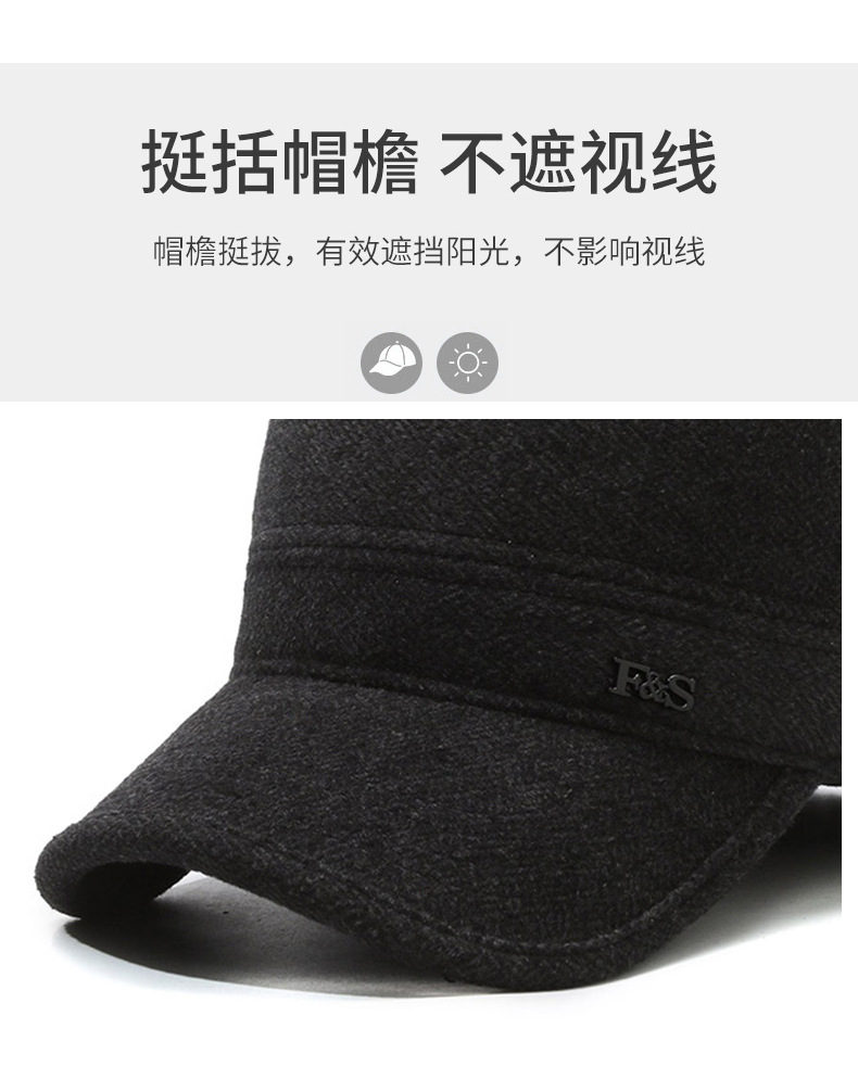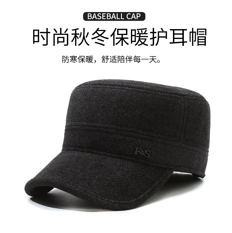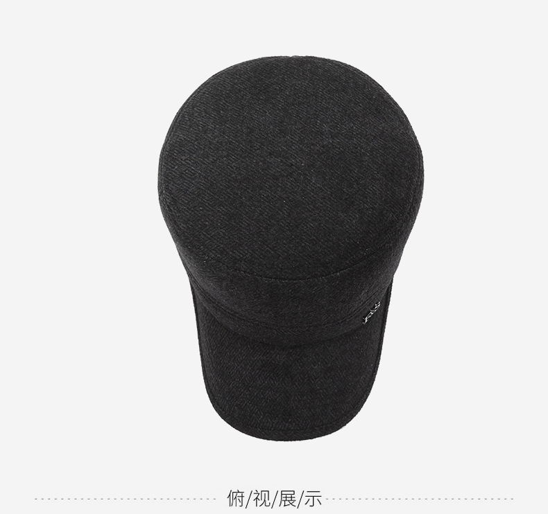 中老年人男士秋冬帽户外保暖防寒毛呢帽平顶帽加绒护耳鸭舌帽冬季