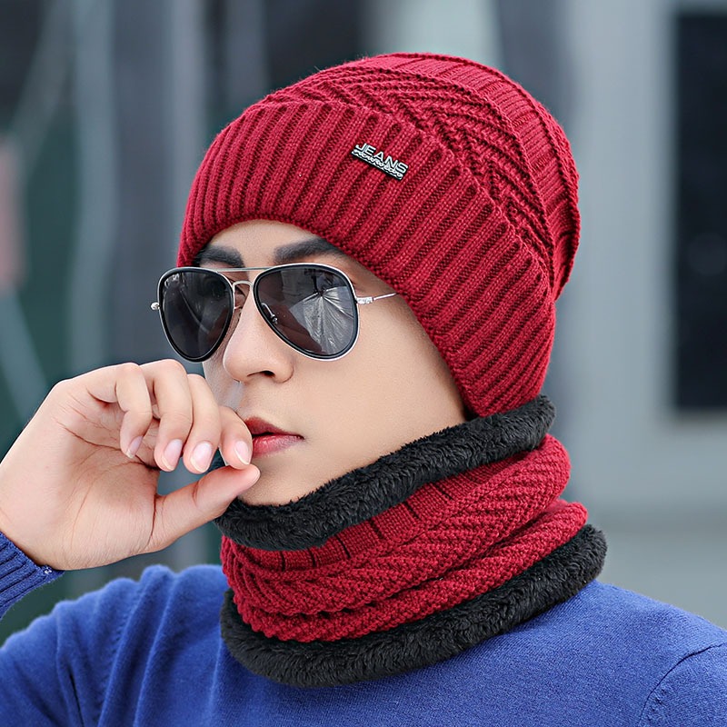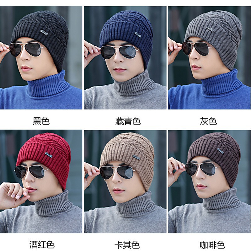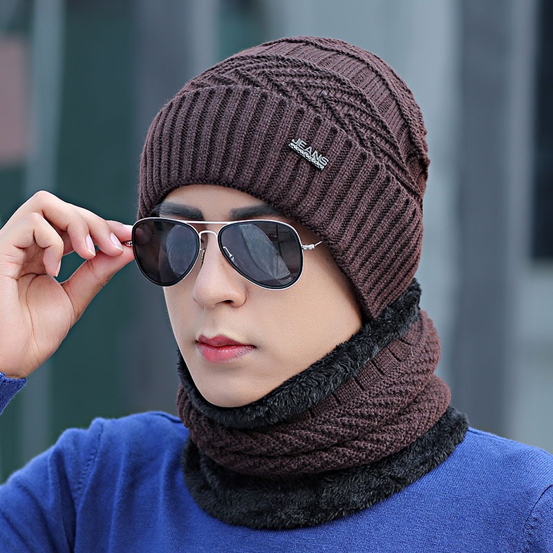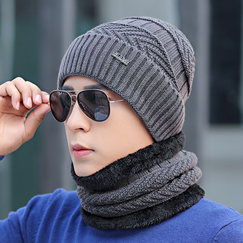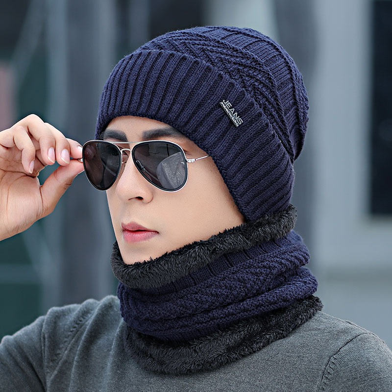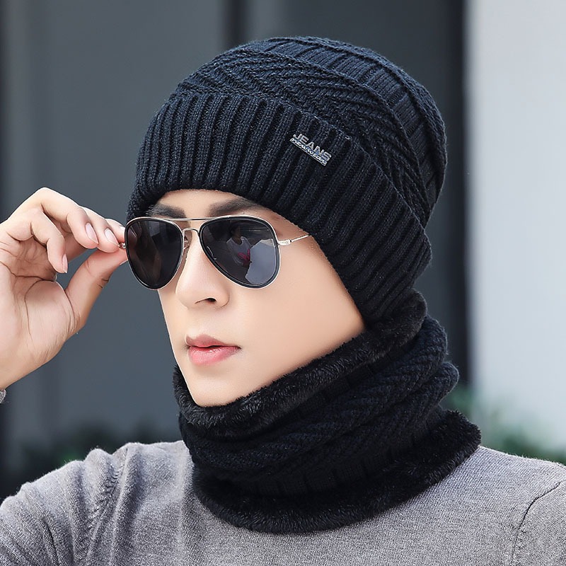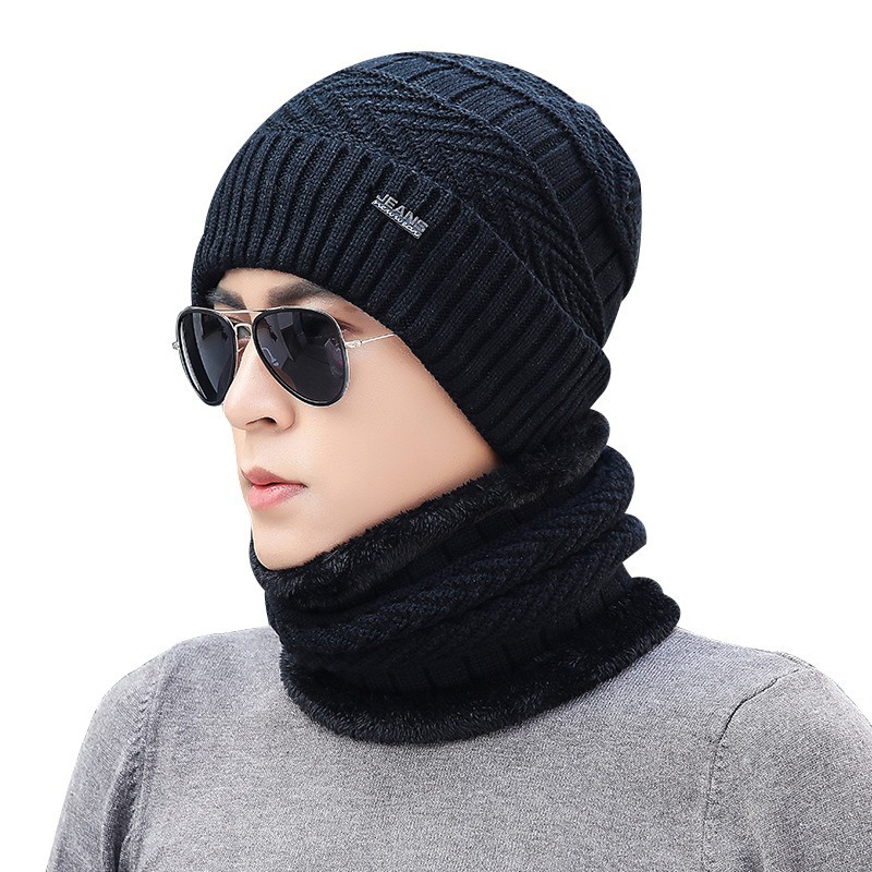 帽子围脖两件套加厚保暖加绒针织帽男户外运动骑车护耳防寒毛线帽