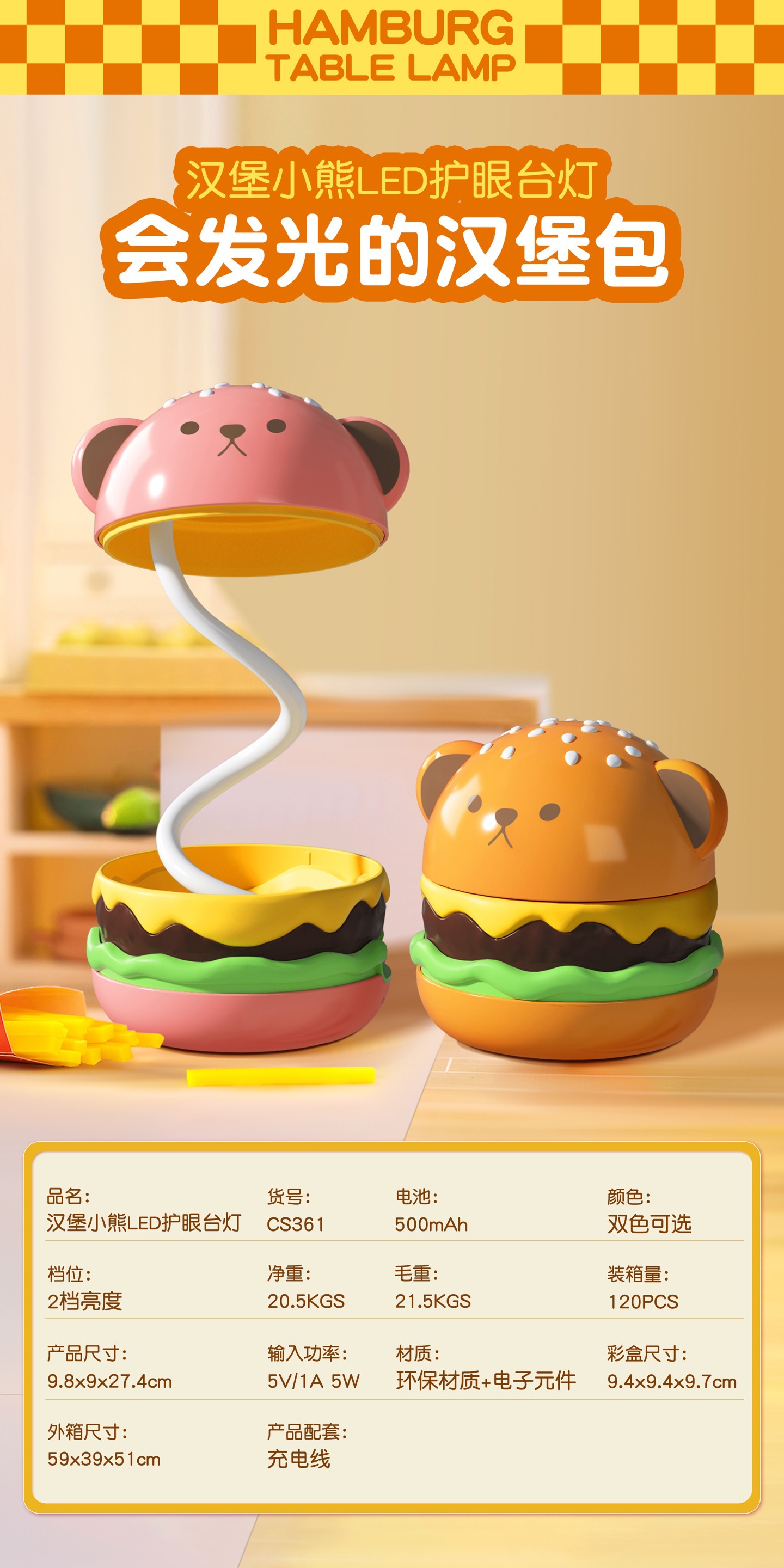 汉堡小熊充电USB护眼台灯桌面立式台灯小夜灯学生宿舍用萌宠夜灯