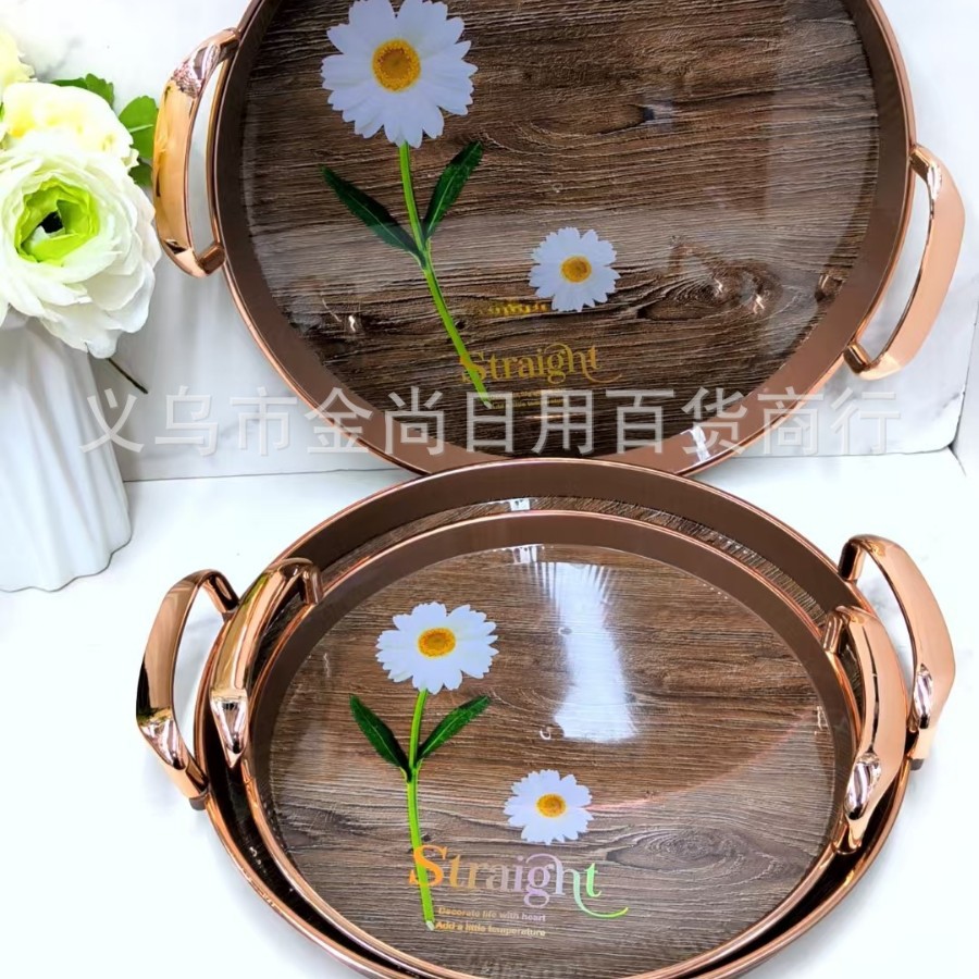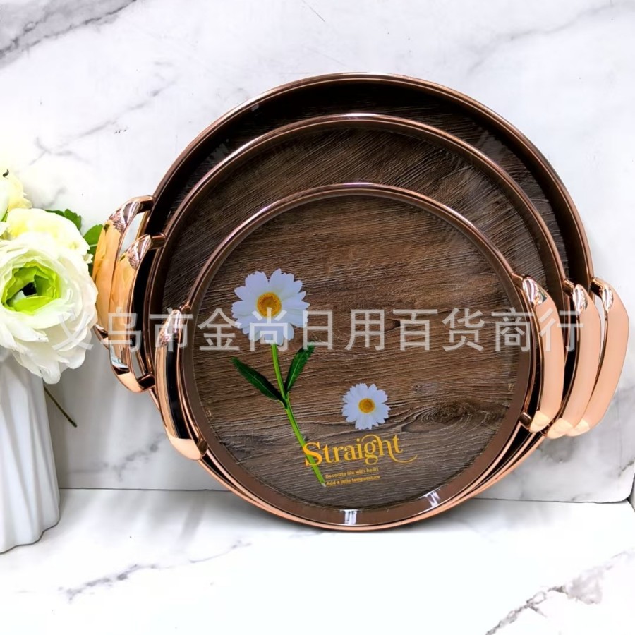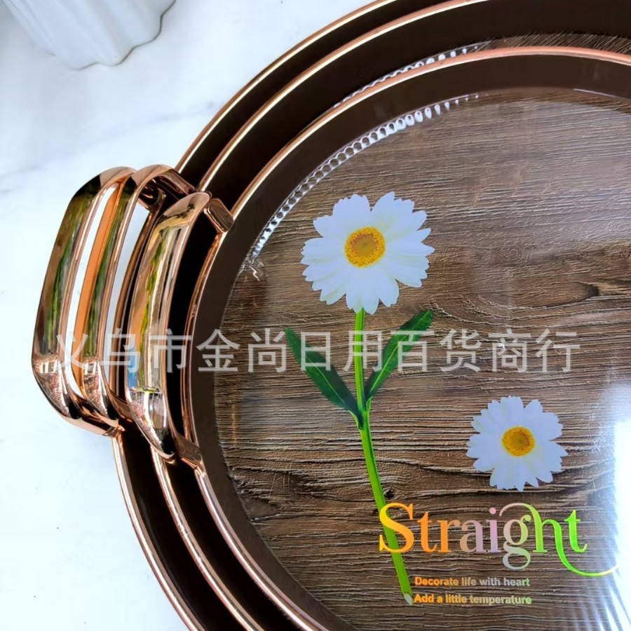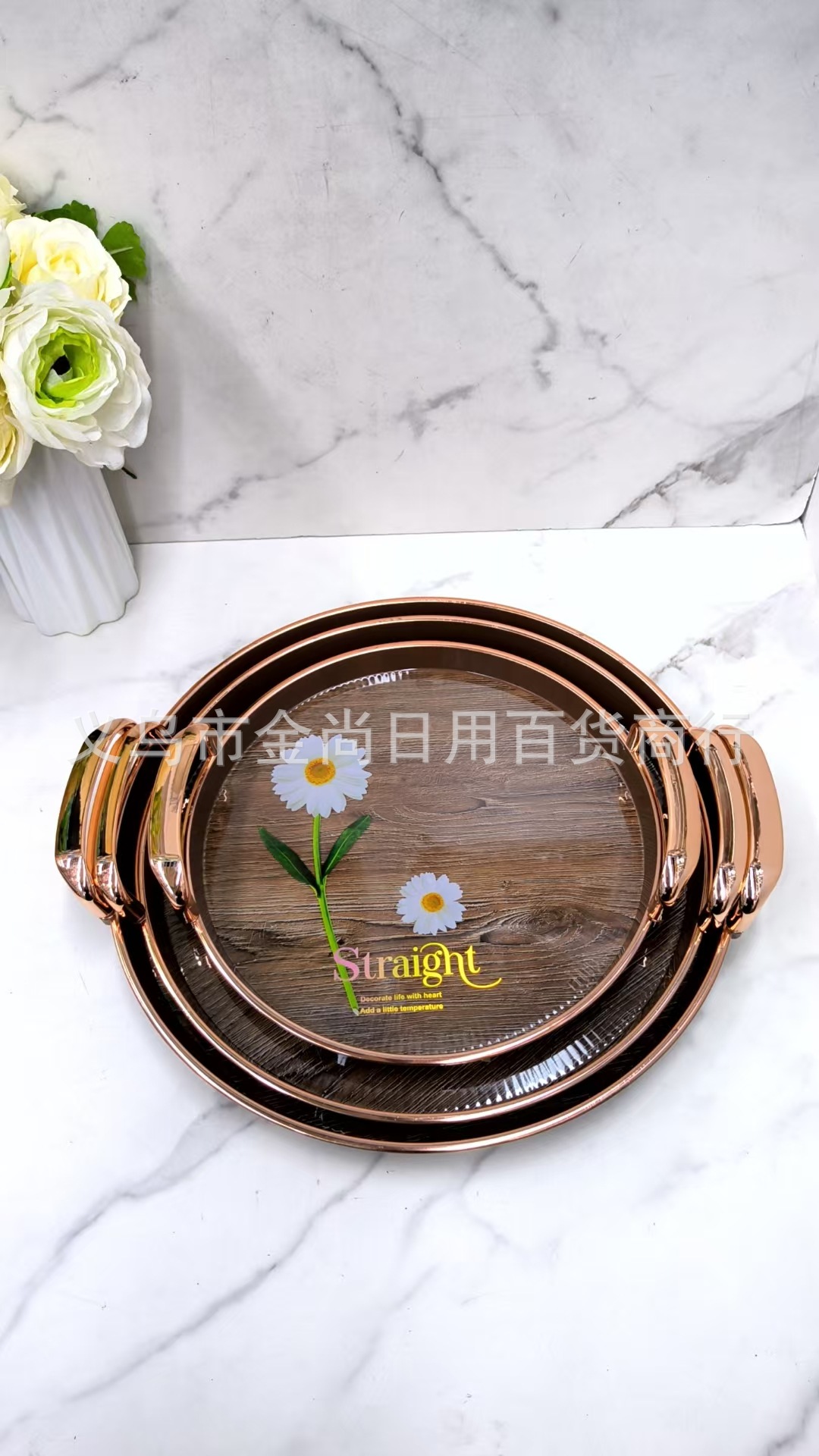 圆形家用塑料图案花托盘餐用水果托盘高级感饮料盘子圆形塑料