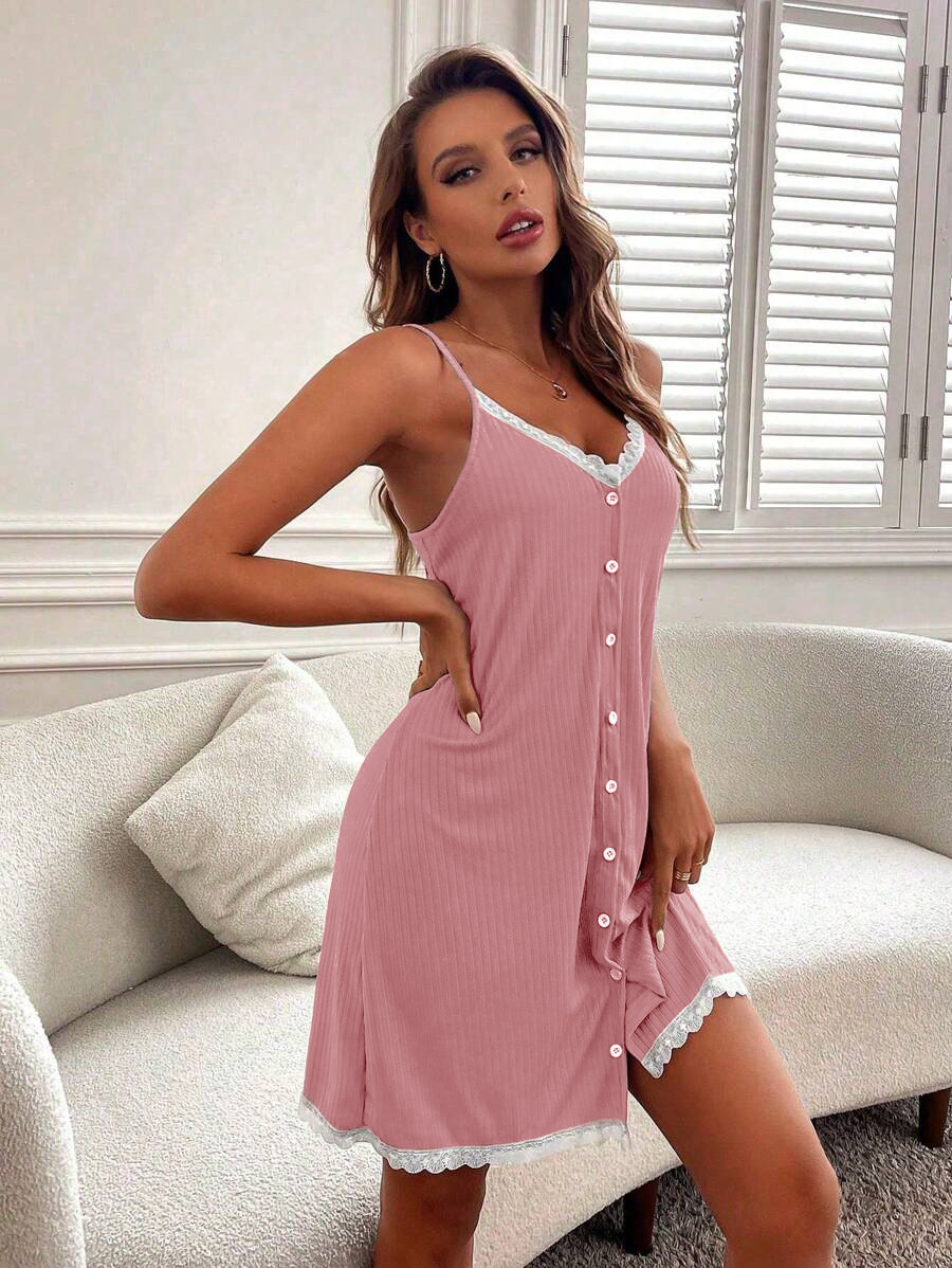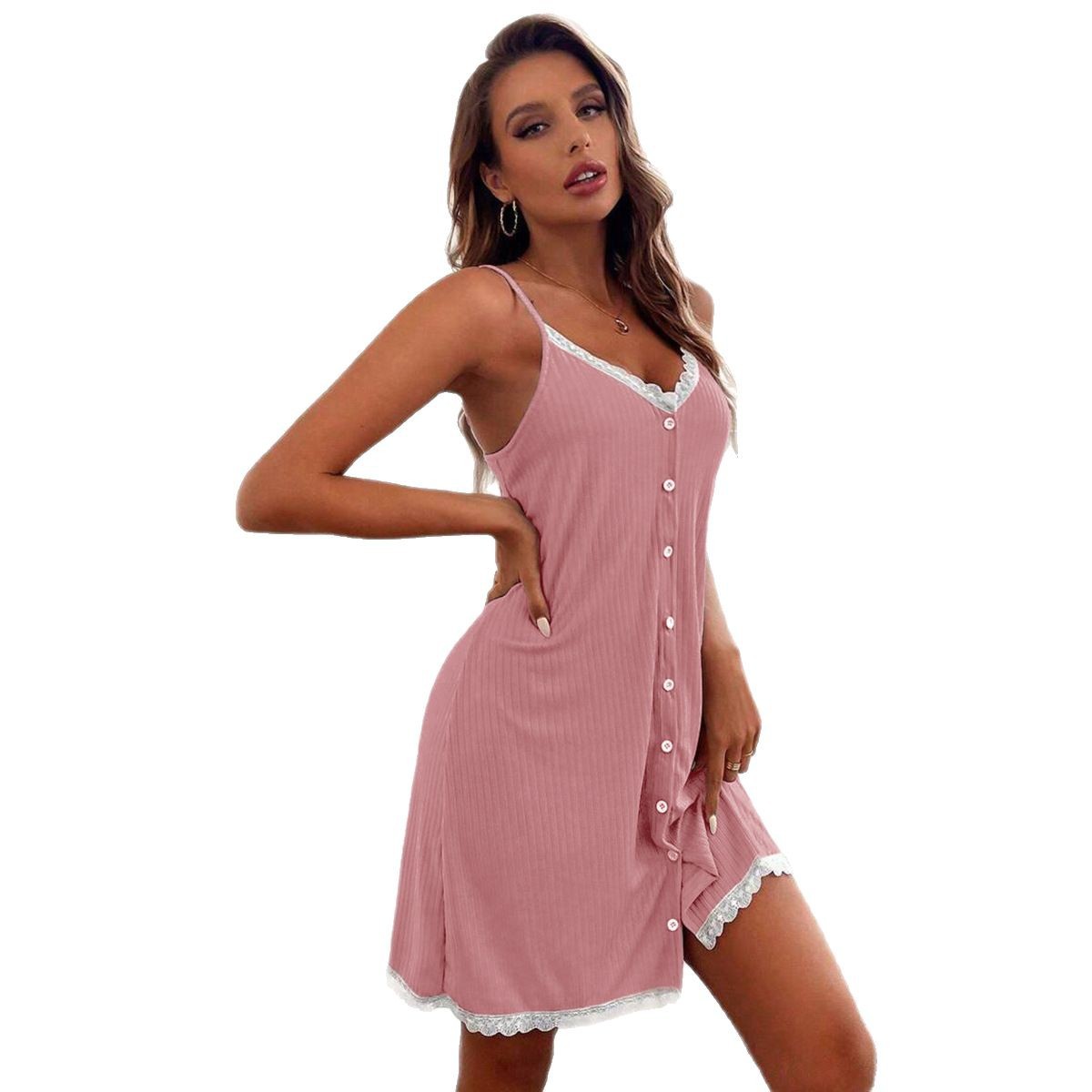 欧美睡衣女跨境夏季可外穿蕾丝花边纽扣性感吊带裙子休闲家居服女