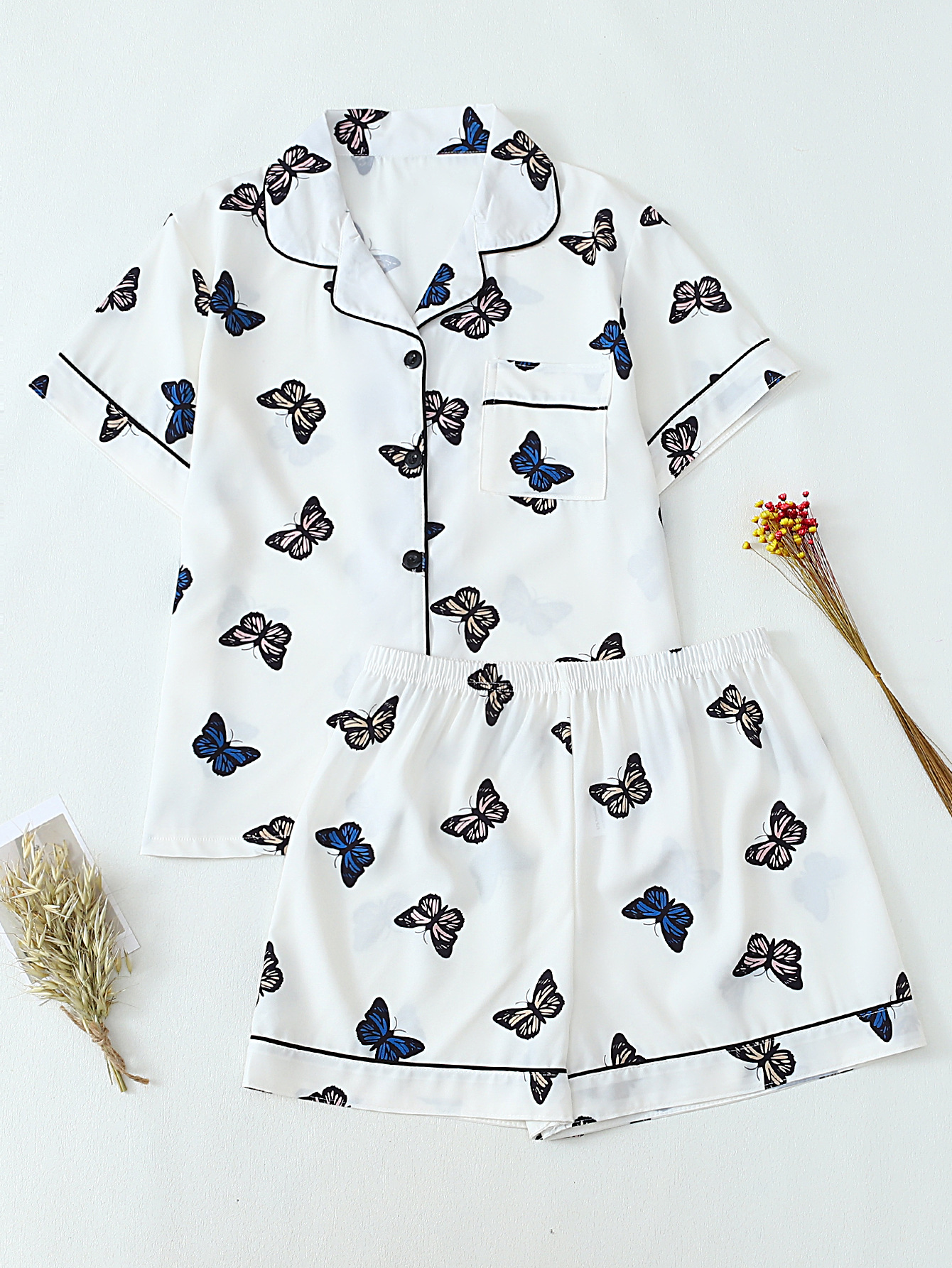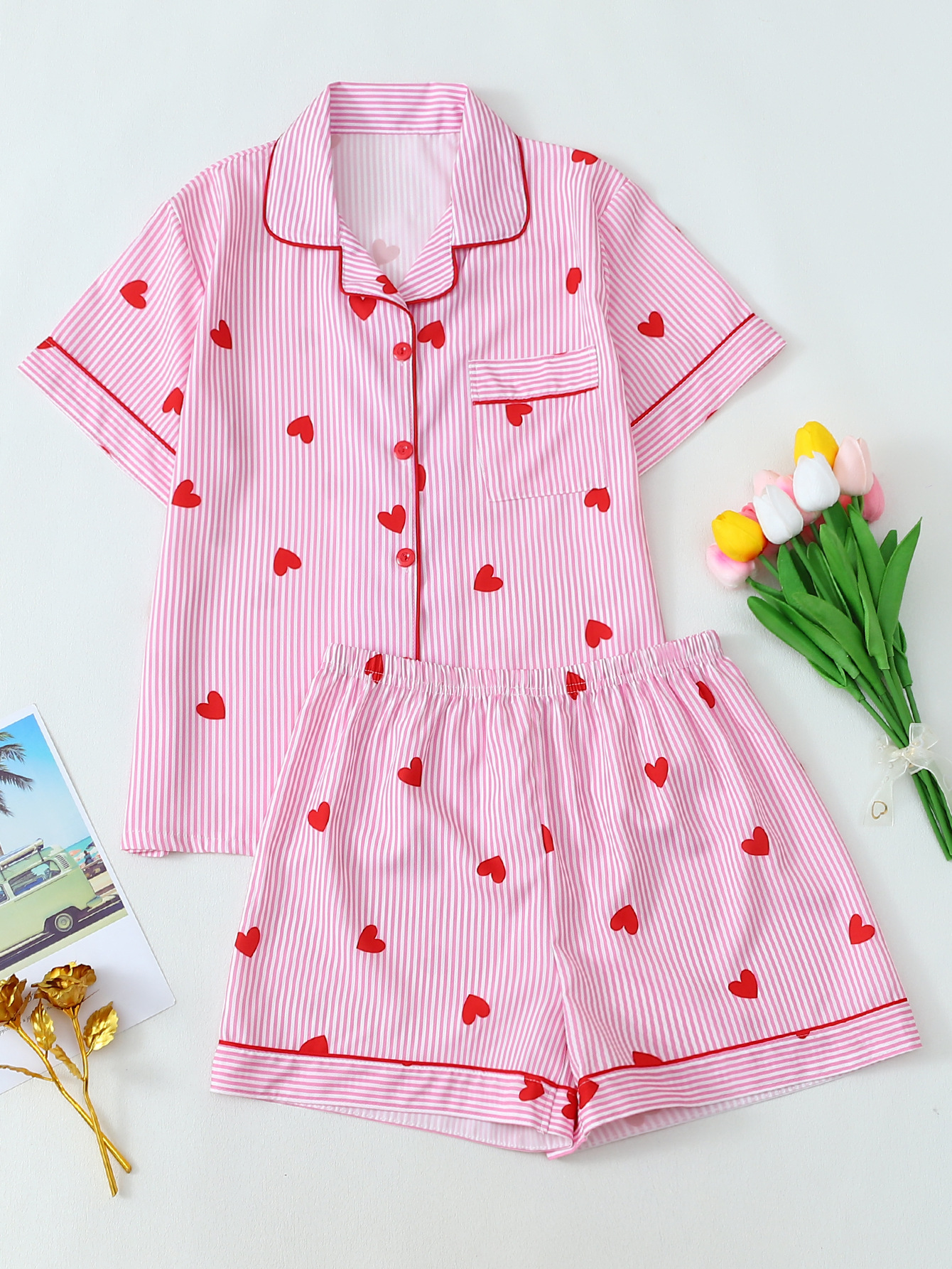 跨境宽松休闲开衫睡衣欧美时尚设计感多色印花短袖短裤两件套装女