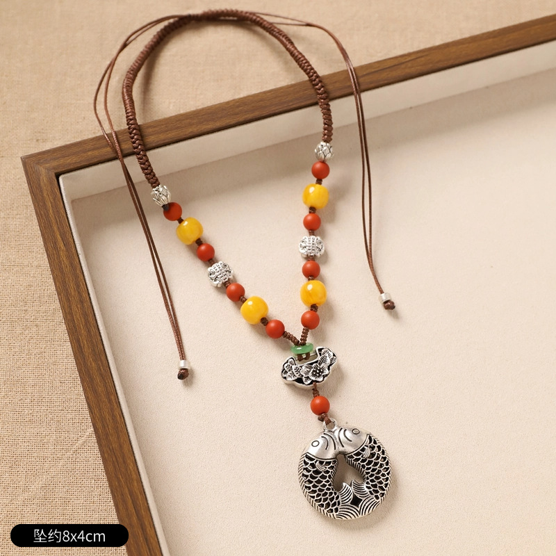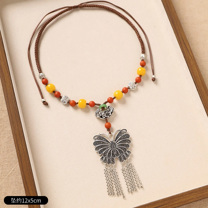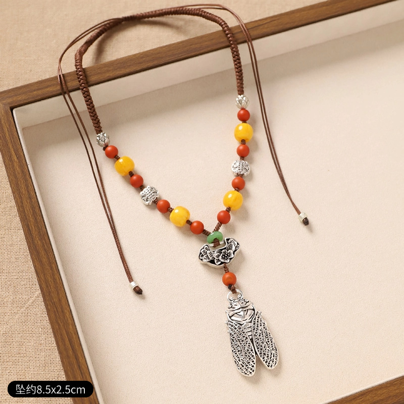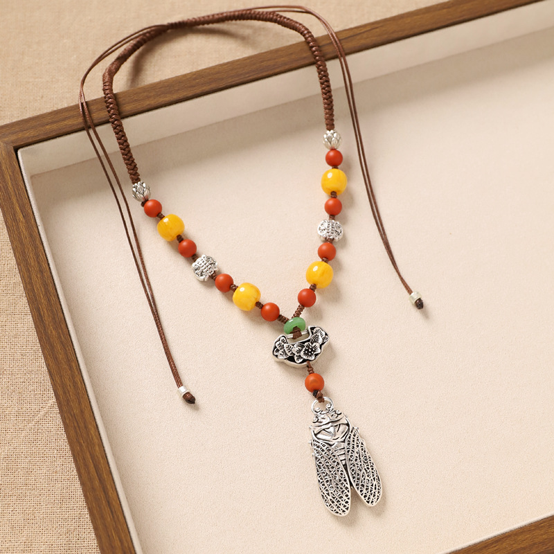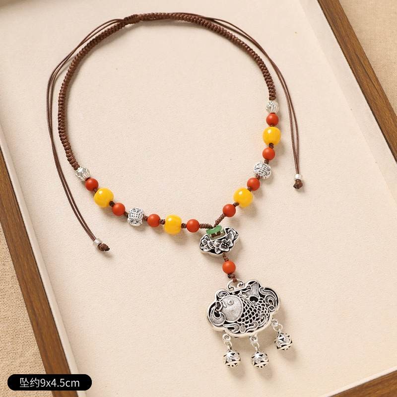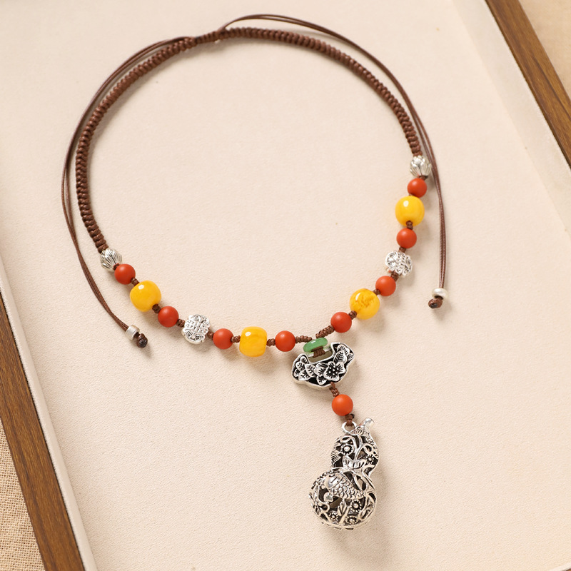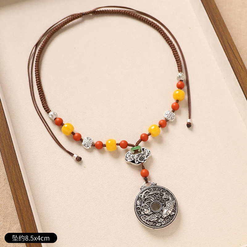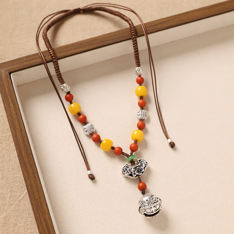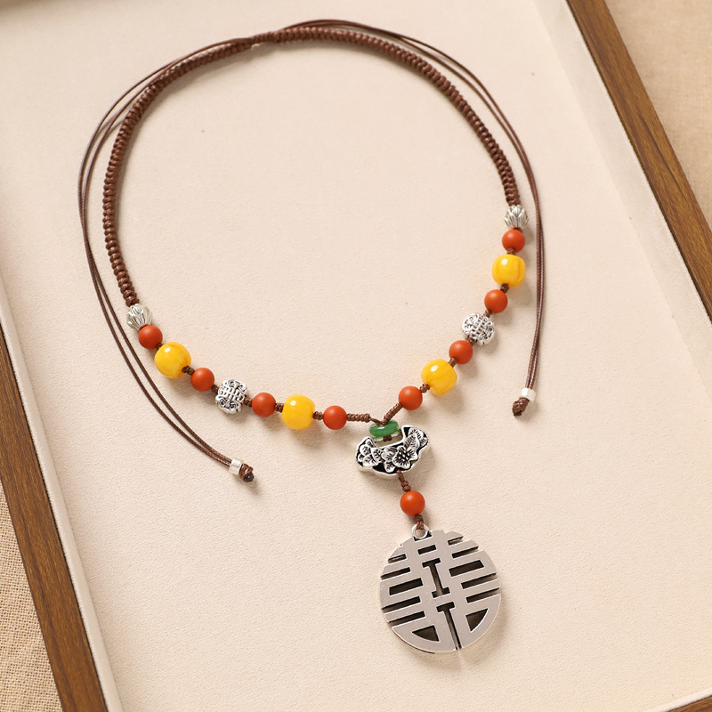 新中式民族风编织蜜蜡项链高级感银吊坠女气质锁骨链国风复古配饰