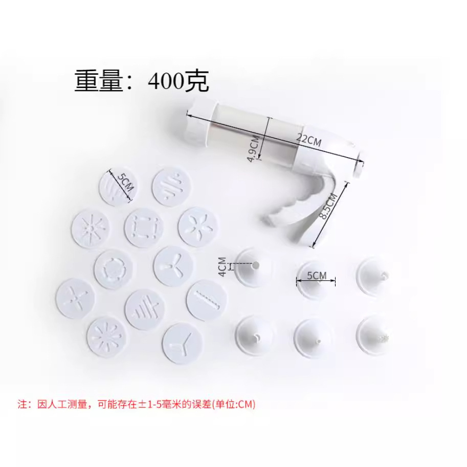 规格:高度22cm 透明桶身15cm 曲奇模具直径5cm 厚度2.6mm 裱花嘴底部直径5cm
