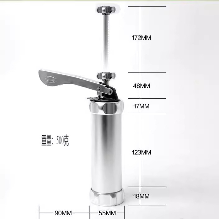 小补充:作为饼干机使用时,手柄每按压一次即成品一个,多可做20个;机械控制,成品大小厚薄一致。作为裱花枪使用时按住手柄前端按纽,利用上方拉杆操作,挤出量任由自己控制。