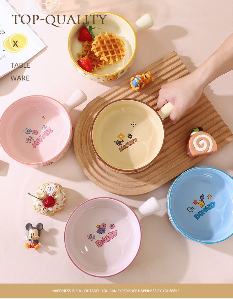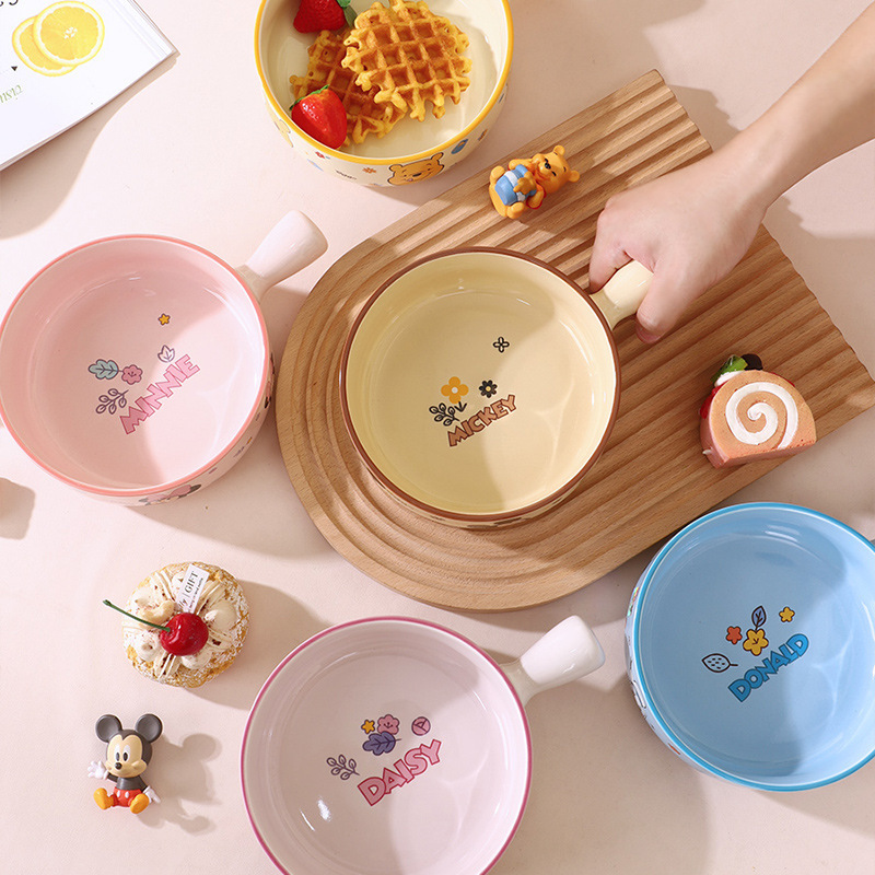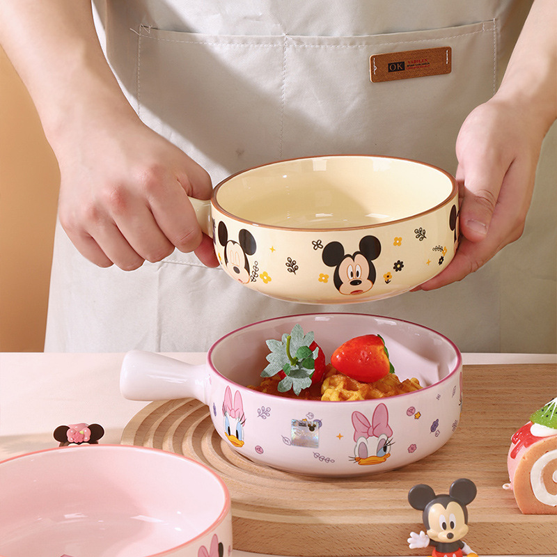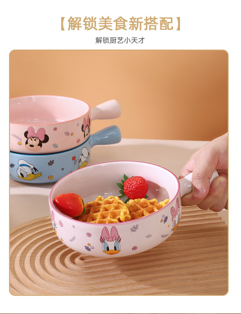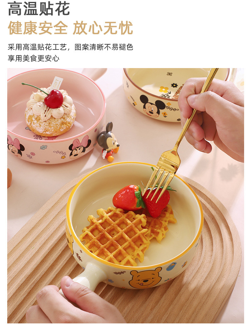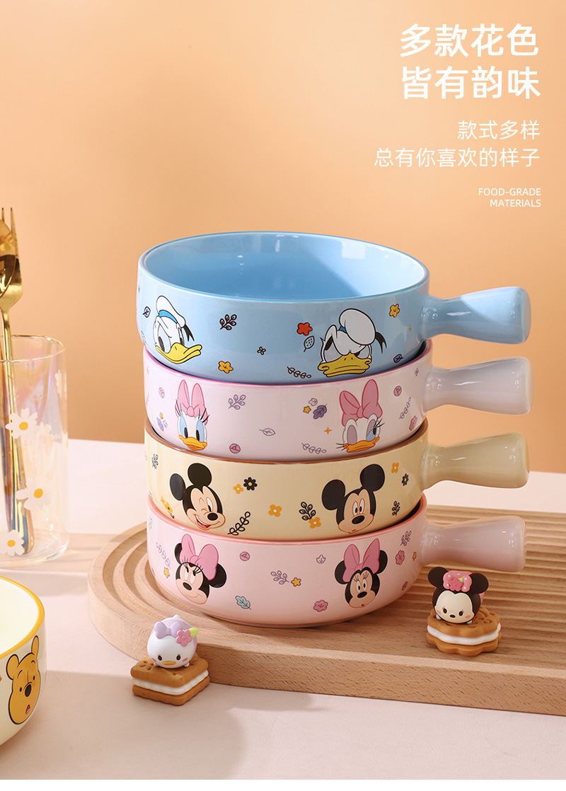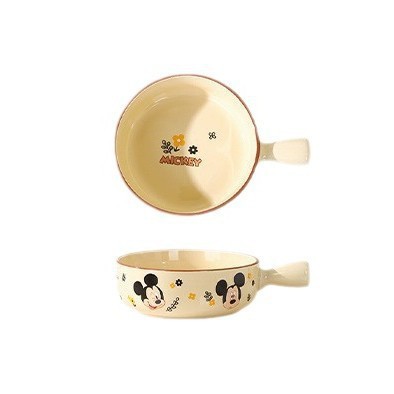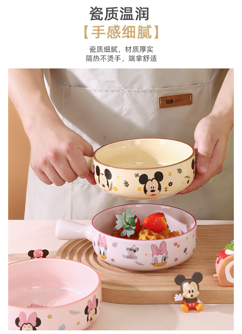 米奇卡通陶瓷碗带手柄不烫手加厚单柄烤碗圆形儿童早餐泡面碗汤碗