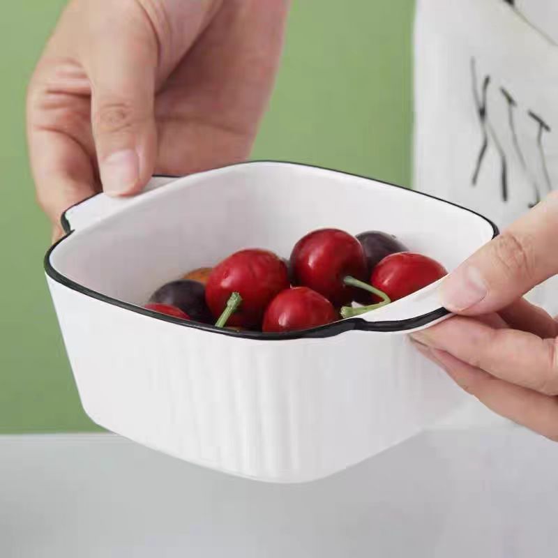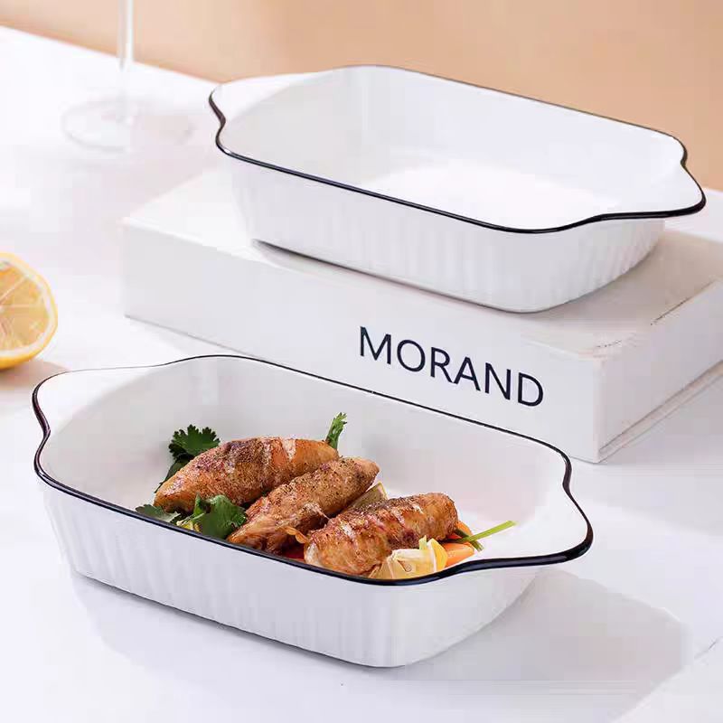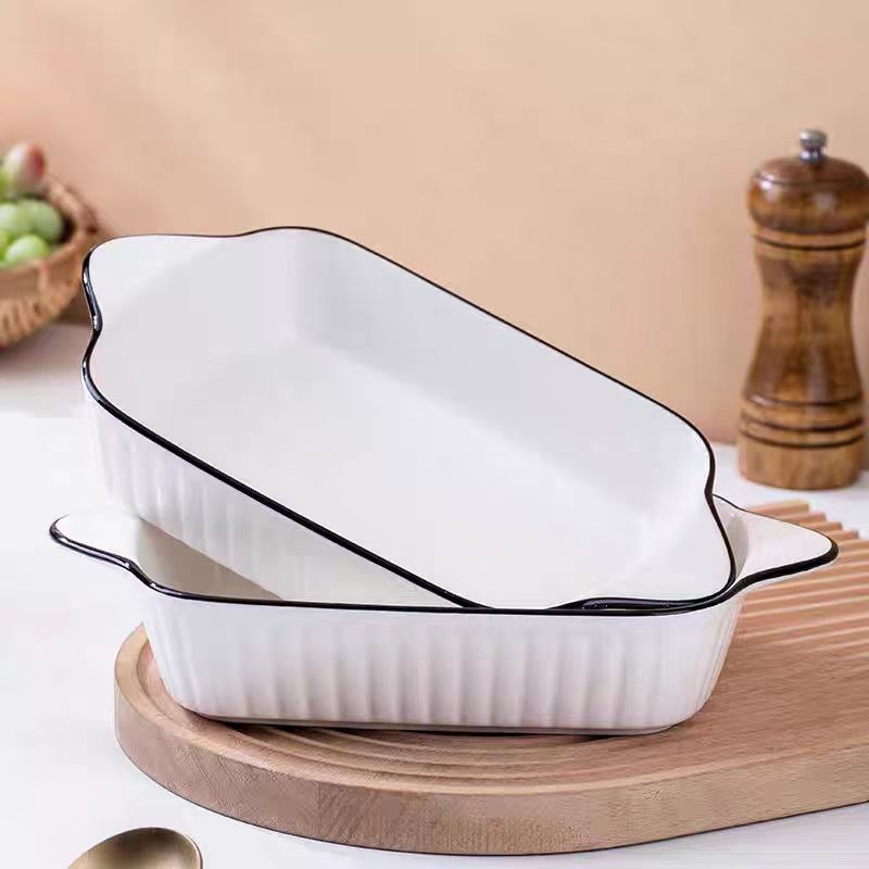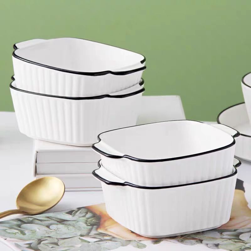 北欧风家用黑线5.75英寸双耳竖纹四方碗4只装甜品烤箱烘焙蒸蛋碗