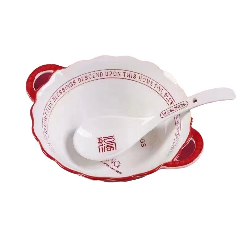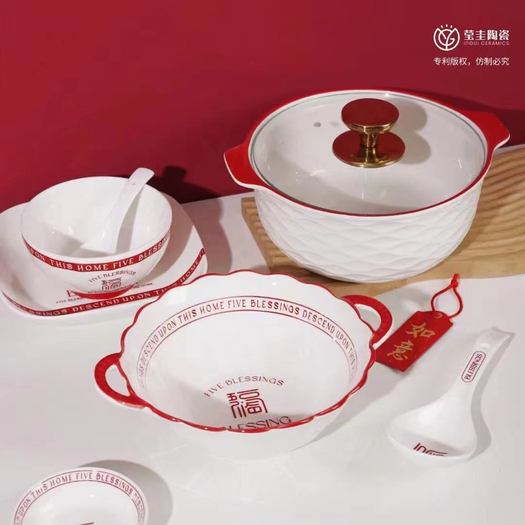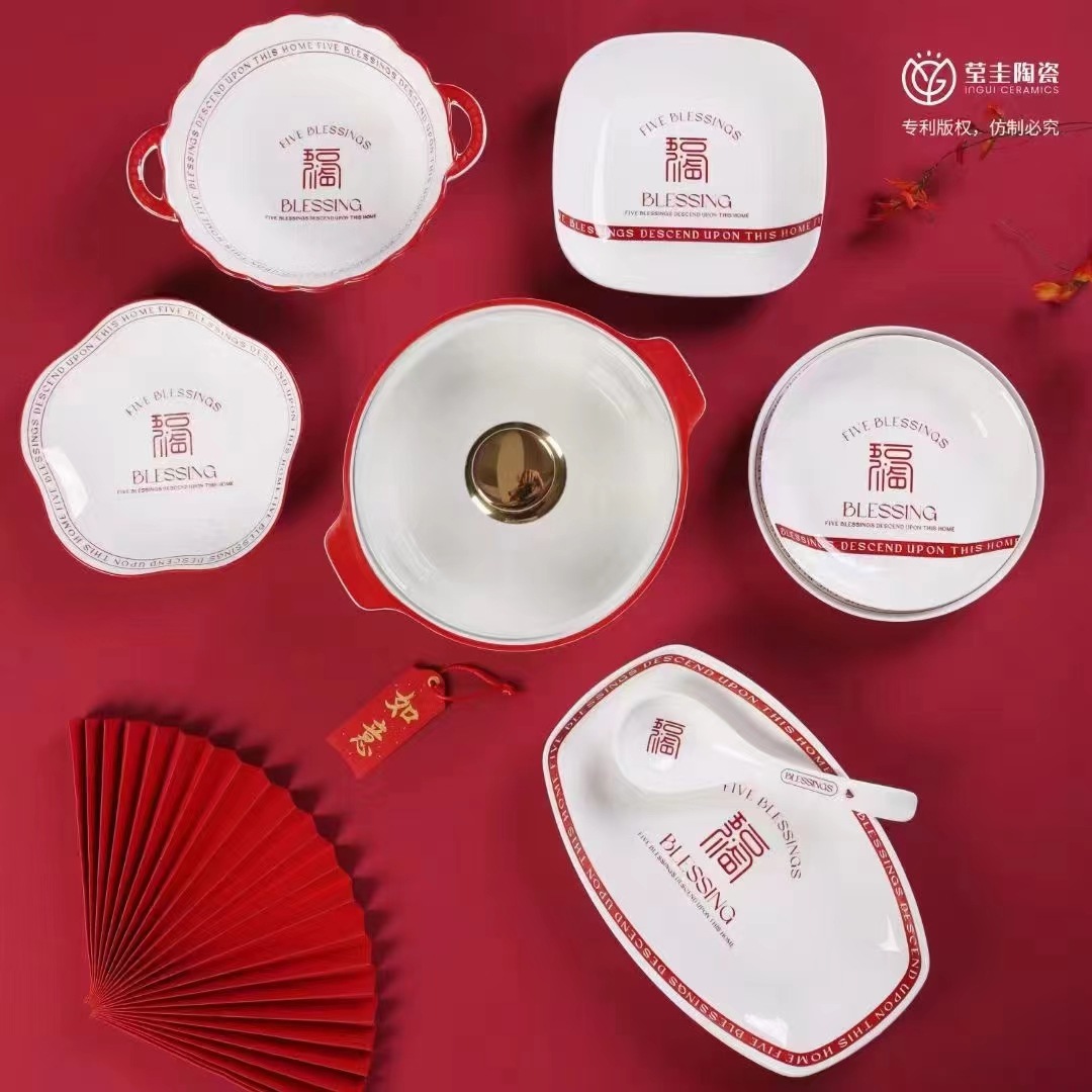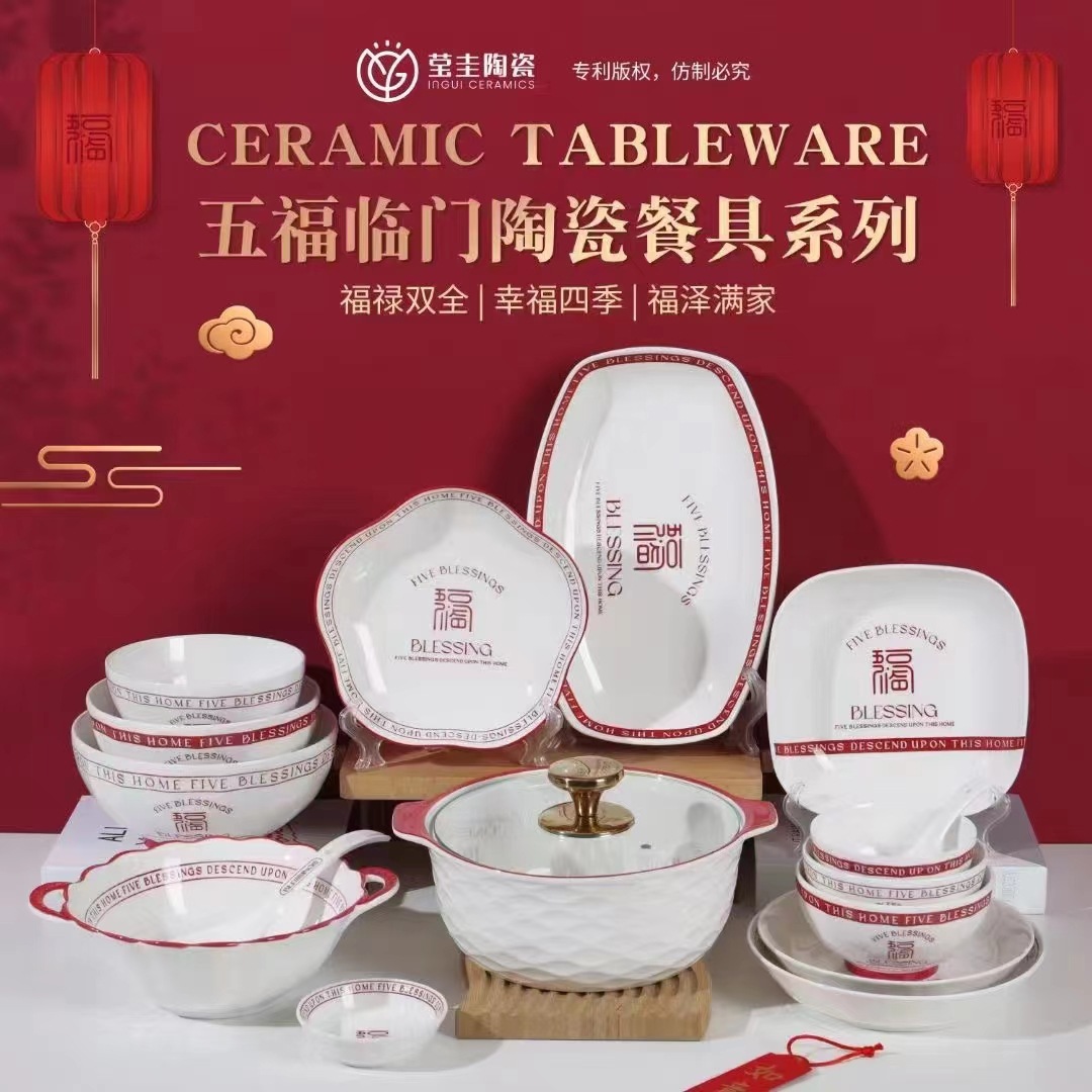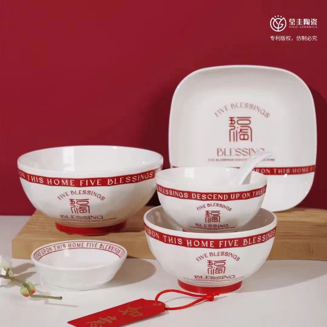 家用网红五福临门系列陶瓷碗盘米饭碗菜盘汤盘釉下彩碗盘可微波