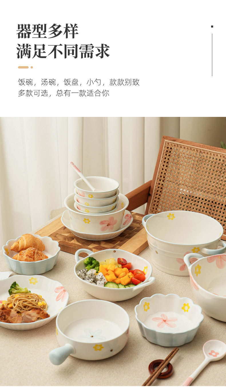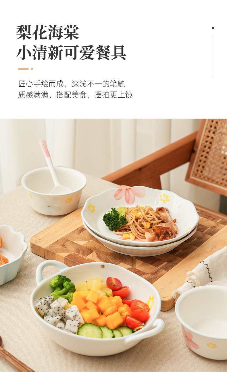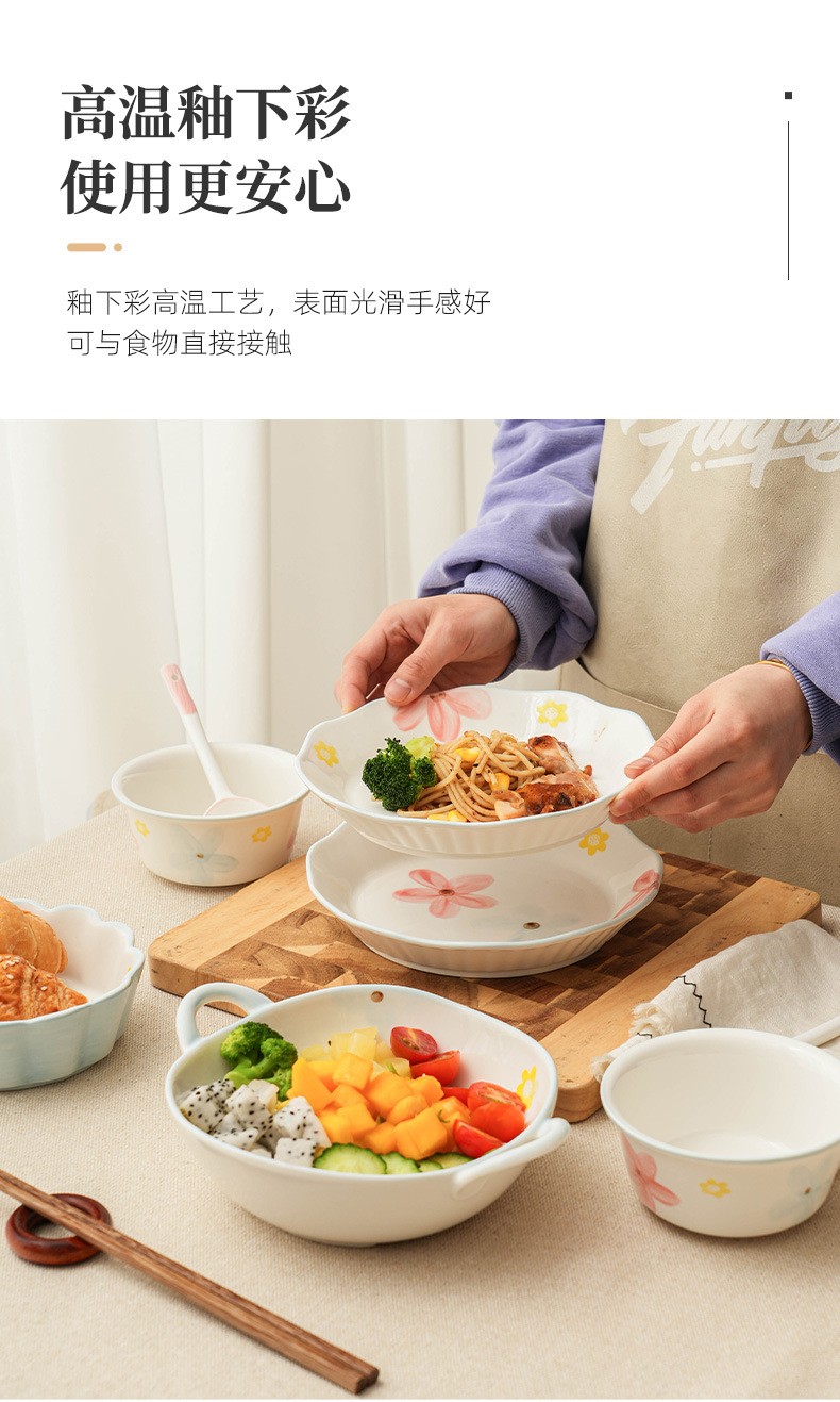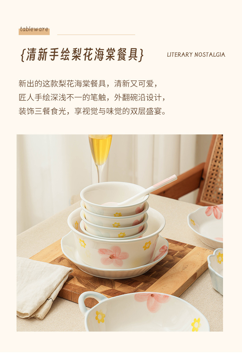 梨花海棠手绘陶瓷餐具高颜值釉下彩家用饭碗大号汤碗菜盘烘焙烤碗