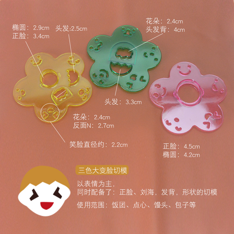 可爱饭团寿司造型器的简单操作视频(实物中不附带食谱) 【商品内容】一套3个造型模板:人物脸部、动物脸部、迷你人物脸部3个模板。 【使用方法】用模板将食材刻出形状,装饰在便当、米饭、丸子、点心等上即可。 【使用注意】①能加工的食材:适用于有些厚度又不太硬的食材,如:芝士片、煮海带、 ②不能加工紫菜:紫菜很薄,需要用专门的紫菜压花器,这两种商品的 ③本页下部有推荐食谱的中文翻译,请下载参考。 。