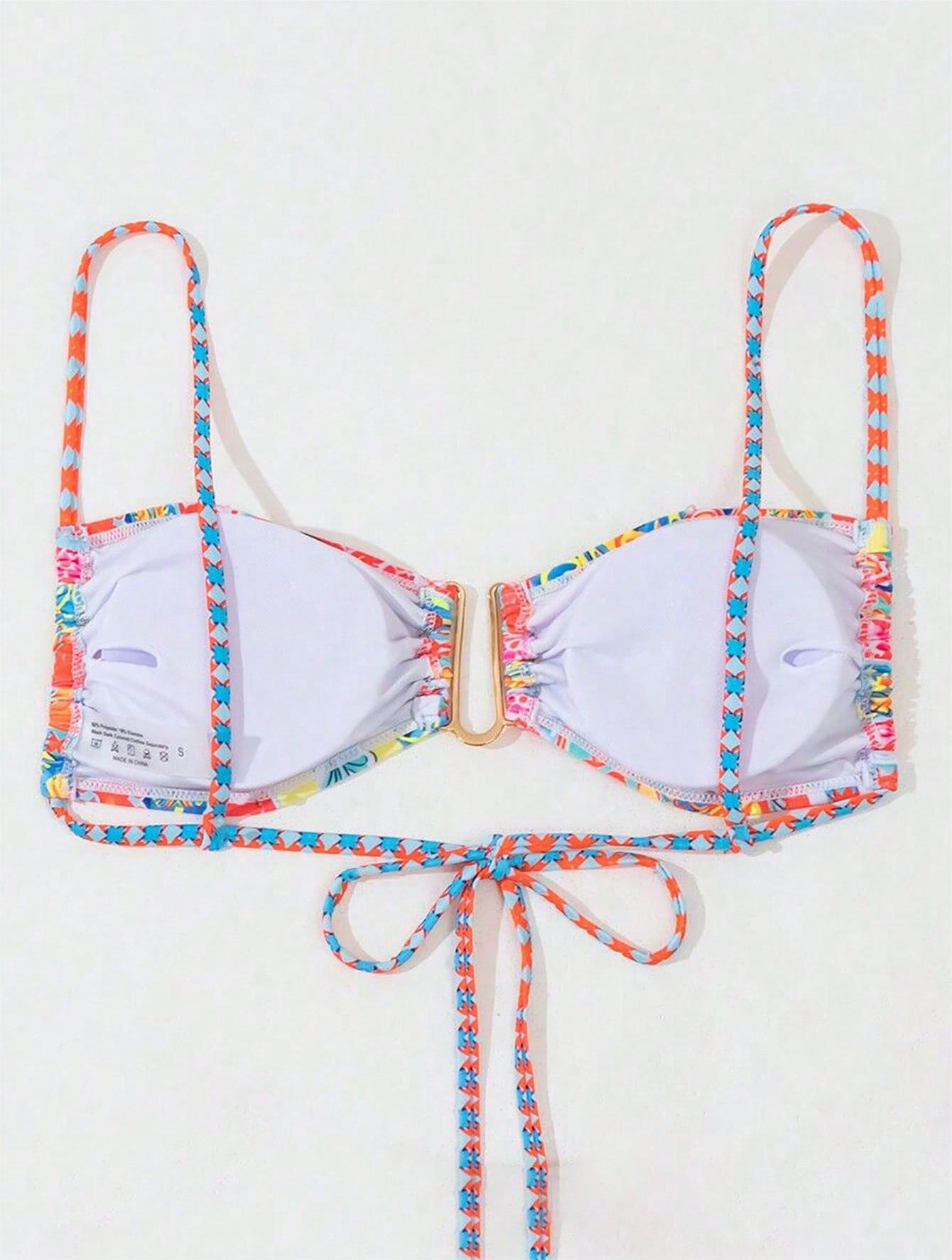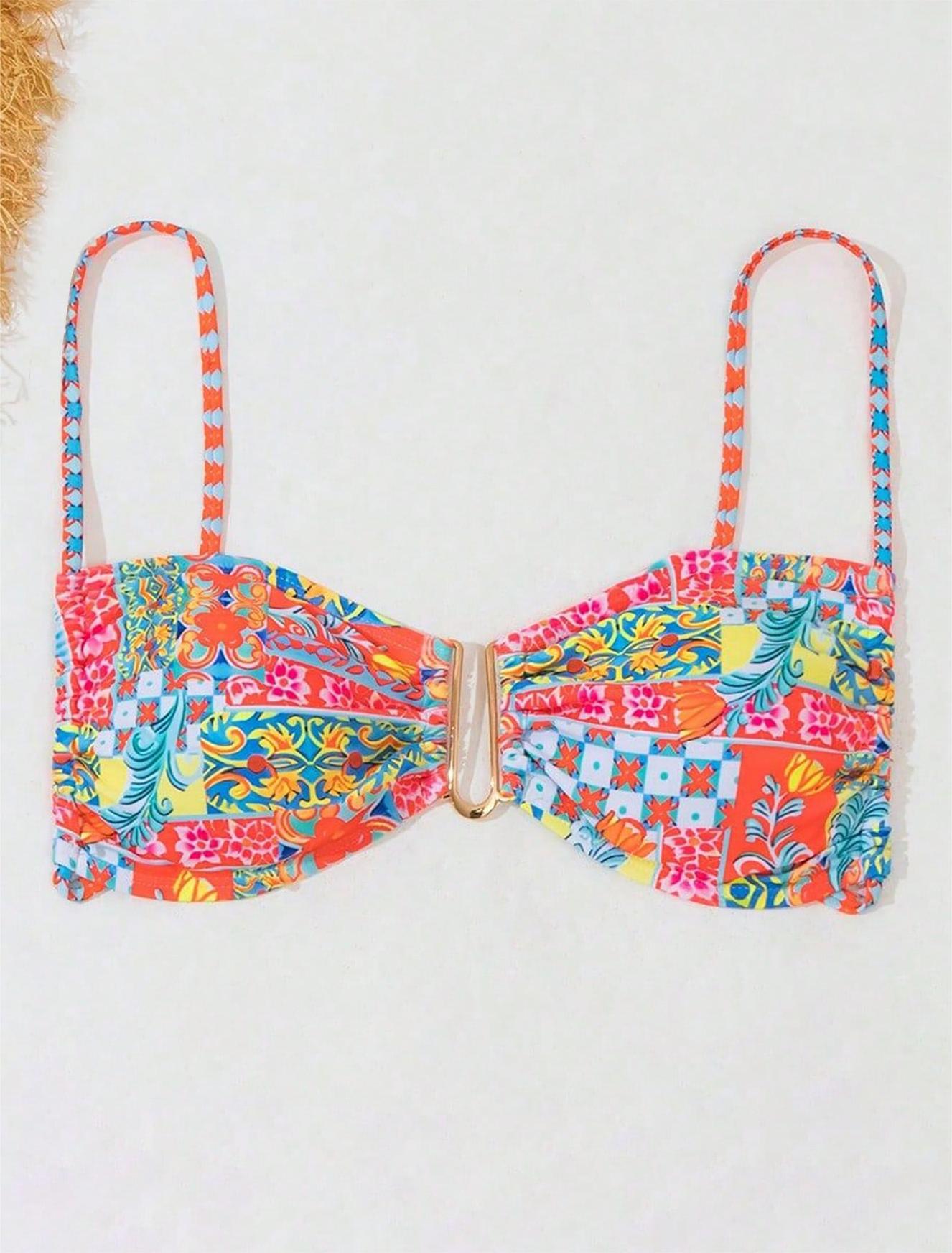 亚马逊泳装2025新款欧美印花系带高级感沙滩温泉比基尼泳衣女上衣