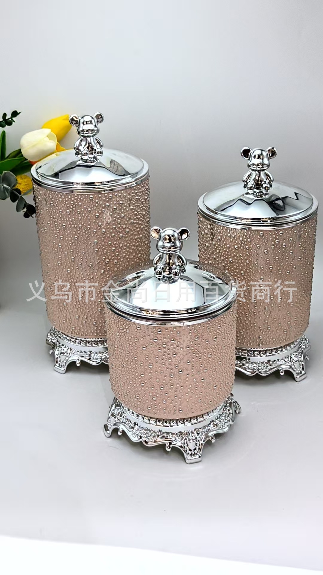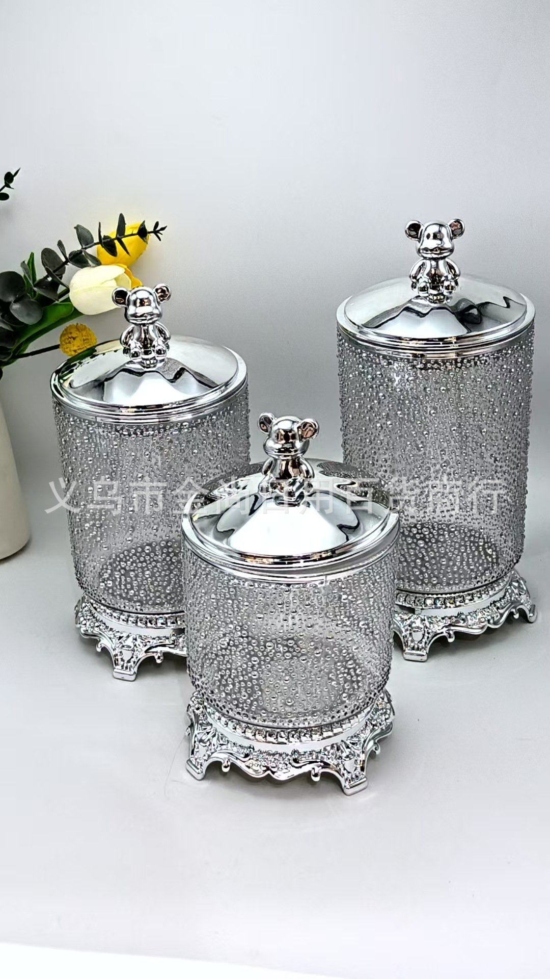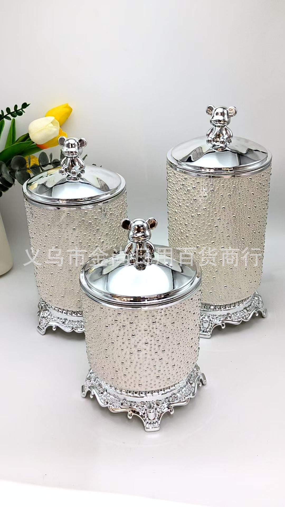小熊盖米珠圆形银边塑料储物罐厨房干粮密封罐客厅糖果罐带彩盒