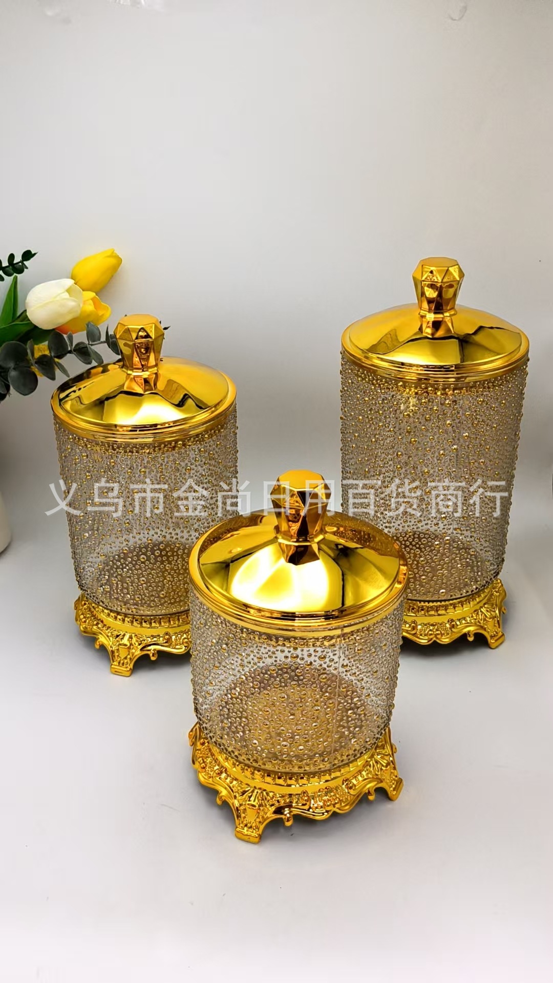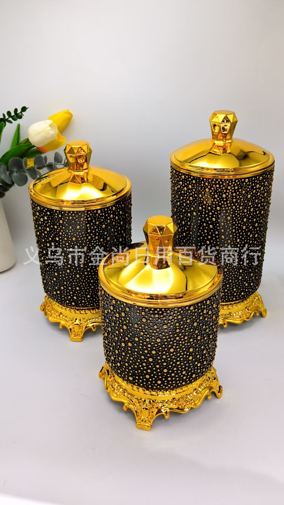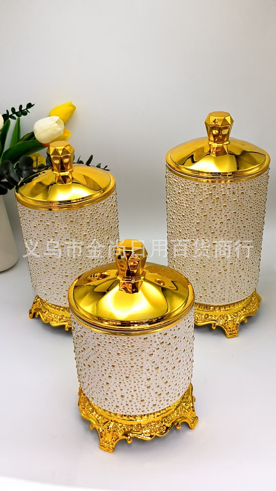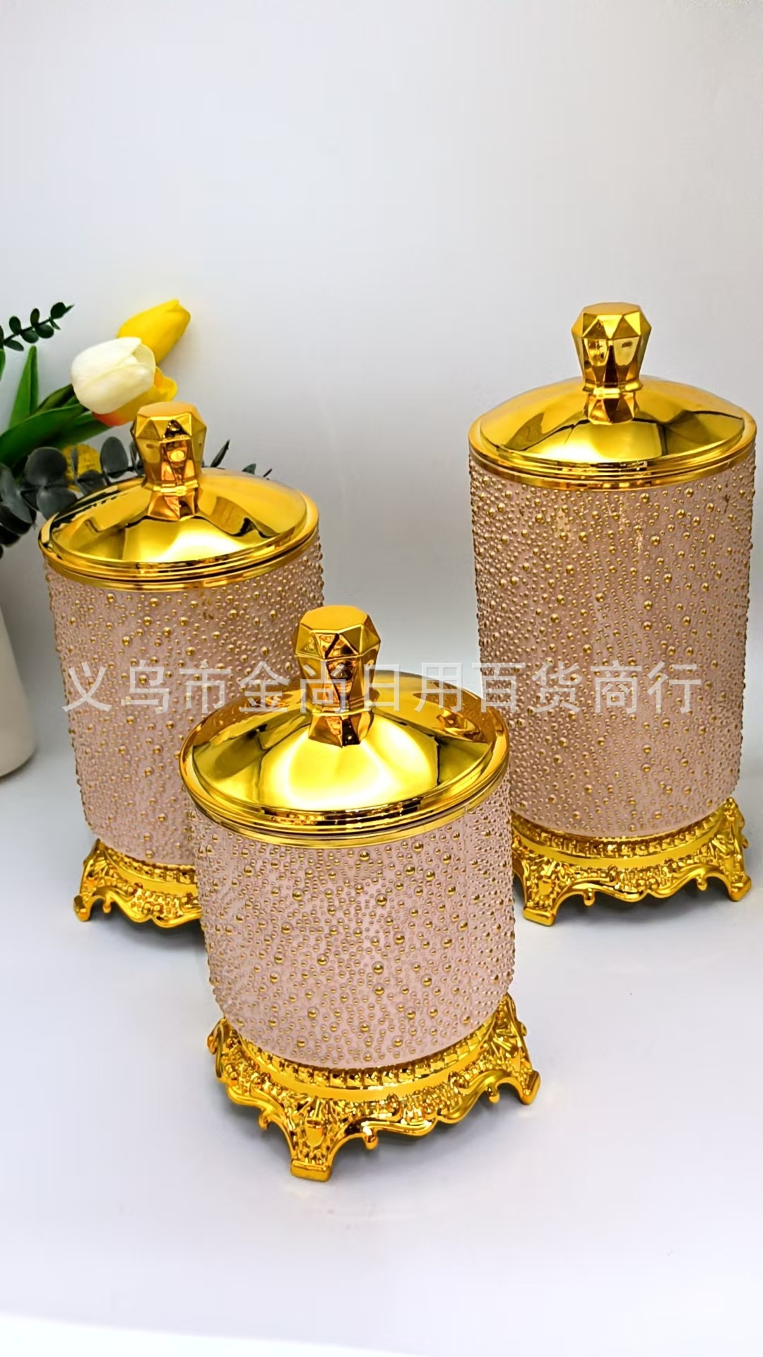 塑料砖石盖米珠金边圆形带托台储物罐五谷杂粮密封罐带彩盒