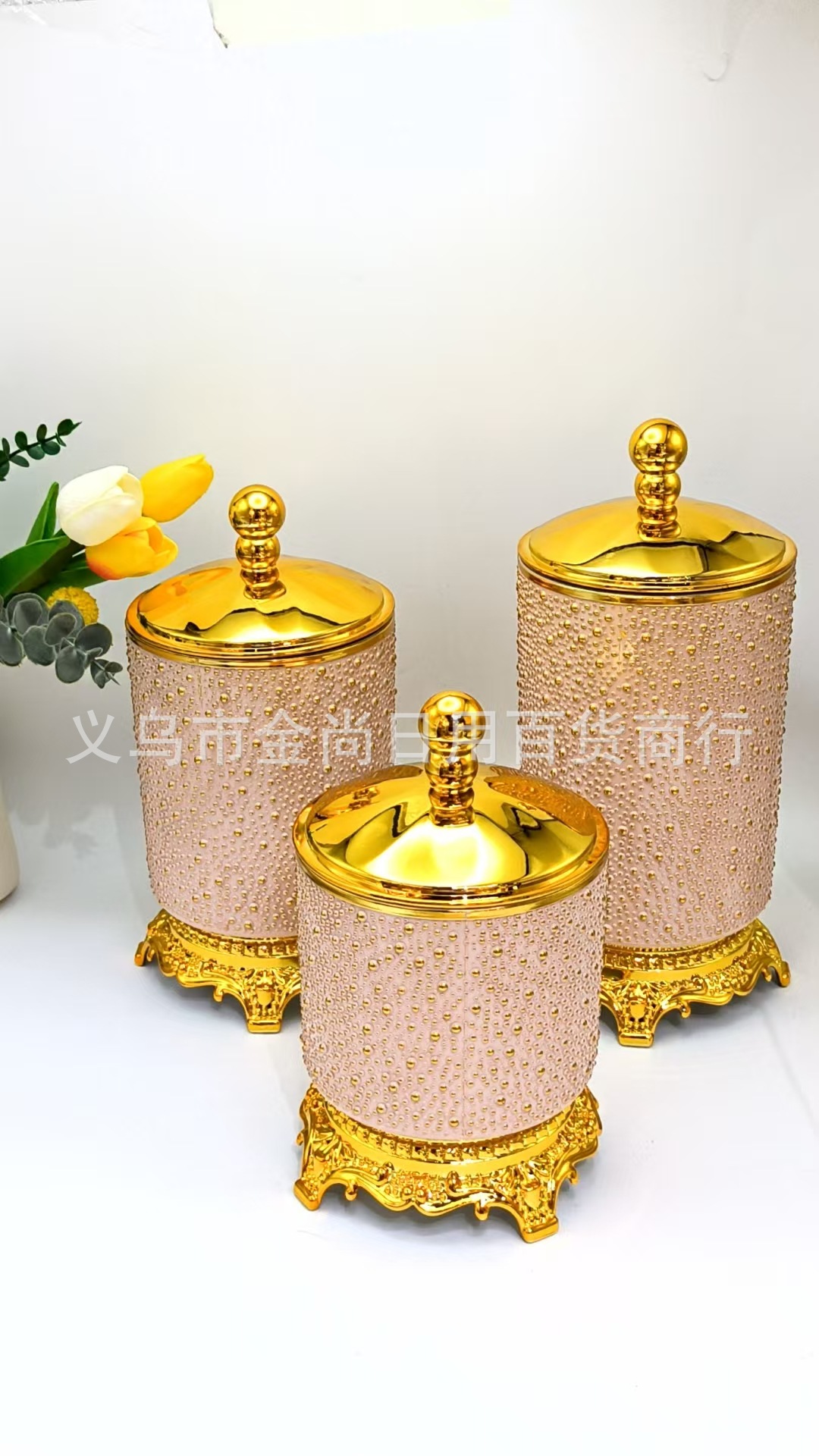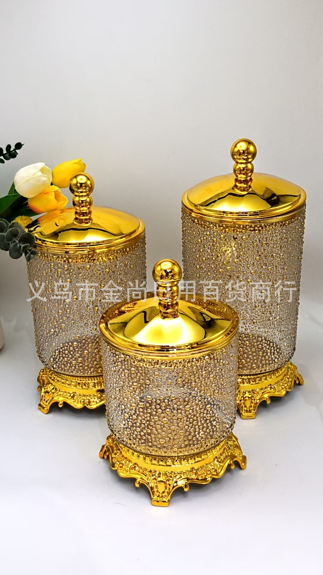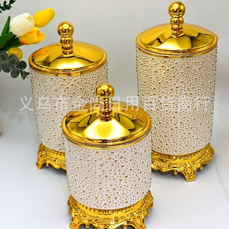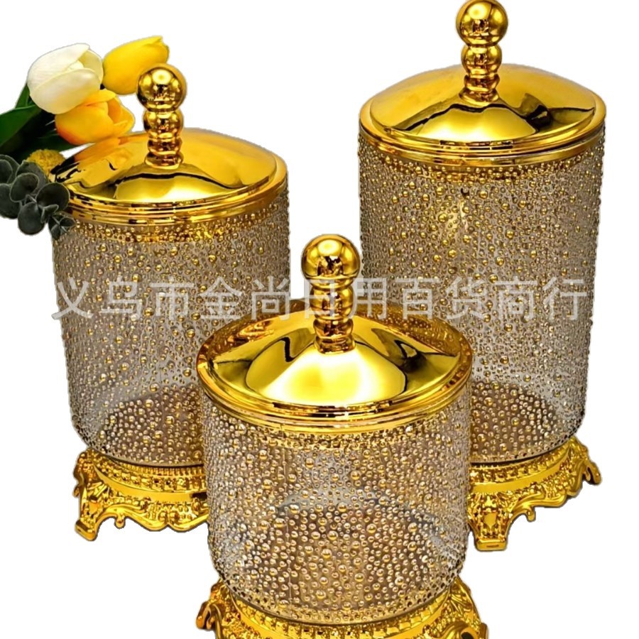 圆型珠盖米珠密封罐透明实色金边托台密封罐家用厨房储存罐带彩盒