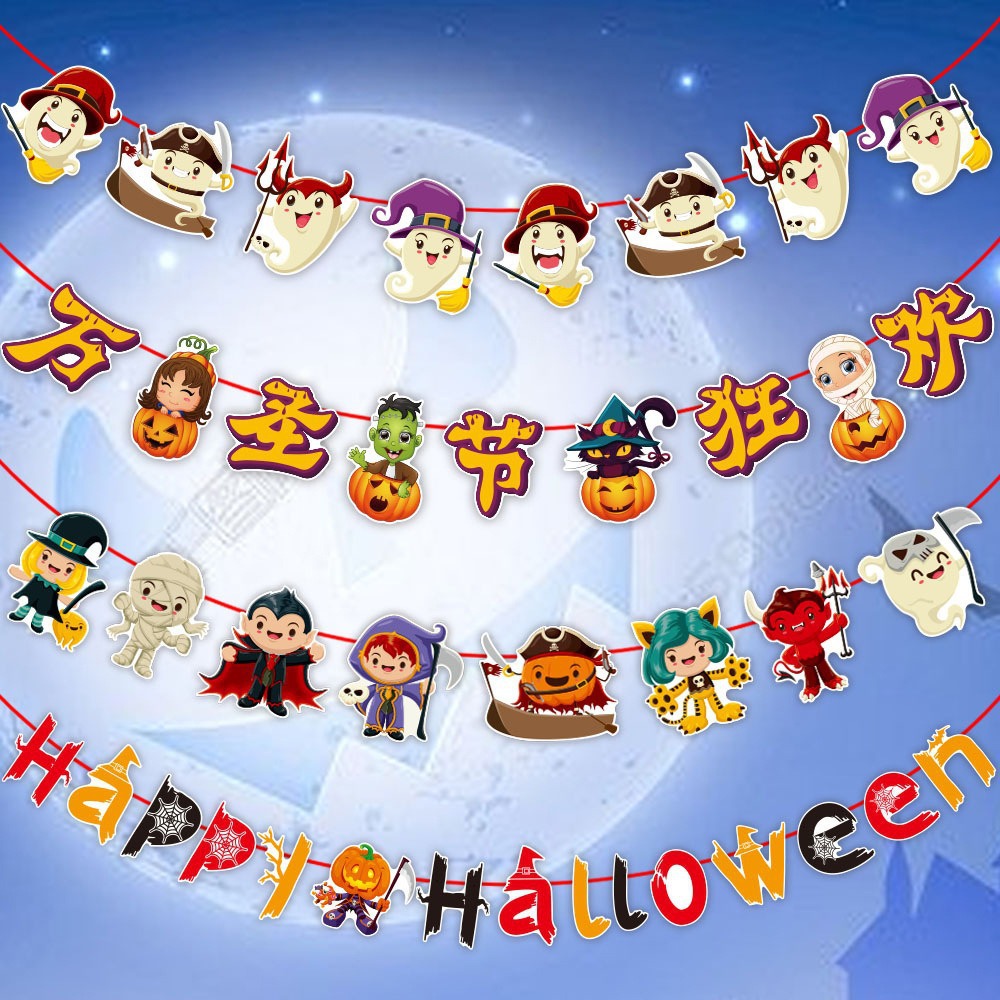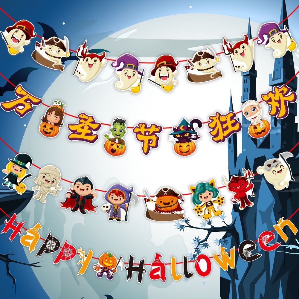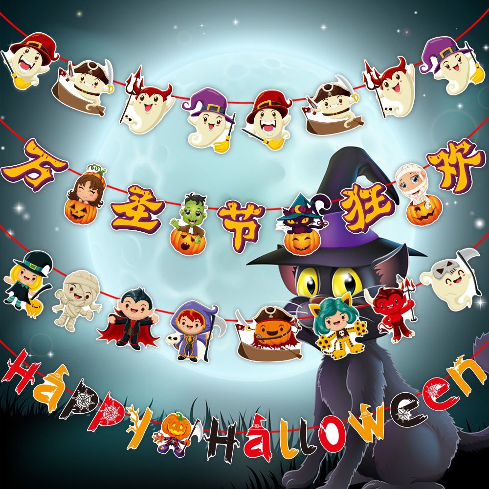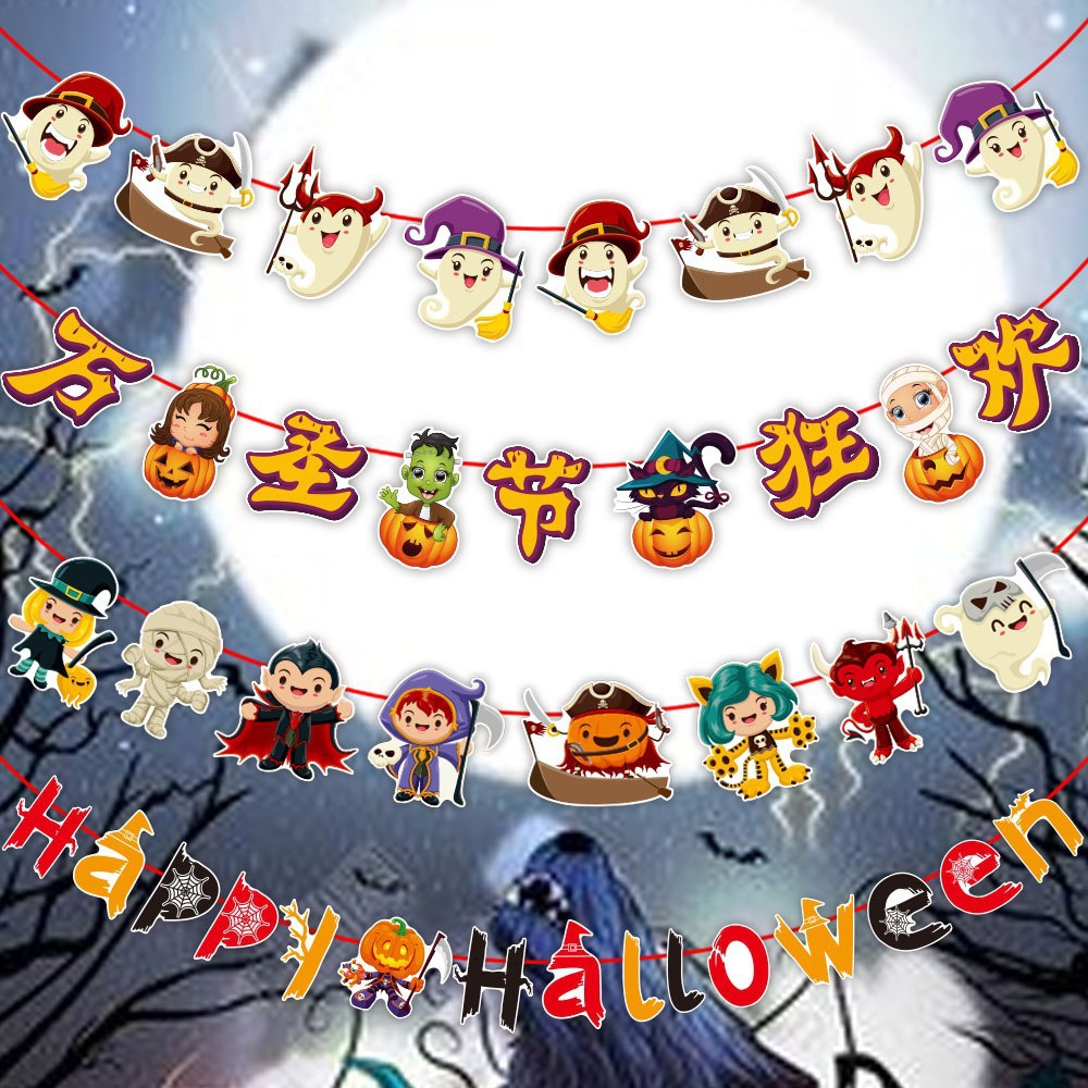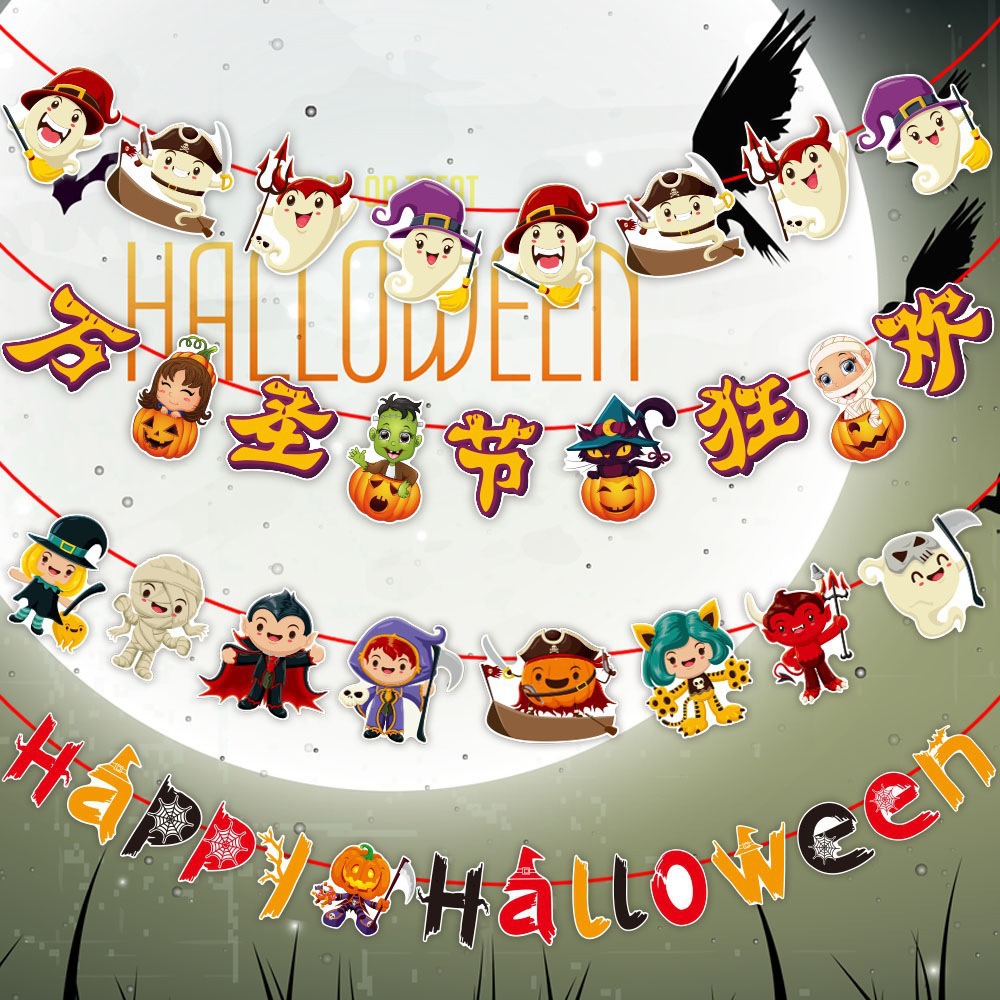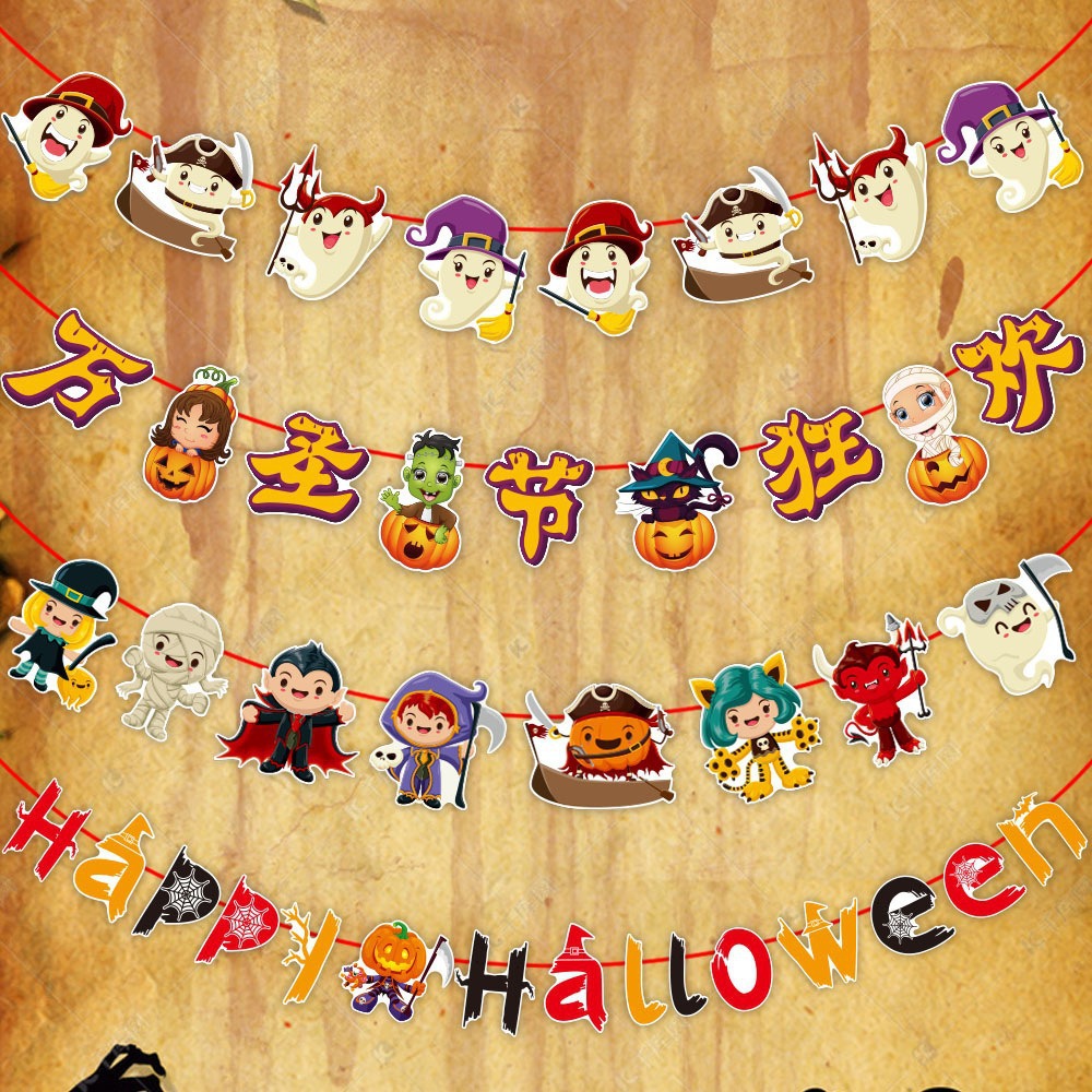 万圣节装饰卡通拉旗横幅派对场景布置南瓜幽灵纸质三角旗字母彩旗